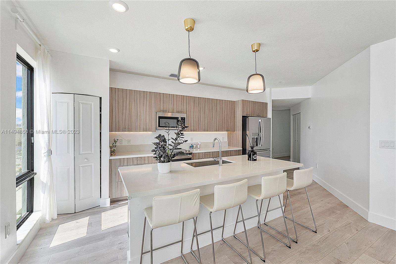 Modern contemporary luxury condo with natural light awaits you in this 3 bedrooms, 2 bath corner unit. This popular ME floor plan is rarely available. Private entry, grand foyer, double balcony with water views. Gourmet Kitchen with modern cabinets, quartz countertops, island, S/S appliances upgraded with GE Profile 4 door French refrigerator and GE Power Steam Washer & Dryer. New Pergo “Extreme Wood” throughout. Spacious bathrooms modern floating vanities. Large impact windows and doors. Grand Clubhouse with Resort Style Pool, Fitness Center, Splash Park, Indoor Running Track, Basketball Courts, Ballroom and more! Located in the exclusive master-planned community of Urbana by Lennar, walking distance to Downtown Doral where you will find fine dining, shopping and recreational activities.