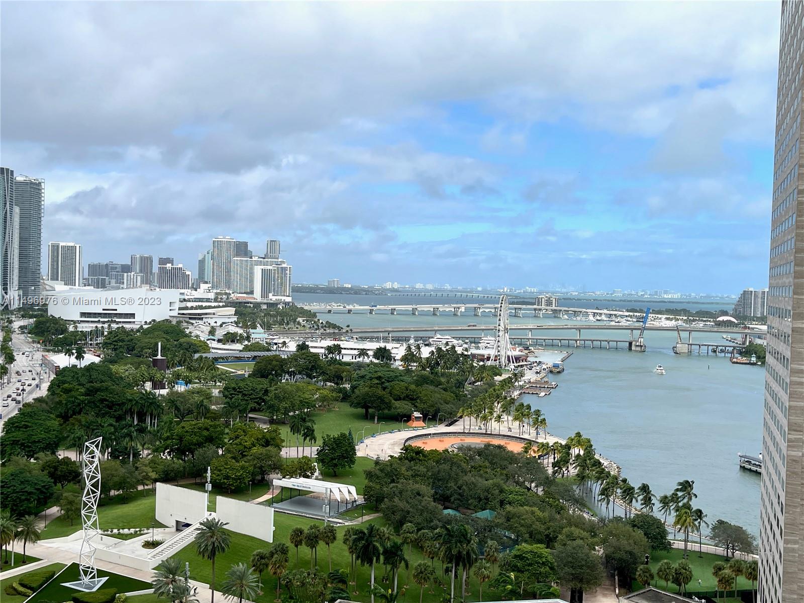 Unit with wood floors, European kitchen, granite counters, S/S appliances, washer/dryer, and freshly painted. Beautiful views of the bay, bayfront park, and bridges from the 22nd Flr. Direct access from the Miami Riverwalk Promenade to Bayside Marketplace. Building amenities are two pools, a jacuzzi, 2 gyms, 2 party rooms, a sauna, a kid's room, a business center, and EV charging. Enjoy the finest restaurants, entertainment, and shopping while living in the best location downtown.