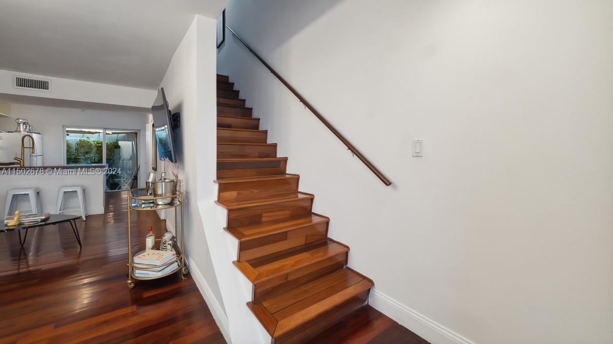 Experience South Beach living at its best in this solidly built two story 2 bedroom town house featuring 2 mosaic tiles bathrooms, a desirable private patio, beautiful Brazilian cherry wood floors throughout, open kitchen with cooking island, balcony, closets with built-in's throughout, impact windows and impact doors, washer and dryer. Excellent location walking distance to the beach, restaurants, shops and one block to Flamingo Park. Parking for 1 car and guest parking available.