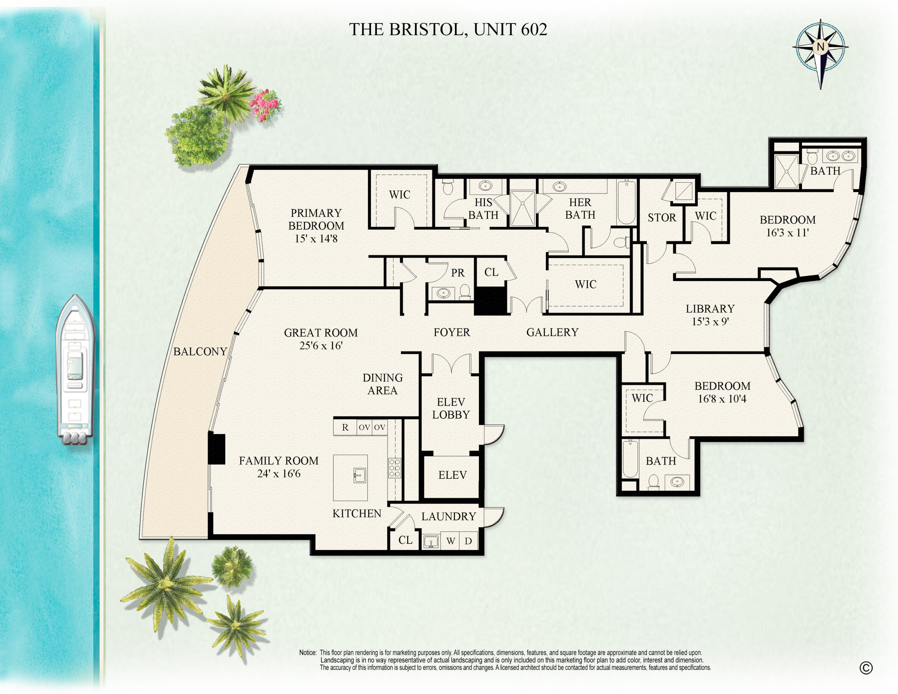 Welcome to The Bristol 602, the epitome of South Florida luxury living overlooking the beautiful Intracoastal waterway and Palm Beach Island. Boasting 4308 total square feet of living space, high ceilings throughout, 3BRs + den, and 3.5BA's, this pristine, turn-key unit is ready for to move into and immediately enjoy. Featuring cabinetry by Sneidero, calacatta and white diamond marble floors throughout, and Gaggenau appliances in the kitchen, this like-new residence offers stunning vistas of the water, the island, and downtown West Palm Beach at every turn.