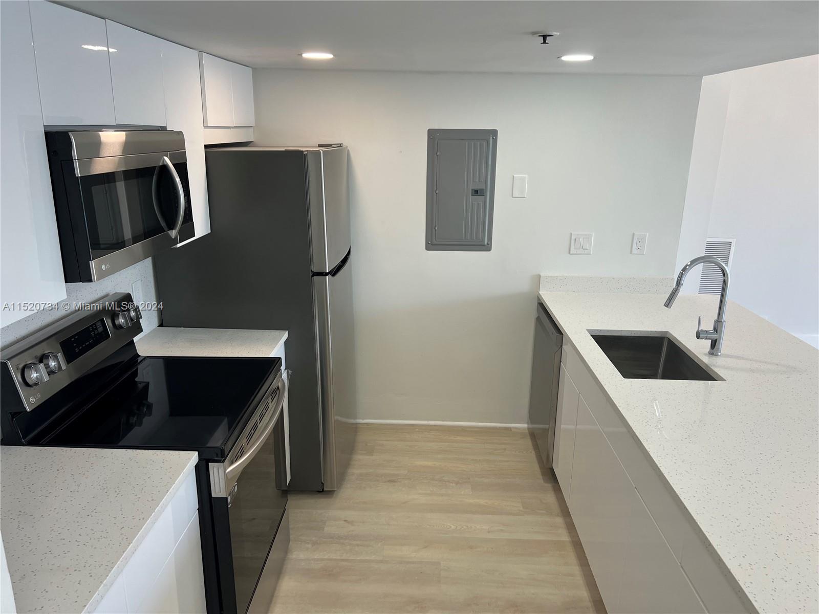 Beautifully remodeled 2bed/2bath unit with water views overlooking renovated swimming pool & tropical terrace area. All work was done with permits. New modern kitchen, bathrooms, flooring & lighting. Open split floor plan. Extra-large balcony. New A/C installed in 2024. One deeded covered garage parking spot. Additional parking can be purchased or leased. Security and management on site. Tenant in place until October 31, 2024. Current tenant pays $2,900/monthly. No Special Assessments. Management also says they have enough reserves to cover upcoming cost for 40 yr. recertification