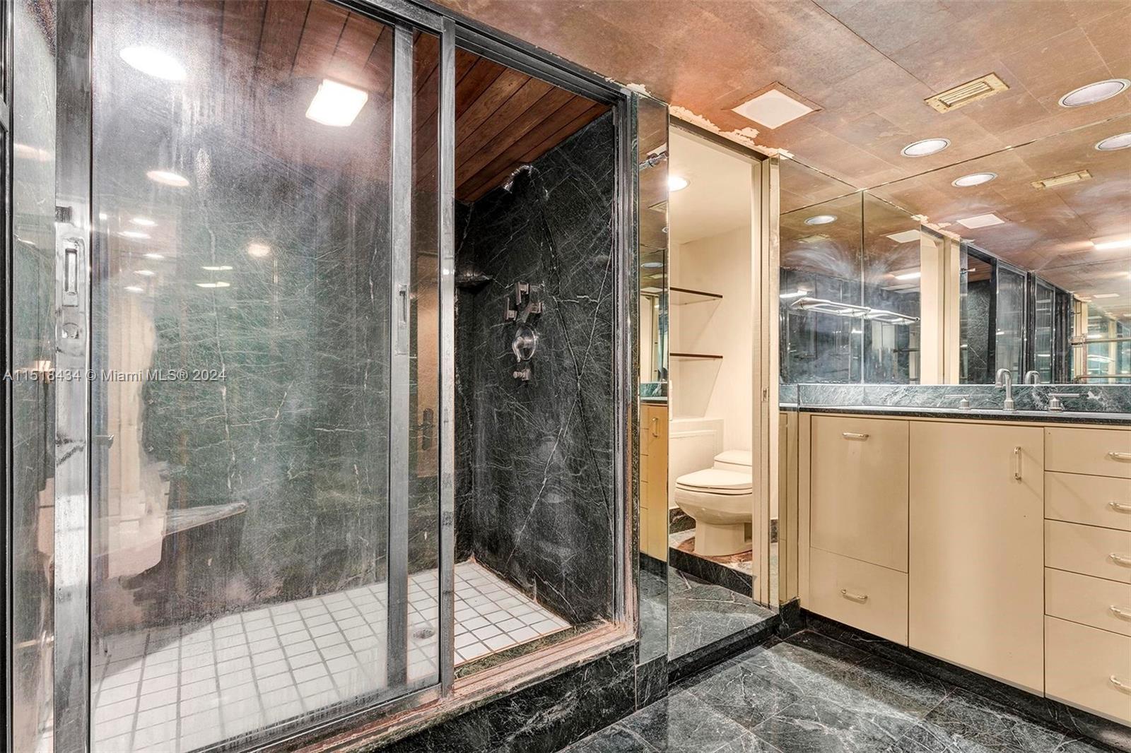 Located directly on Biscayne Bay with spectacular water and evening skyline views from all rooms. Centrally located near Bal Harbor, Aventura and Lincoln Road. Walking distance to grocery stores, restaurants and shops. Great opportunity to make this grand residence your own. Currently appointed with 1 extra large master bedroom with cedar-lined built-in closets, 2 separate his and hers master bathrooms with oversized spa tub, steam shower, heated towel racks, rain shower, bidet/water closet. Plenty of built-in storage for linens and accessories. Powder room with additional built-in storage. Built-in wine storage closet in bar area of the open living room. Building has concierge service and is dog-friendly and rent-friendly. Newly renovated, modern reception area. Swimming Pool.