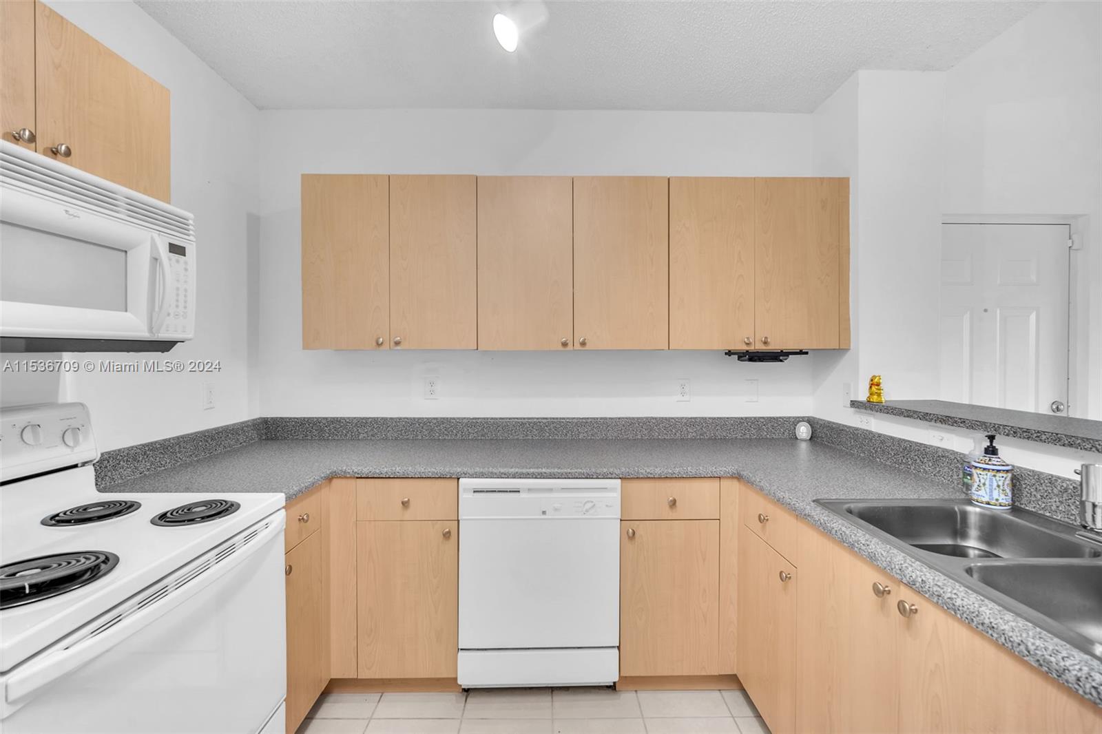 Cozy 1 Bed 1 Bath corner apartment in the heart of Miramar. Has open living/dining that's attractively tiled with wood laminate & finished with white blinds & freshly painted walls. Room has a lighted ceiling fan for added comfort & relaxing tree shaded balcony with hurricane shutters handy. Kitchen has laminate counters, light wood cabinets & convenient shelved pantry. Appliances are white Whirlpool (functioning but not new) & the basin has Brita water filter installed. Bathroom is white throughout with full length wall mirror. Your bedroom has large (entire wall) closet with impressive custom cabinets installed & a ceiling fan as well. Unit is located near to lots of shops, restaurants, services and the I75. Amenities include a pool & gym for health & relaxation. Suitable for investors.
