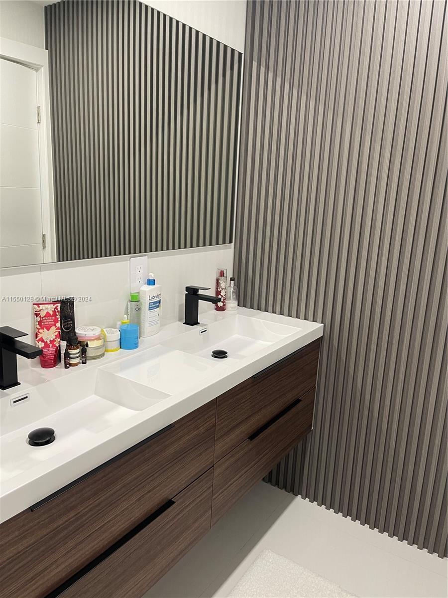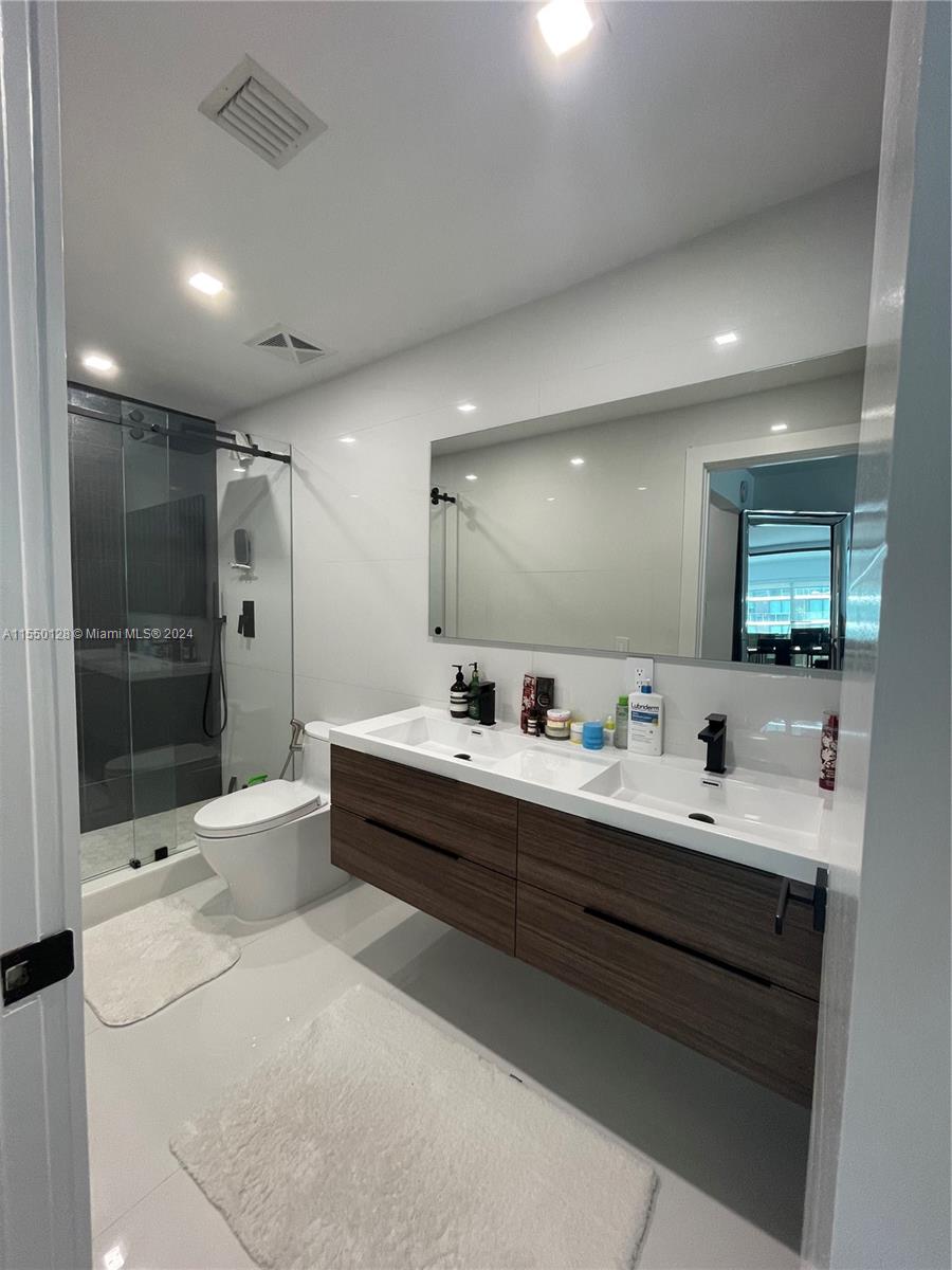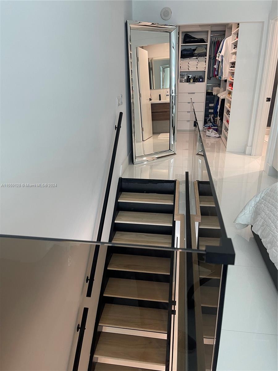 Unique apartment totally remodeled from ceiling to floors just recently. All rooms knocked down and redone with quality materials and good taste. White ceramic tiles and new top of the line appliances, large brand new washer and dryer. Stair case was redone with smoke glass handheld and same smoke glass all around master bedroom which was extended for better size. Master bathroom was completely redone with stone wall and rain shower. All curtains and blackout are open and close with remote control. Best purchase in the building for sure.