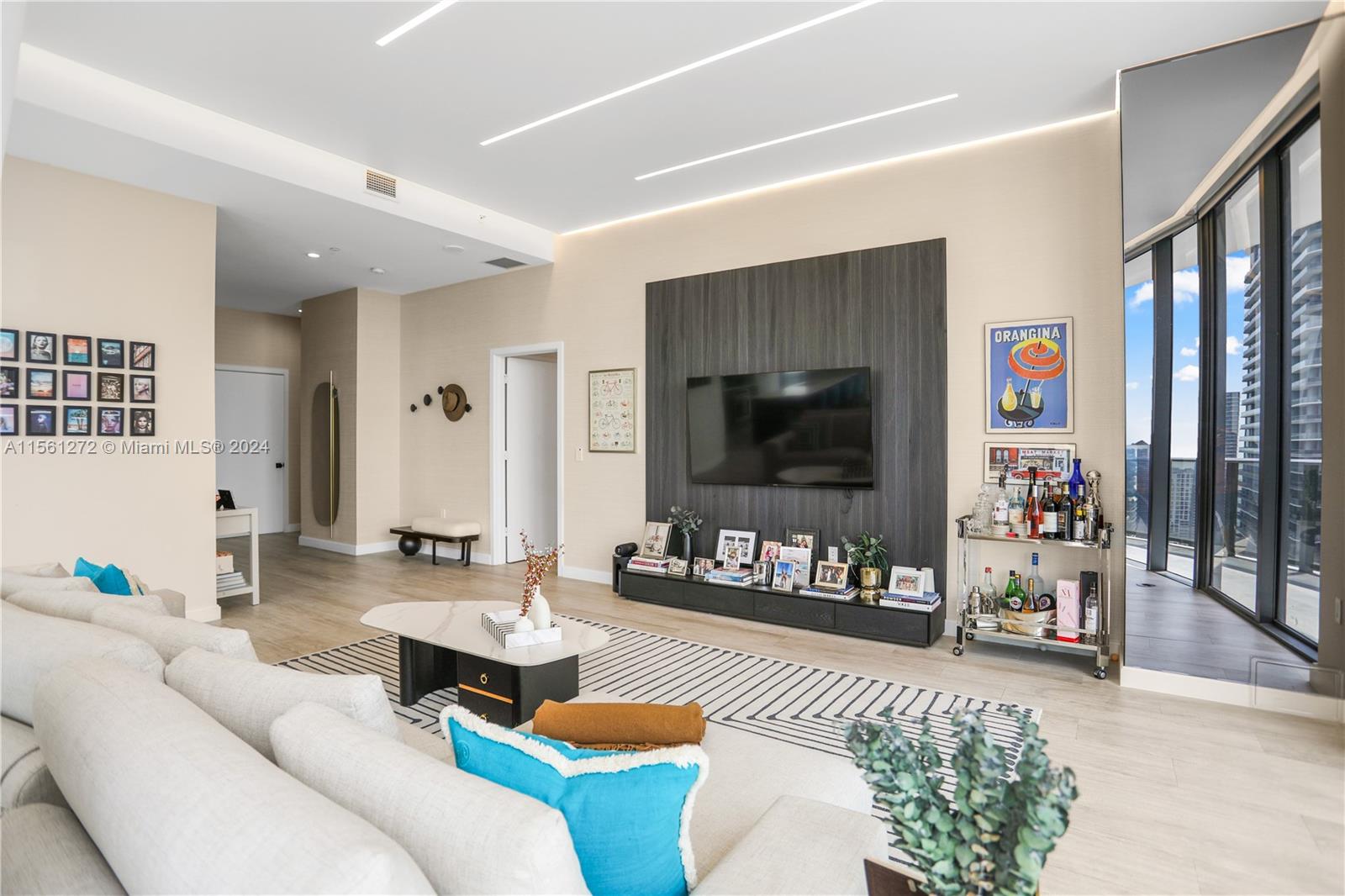 Experience luxury living in this Lower Penthouse Unit located in the heart of Brickell. Enjoy expansive views spanning from Downtown to Coconut Grove from your spacious wrap-around balcony w/ 4 points of entry. This unit boasts custom woodwork throughout, including a foyer partition, custom kitchen cabinetry, and hand-carved TV wall unit from Europe. The solid wood doors add a touch of elegance to this already stunning 2 br, 3 baths plus a den unit. Technology features include an automatic Somfy shade system throughout & custom overhead LED lighting with individual remote control dimmers for all rooms. This PH with 11ft Ceilings is different from the other 03 line units in the building. The master bedroom, guest bath, and some walls are wrapped in luxurious Goldflake wallpaper from Italy.