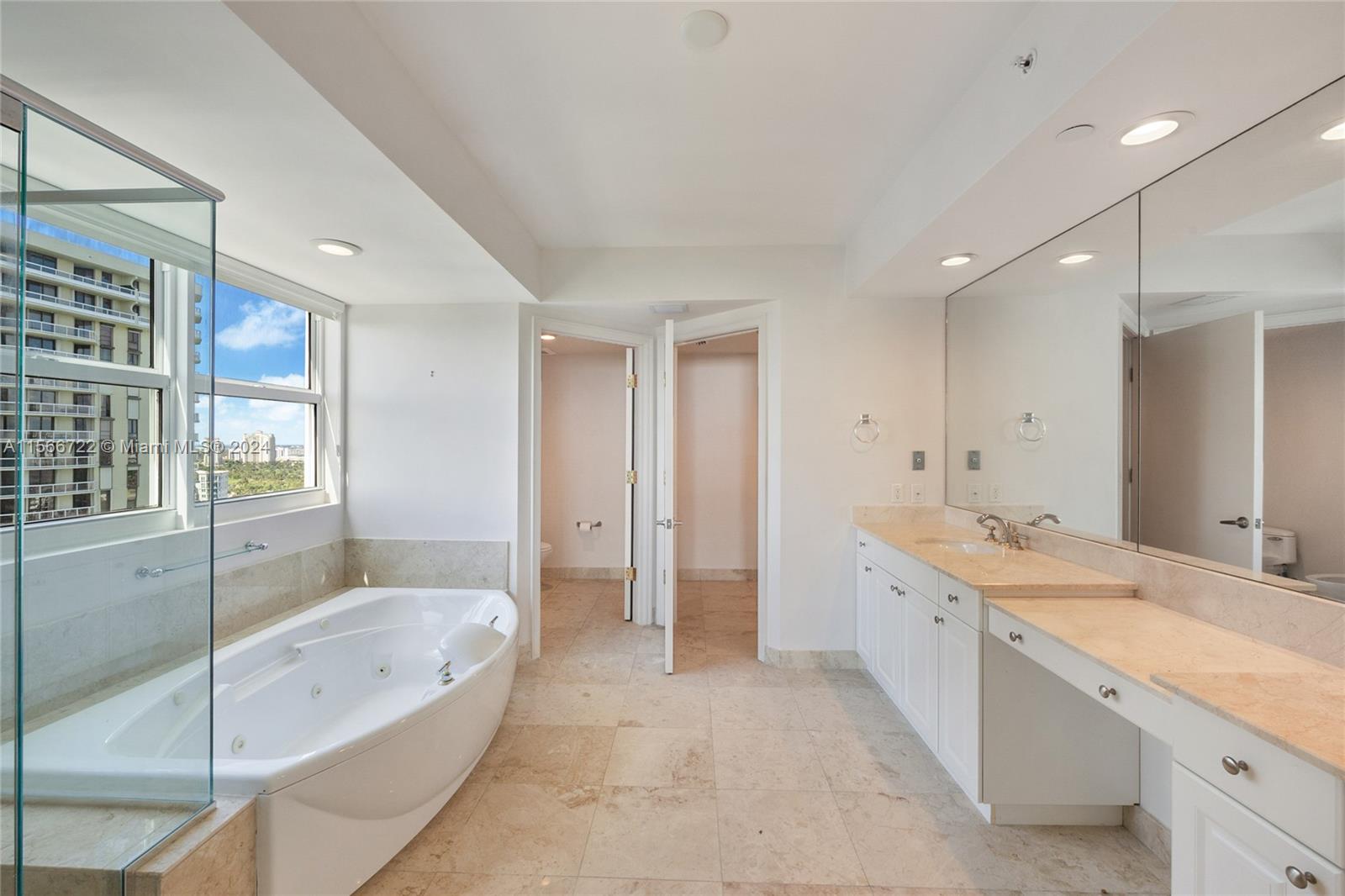 Southeast-facing corner unit at Hamptons South in Aventura. Breathtaking views of the Intracoastal, ocean, city skyline, plus golf course from sunrise to sunset. 4BR/4.5BA + media room, private elevator, separate laundry room, 3 balconies, 3 parking spaces and 1 storage. Enjoy resort-style amenities including a Beautiful Infinity Pool on Intracoastal, fitness center, Children's Play Area, Large Party Room, Gorgeous Lobby & Sitting Areas, Restaurant and more. With racquetball and tennis courts, plus proximity to Turnberry's renowned golf course and exercise trail, recreation is at your doorstep. Walk to Aventura Mall, houses of worship, and minutes to beaches, Bal Harbour, and South Beach. Mostly original, seize the opportunity to customize this home and make it your own!