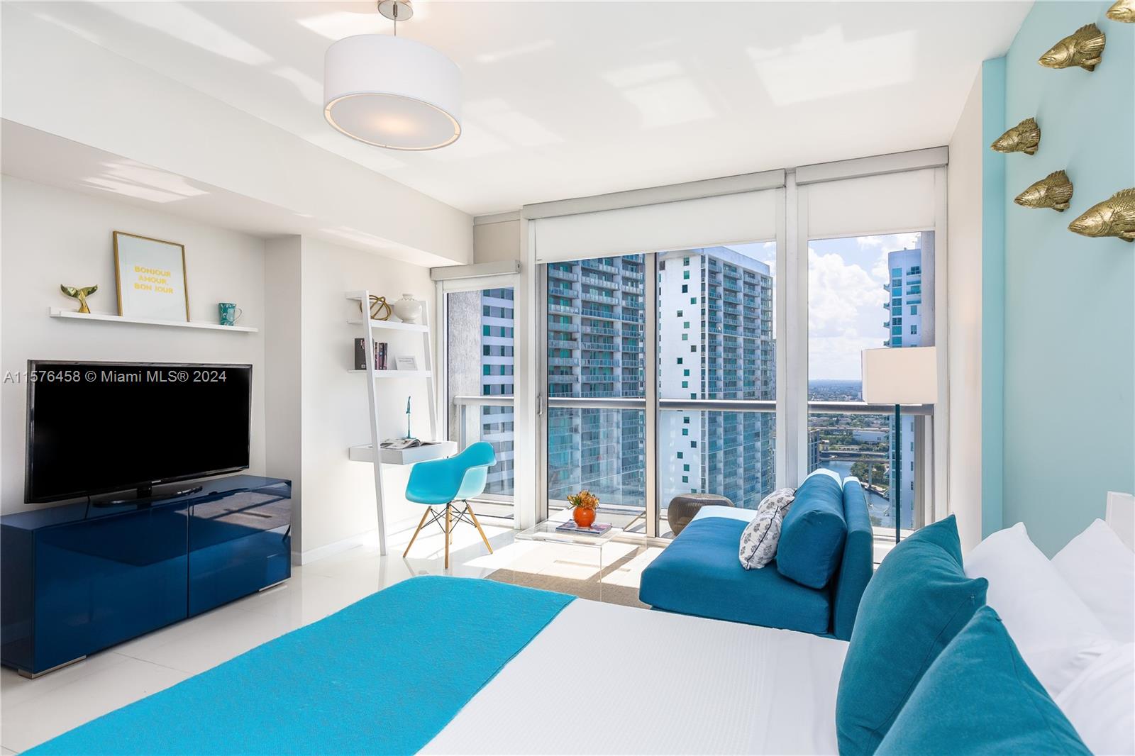 AIRBNB, no restrictions. On a high story, with floor-to-ceiling glass walls, this Icon Brickell Residence offers stunning city and river views with the bay in the background. Refined furniture and complements, and a fully equipped kitchen. It includes Bosch dishwasher, full-size washer/dryer, HD Smart LED TVs (100+ channels), plus web streaming), free fast Wi-Fi, Italian cabinets, and premium appliances by Wolf & Subzero, as well as solid marble counters. The luxurious Icon Brickell resort in Miami was designed by Philippe Starck, with dramatic views on Biscayne B
