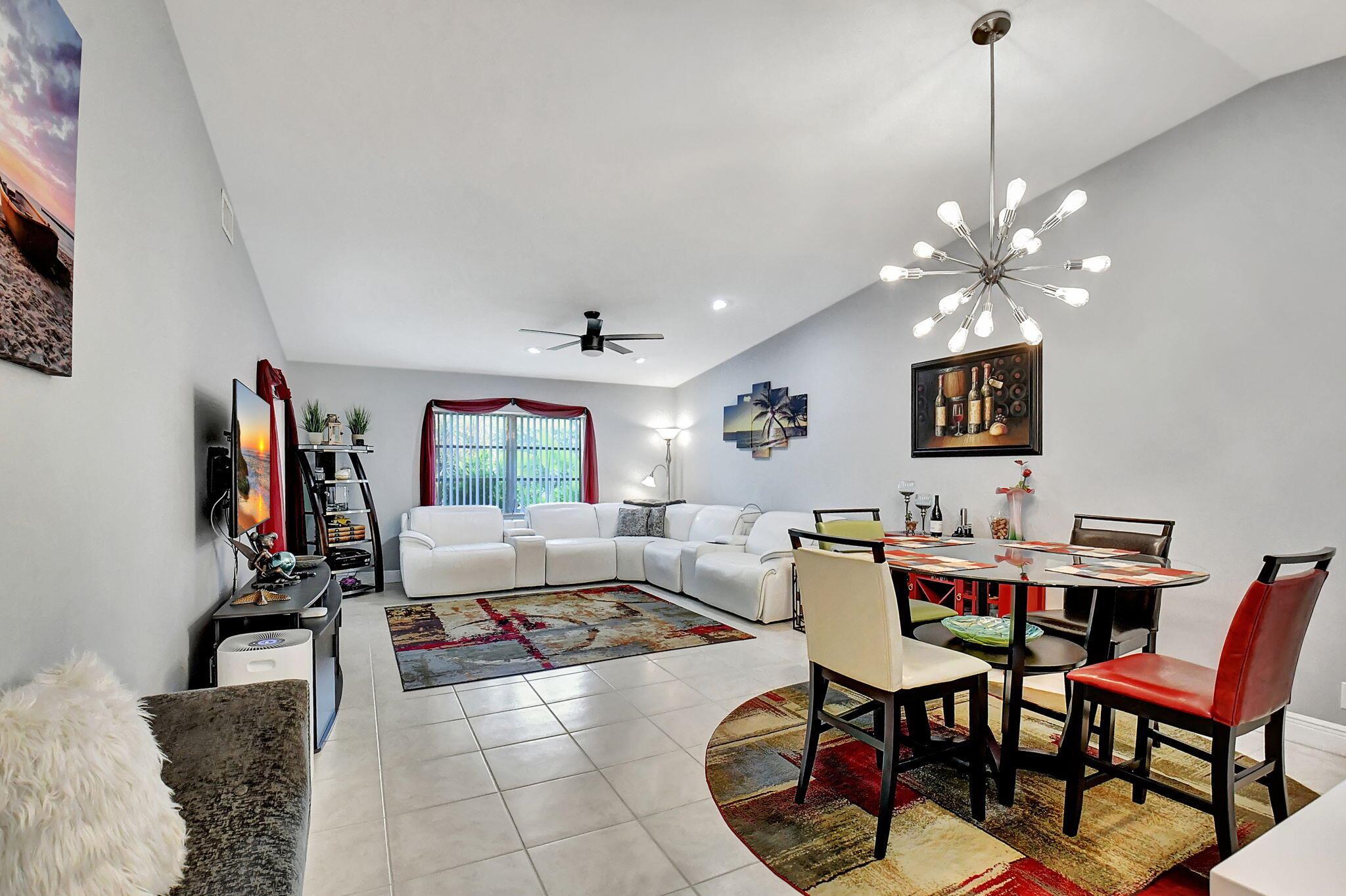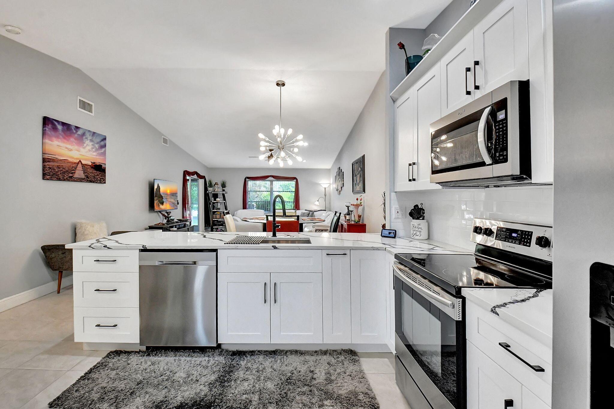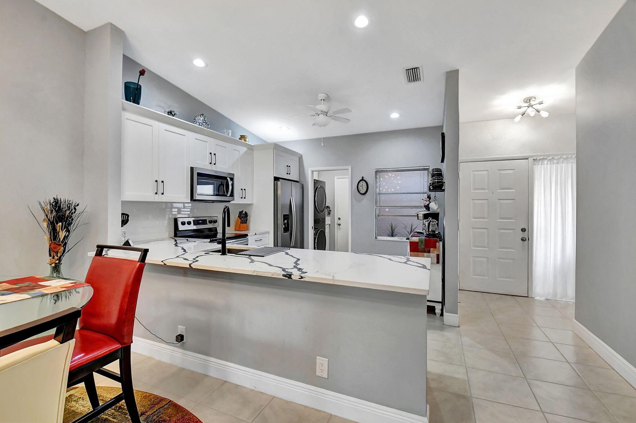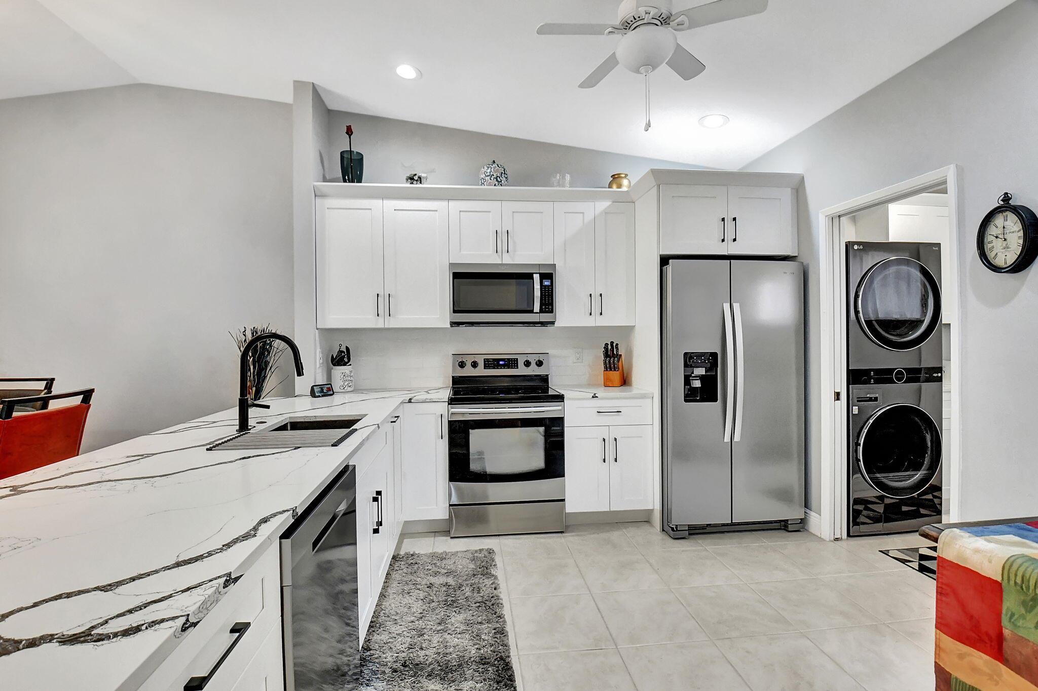 Beautiful 2/2 Chateau Villa with garage on quiet Cul De Sac. New designer kitchen with quartz countertop, SS appliances, lots of storage and open floor plan w/vaulted ceilings make it great for entertaining. Inside laundry room has a new w/d LG tower, more cabinets and counter space.The villa has tile floors throughout, LED lighting and lots of charm. The primary bedroom boasts 2 large closets and an en-suite w/double sinks & walk in shower. Both the primary and main bath have been remodeled with beautiful tile & large vanities.Enjoy the extra space in your under air Florida room or on the large outside patio.Whisper Walk is a gated 55+ community that includes club house, 5 pools, tennis & pickleball courts, putting area, fitness center, sauna, library, walking paths and 9 lakes.