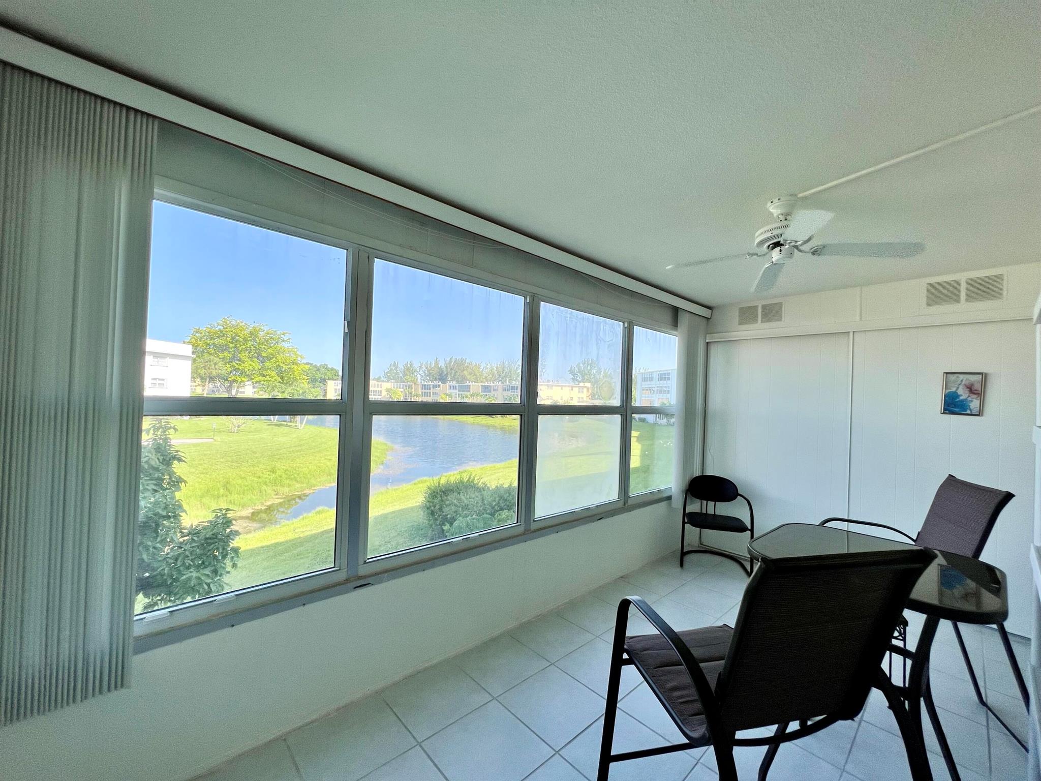 Cheerful & Bright with Pretty WATER VIEWS In 55+ Century Village! Spacious CORNER 2/2 Condo In The Luxury Wellington Section. Open Concept Living Area With Updated Open Kitchen Featuring White Cabinets, Breakfast Bar, and White Appliances. Updates to Bathrooms. Spacious Bedroom Suite With Water View, Full Ensuite Bath, and Large Walk-in Closet. Enjoy Extra Space & Pretty Views from the Enclosed Lanai. Neutral Tile Flooring Flows Throughout. Impact Windows. Wellington K is a Luxury Pet Friendly Building (1 Cat Allowed) With New Roof (2021), Reserves, Extra Storage, Elevator, Trash Chutes, and Access to the Two Wellington Section Resident Pools! Century Village Is a Resort Style 55+ Community With So Much to Offer...