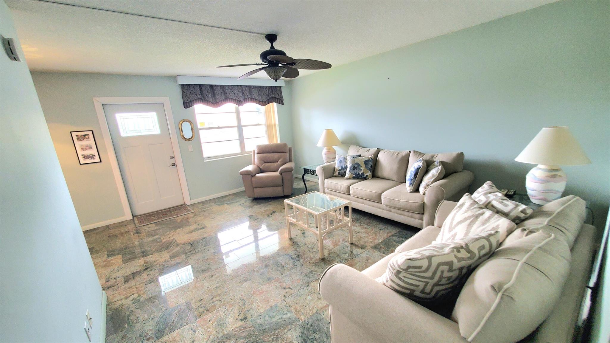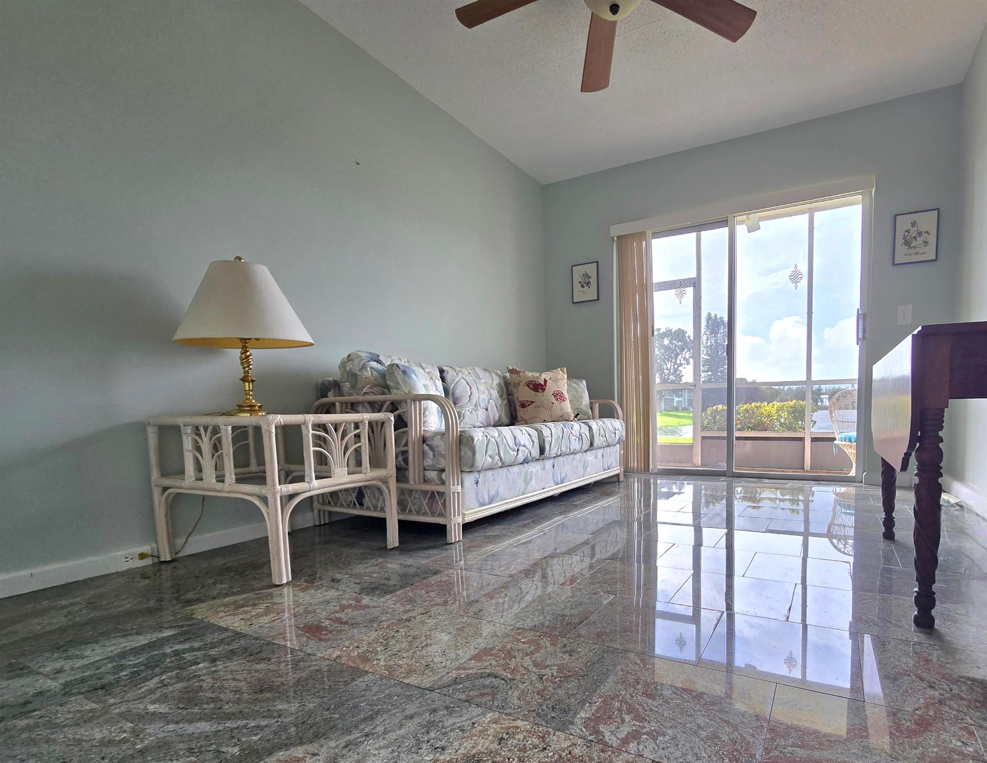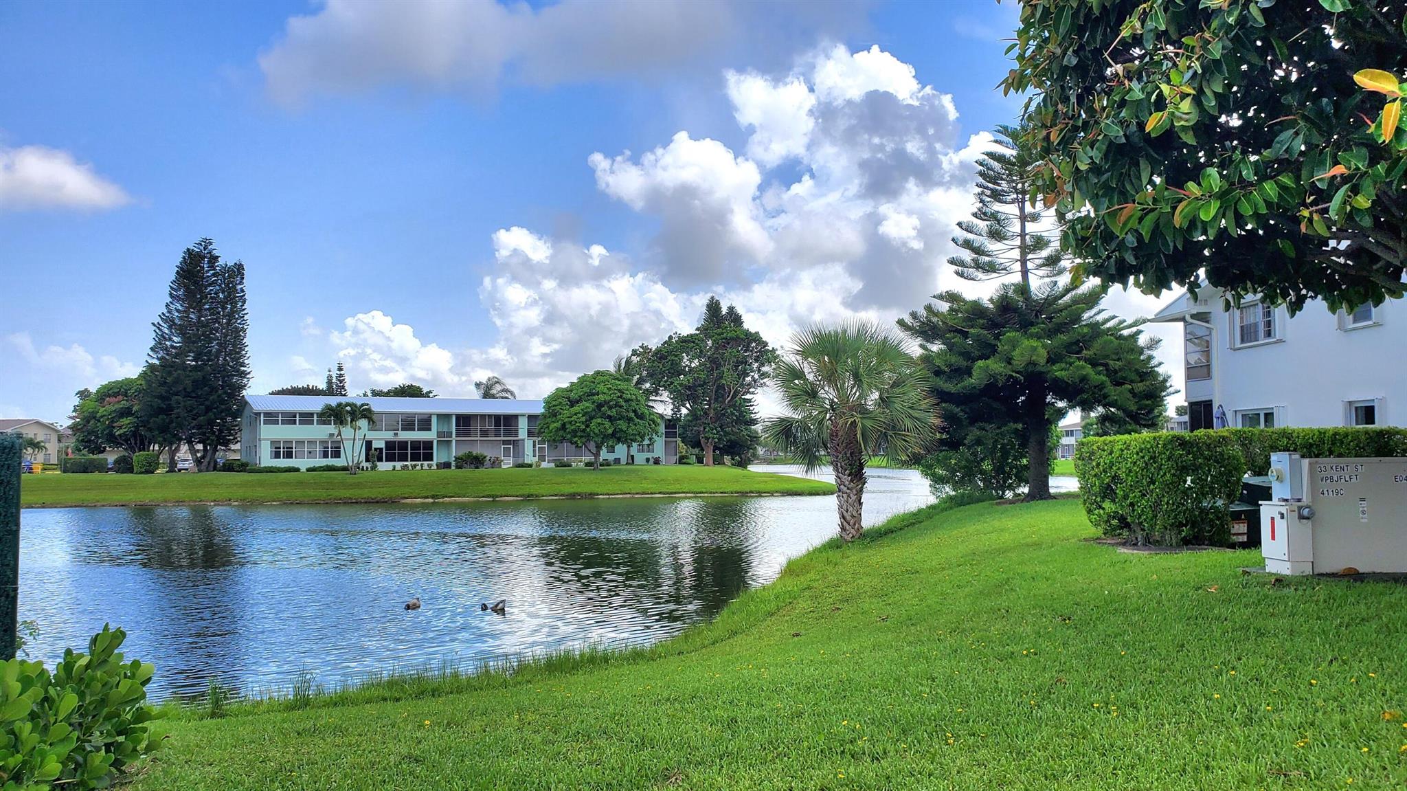 Welcome Home!! Experience stunning water views from the moment you step through the door of this inviting 2-bedroom, 1.5-bathroom condo in WPB Century Village. The unit embodies spacious living, perfect for relaxation or entertaining. Both bedrooms feature glass doors that open to the patio, providing a serene retreat with amazing water views. The kitchen is equipped with nice appliances and granite tiles counter and backsplash. Additionally, the condo is conveniently located next to the laundry room, and your parking spot is just across the front door. Nestled in a prime location, this condo offers easy access to a variety of shopping options and delightful restaurants. Whether you're seeking a peaceful abode or a vibrant community close to all the action, this condo offers it ALL!!