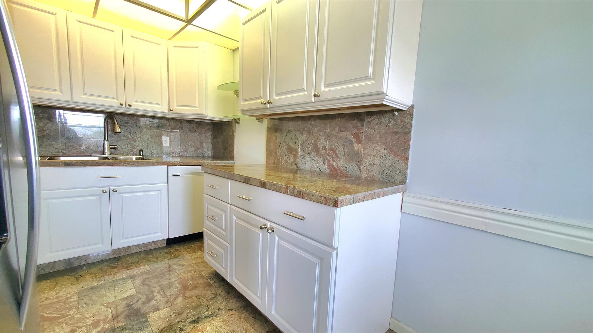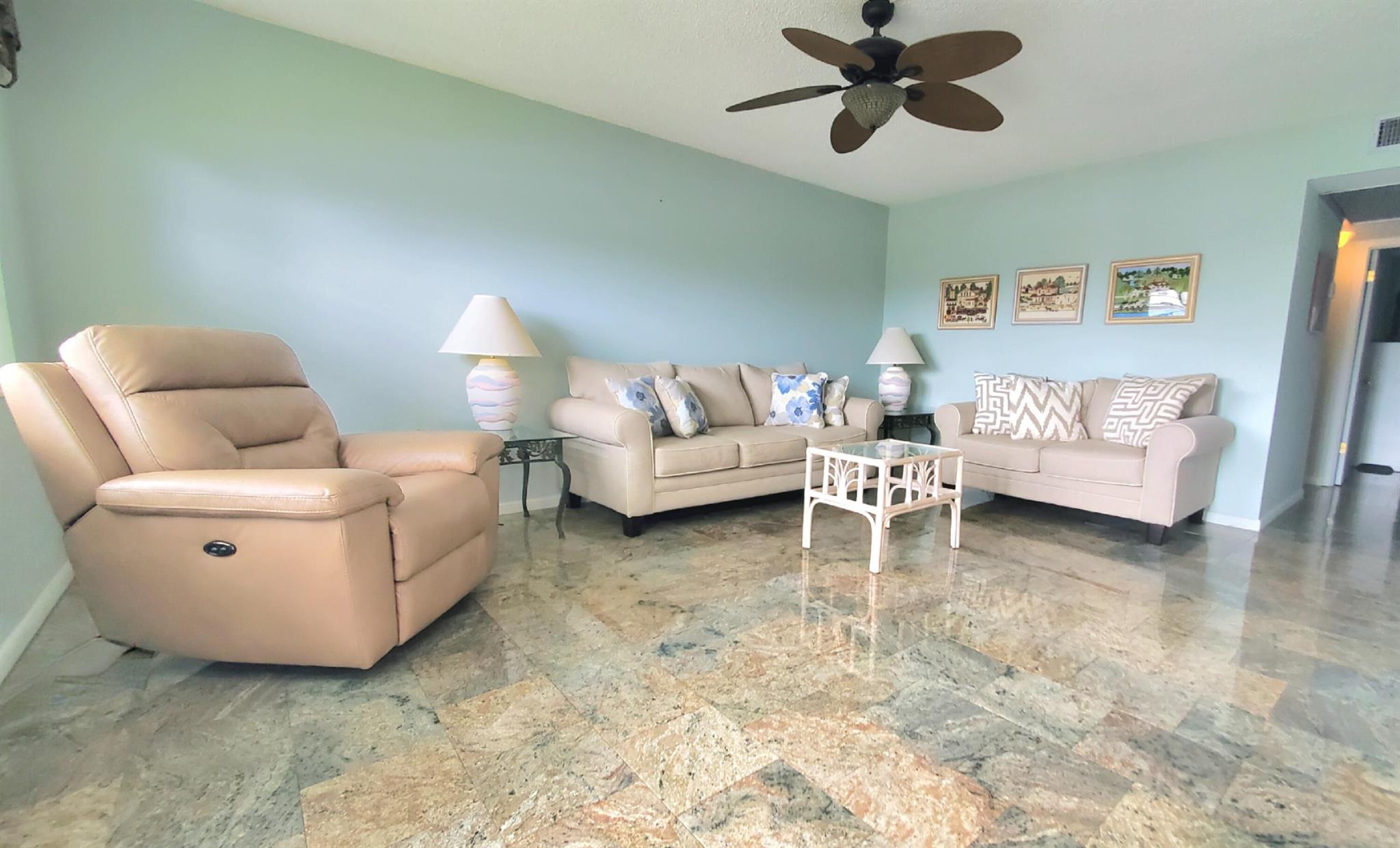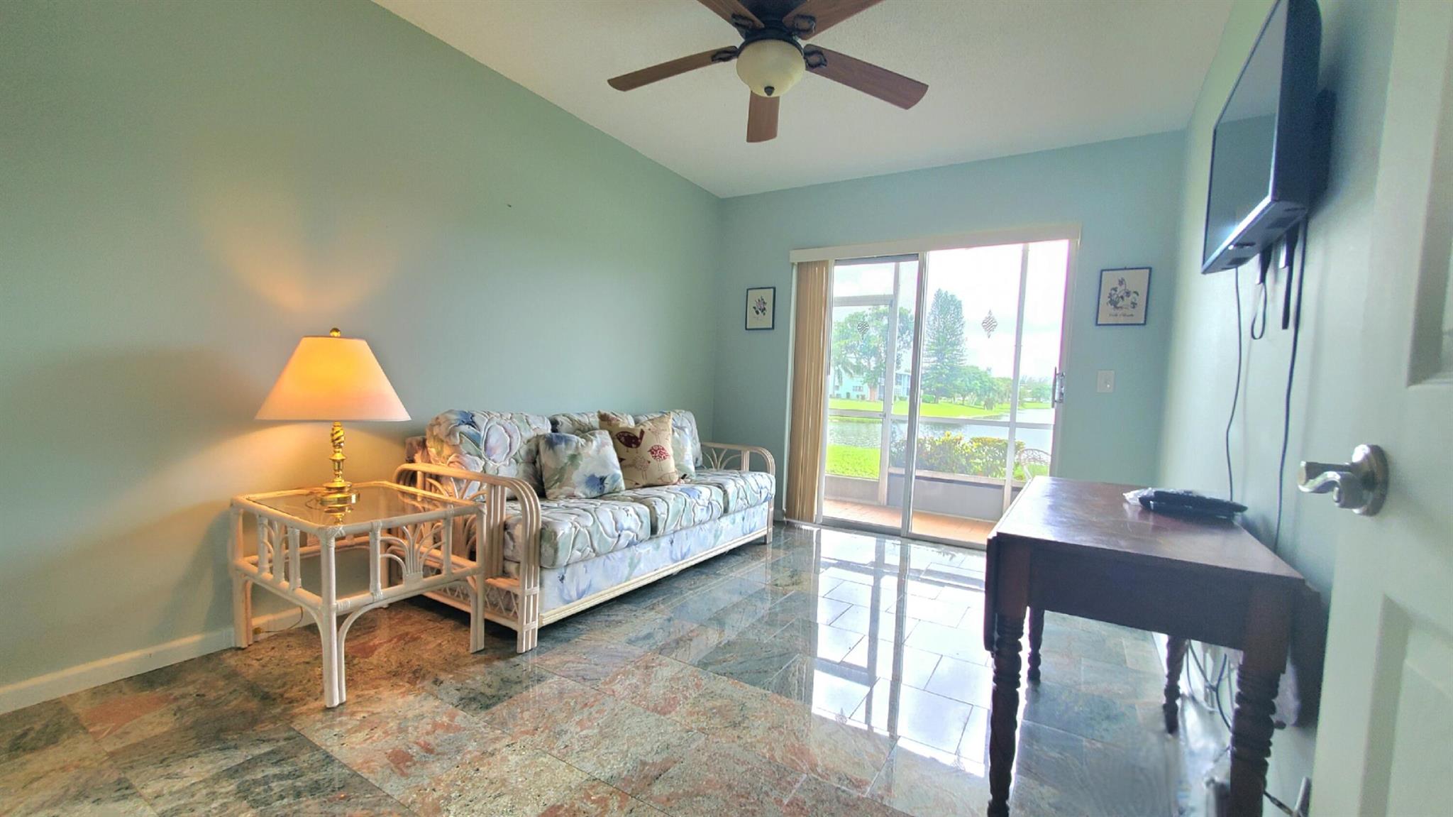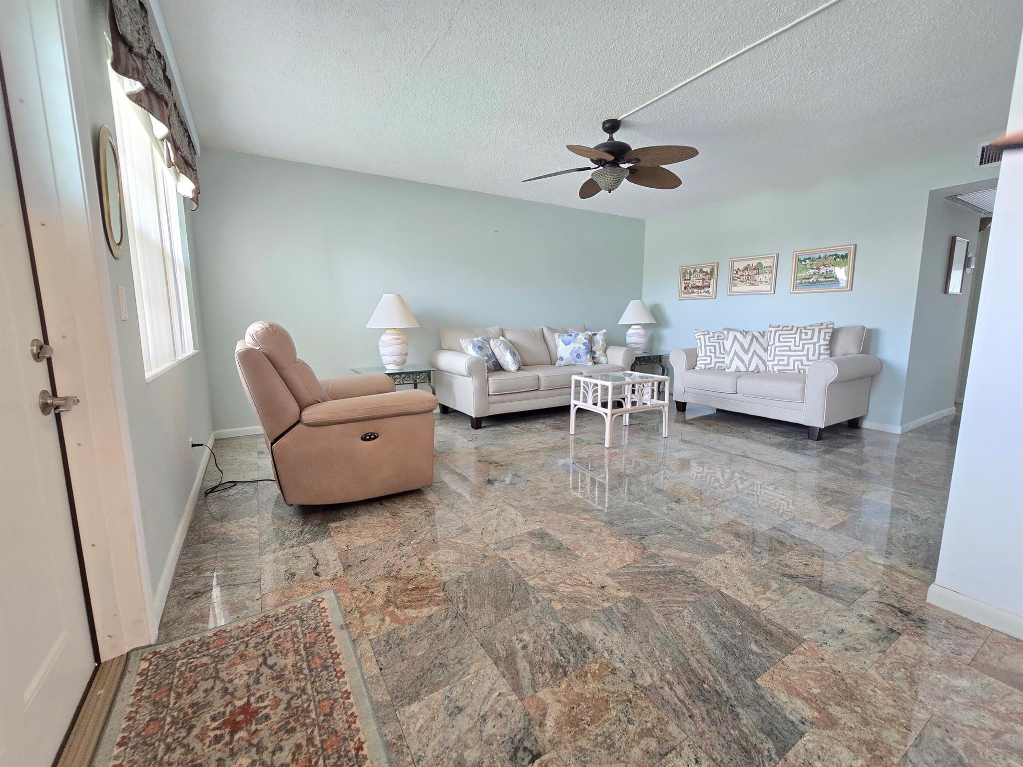 Welcome Home!! Experience stunning water views from the moment you step through the door of this inviting 2-bedroom, 1.5-bathroom condo in WPB Century Village. The unit embodies spacious living, perfect for relaxation or entertaining. Both bedrooms feature glass doors that open to the patio, providing a serene retreat with amazing water views. The kitchen is equipped with nice appliances and granite tiles counter and backsplash. Additionally, the condo is conveniently located next to the laundry room, and your parking spot is just across the front door. Nestled in a prime location, this condo offers easy access to a variety of shopping options and delightful restaurants. Whether you're seeking a peaceful abode or a vibrant community close to all the action, this condo offers it ALL!!