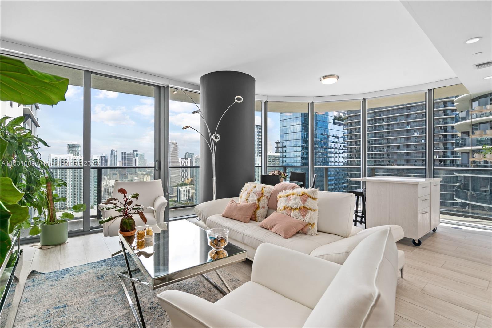 Turnkey and Move-In Ready! Enjoy a spacious and elevated perspective overlooking the scenic Brickell River and City Center. This impeccably finished residence boasts built-out closets, window treatments with blackout shades in bedrooms, a mirrored kitchen backsplash to amplify the view, a tub/shower glass enclosure, and a floating kitchen island. Modani furniture and fixtures can be included in the sale for added convenience. Additionally, a parking space conveniently awaits on the 3rd floor. Situated in the heart of the city, residents will appreciate the unparalleled location, with an Equinox gym within the complex, a rooftop pool, and just a block away from City Center mall and cinema. This unit comes fully furnished, offering a seamless transition for new homeowners.