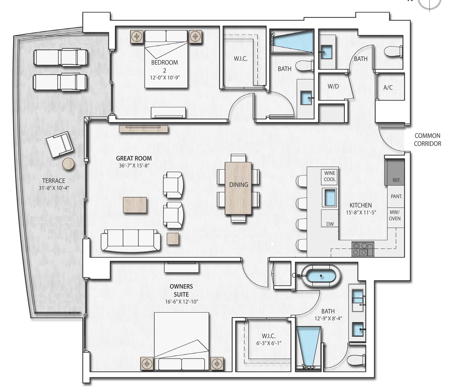 Nautilus 220 is a new luxe waterfront development under construction alongside a marina with 330 condominium residences in two, 24 story towers, a one-acre outdoor amenity deck, the SeaHawk Prime by David Burke restaurant, retail shops, a cafe and professional office suites. Everything you need in one place, resort-style living perfected. Our Penthouse 09 is beautifully appointed with 12ft ceilings and hurricane impact glass, porcelain tile throughout, full Miele Appliance package, wine cooler, waterfall quartz kitchen island and countertops with European cabinetry, split-bedroom layout, oversized owner's suite with large bathroom featuring freestanding soaking tub, and large terrace with Northeast water view.