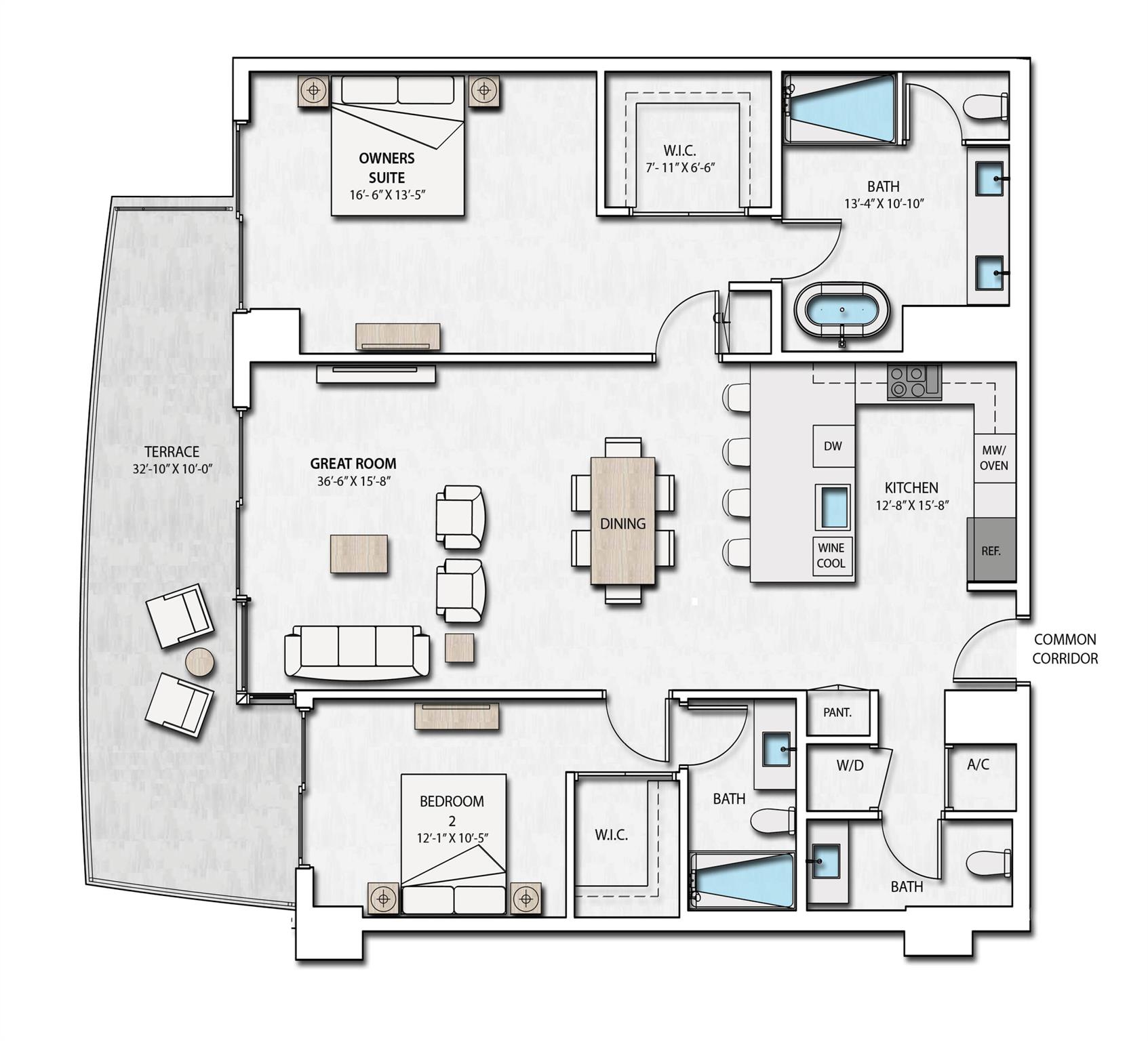 Nautilus 220 is a new luxe waterfront development under construction with closings beginning soon, alongside a marina with 330 condominium residences in two, 24 story towers, a one- acre outdoor amenity deck, the SeaHawk Prime by David Burke restaurant, retail, a cafe and office suites. Everything you need in one place, resort-style living perfected. This unique floorplan is beautifully appointed with 10ft ceilings and hurricane impact glass, porcelain tile throughout, full Miele Appliance package, wine & beverage cooler, waterfall quartz kitchen island and countertops with European cabinetry, split-bedroom layout, oversized owner's suite with large bathroom featuring freestanding soaking tub, and large terrace with Northeast water views.