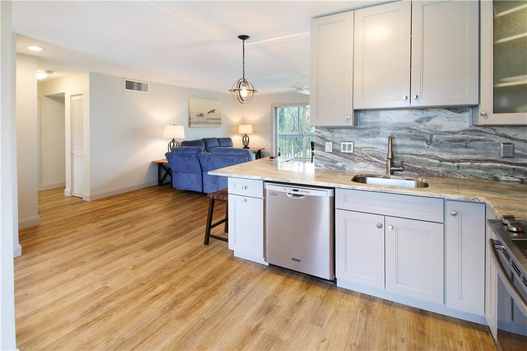 Stunning & spacious corner condo residence on the perimeter of the Shell Bay Golf Resort, a private golf membership! Tropical lifestyle awaits as you enter your foyer into an open floor plan. Impact windows & doors throughout. Luxury vinyl matching flooring in each room. You are immediately drawn to the screened terrace for the spectacular view. Imagine yourself enjoying sunrise/sunset beverages all the while smelling the salt air. TURNKEY furnished light & bright. in kitchen has high-end stainless-steel appliances. Pack your bags, put the key in the door. Boasts plenty of closets with a huge pantry. Covered parking. One owner must be 55. No pets. Work completed with permits. 50 year certification approved.
