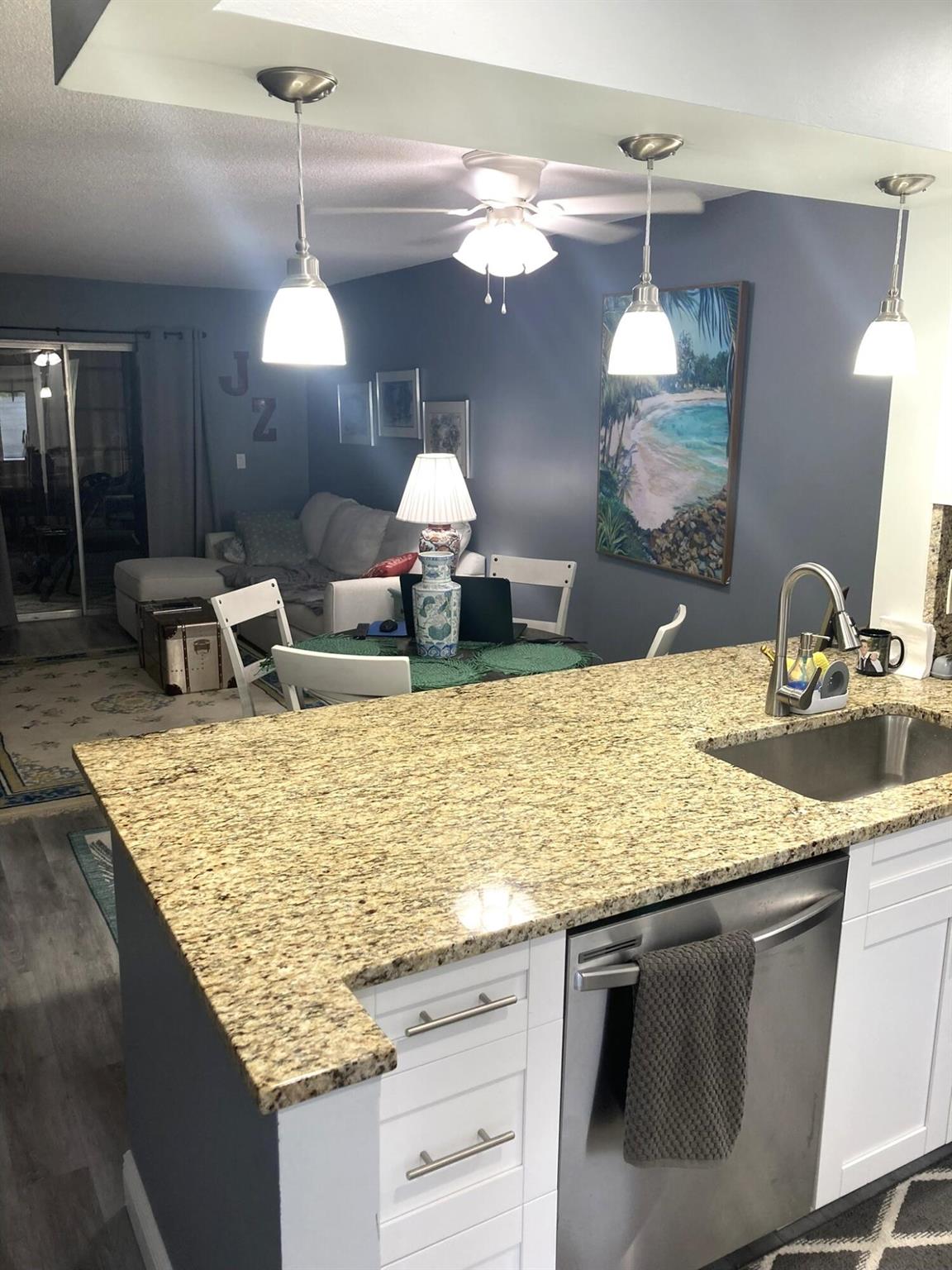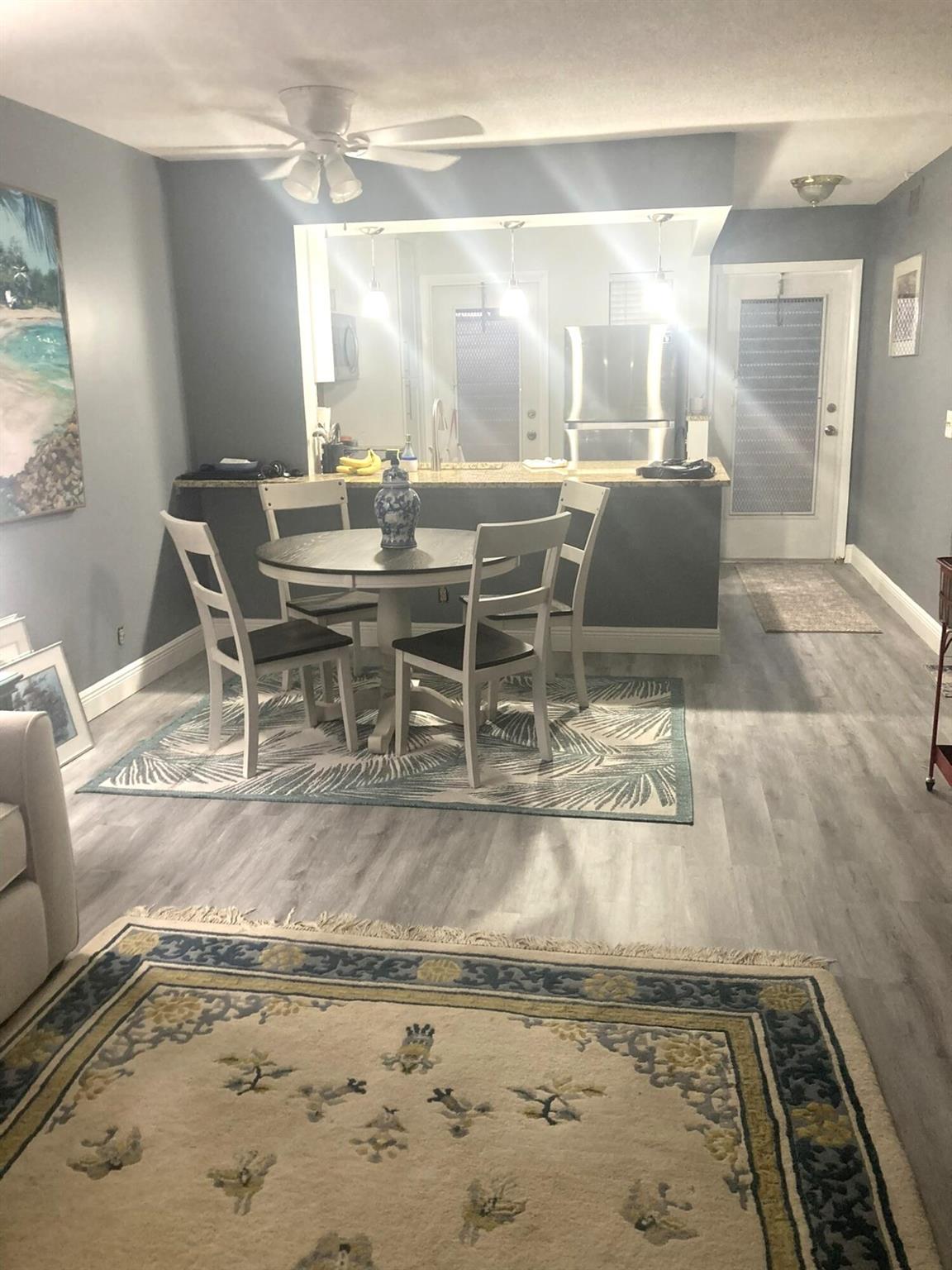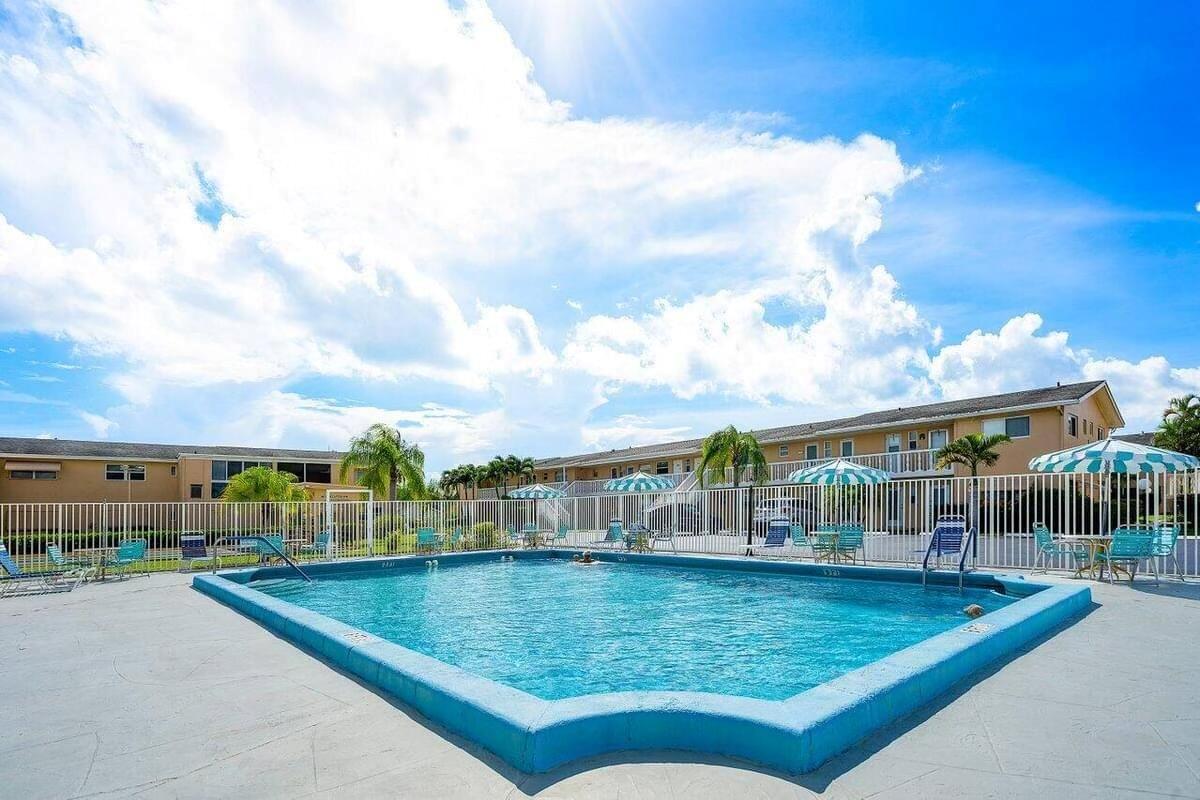 MOTIVATED SELLER! Welcome to this hidden gem at Village Royale! This vibrant 55+ community exudes old Florida charm and offers a variety of amenities for an active lifestyle, including a beautiful outdoor pool, a clubhouse, billiards, library, shuffleboard courts, and a BBQ/picnic area - and it's close to the beach! Once inside, you'll appreciate the modern and updated kitchen with white shaker cabinetry, granite counters and backsplash, stainless appliances and counter-height seating overlooking the living & dining areas. Other features include NEW hurricane impact windows in both bedrooms and kitchen, new flooring throughout, a contemporary color palette, sliding glass doors to the enclosed balcony with storage and full-size washer/dryer. This home is being sold fully furnished/turnkey