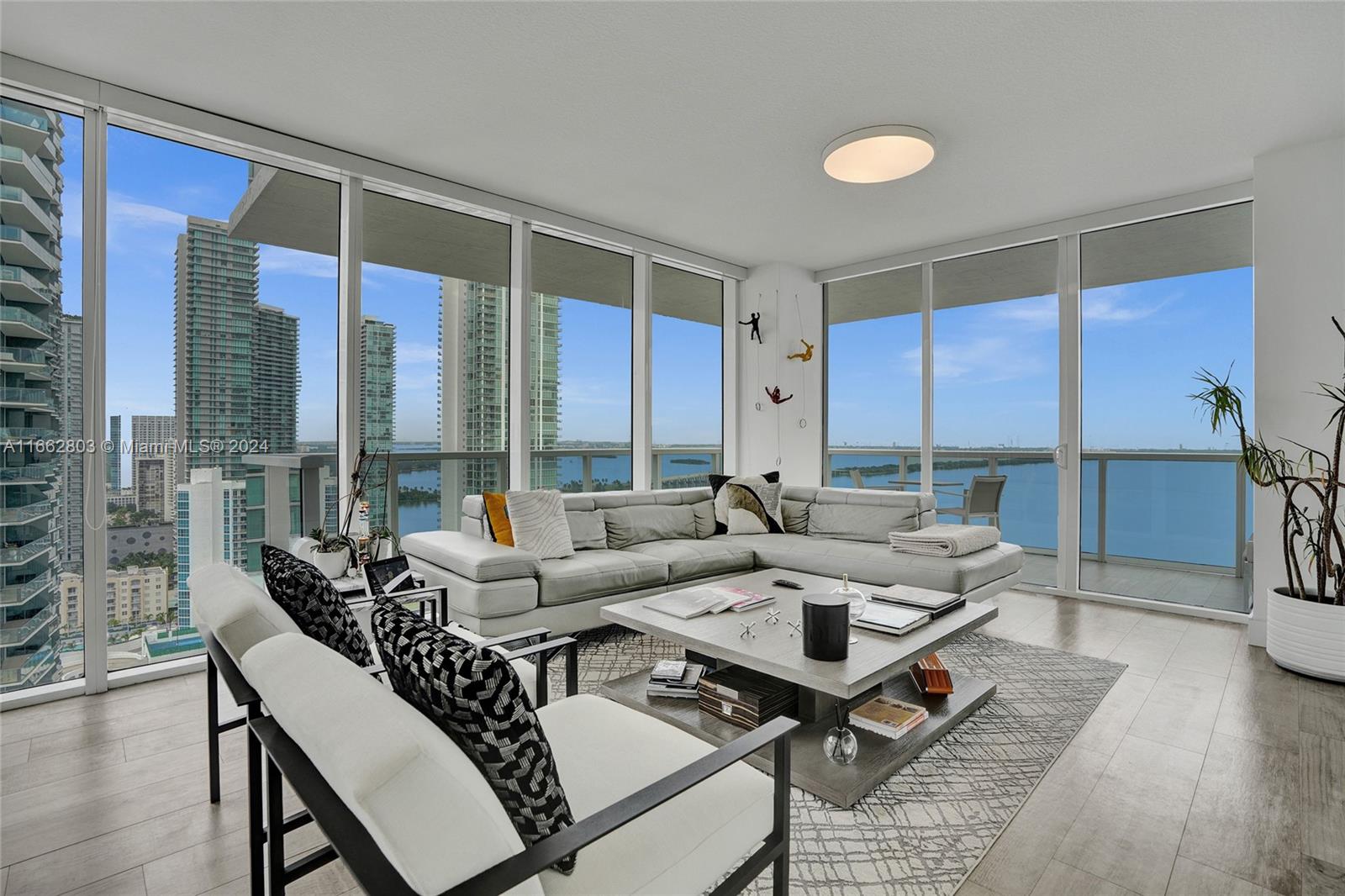 This RARELY AVAILABLE and highly sought after Northeast corner line unit on a high floor is in IMPECCABLE condition. It has a spacious flow through floor plan occupying the entire north side of the building. Two adjacent parking spaces and a storage space are included in the sale. Enjoy BREATHTAKING VIEWS of the Biscayne Bay & Miami Beach skyline from the spacious wrap-around balcony. Floor to ceiling windows provide lots of natural light and allow you to constantly enjoy the MILLION DOLLAR VIEWS! The sellers upgraded this condo beautifully. It features a full smart home system by Brilliant, a built-in butler pantry, LED energy efficient lighting, custom screen shades in the main area & black-out shades in all bedrooms. Maintenance includes water, basic cable & internet. Great amenities!