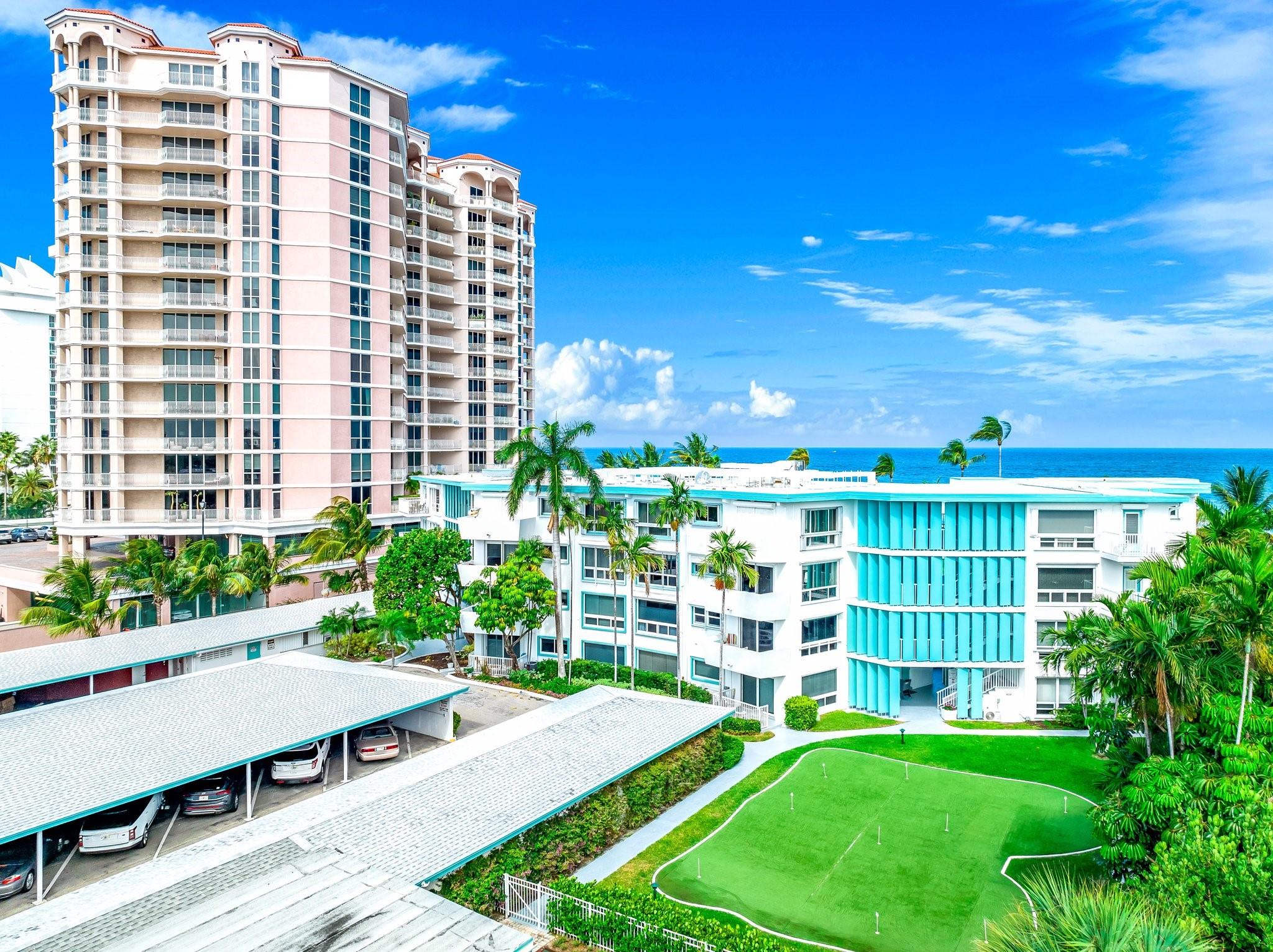 Oceanfront corner unit at El Dorado Club in Lauderdale By The Sea! 200 feet of oceanfront property. Large 2nd floor, 882 sqft unit with direct ocean views nestled in this Mid-century modern boutique building. Association allows annual or seasonal rental, twice a year, minimum 180 days. Unit has 3 sides of windows with incredible natural light. 2 mini split A/C systems (2022). New stove/oven, new microwave. Washer and dryer inside the unit, 1 assigned covered parking space and roll down hurricane shutters. Amenities include beach, heated pool, community kitchen, bbq area, putting green, shuffleboard, 2 elevators. Maintenance fee also includes water. Just minutes from Pompano Beach and Fort Lauderdale. Close to restaurants and shopping!