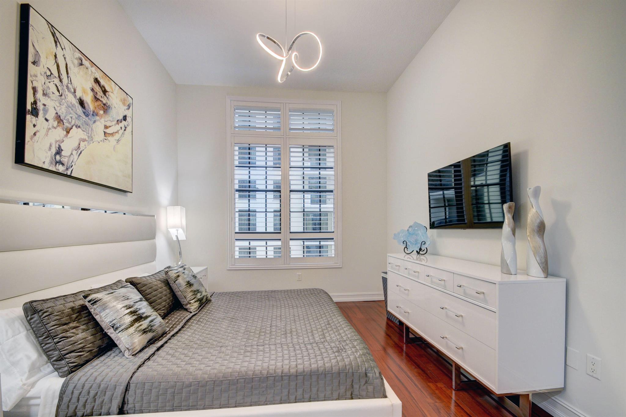 Amazing opportunity to own a turnkey designer home in the premier lifestyle concierge building. This 2 bedroom 2 full bath has been designer decorated and features 11' ceilings, plantation shutters, bamboo flooring, newer washer/dryer, newer water heater, single parking with large dedicated storage. This home features a great room floorplan with a balcony overlooking the protected courtyard. Soft grey/creams and white round out the decor. Just bring your toothbrush and move right in as all the pots/pans/dishes/furniture and artwork is included in the sale. Enjoy valet parking, rooftop pool with incredible intracoastal views, BBQ area, gym, sauna, steam room, movie theater, and a conference room. Just minutes to Palm Beach and the airport.