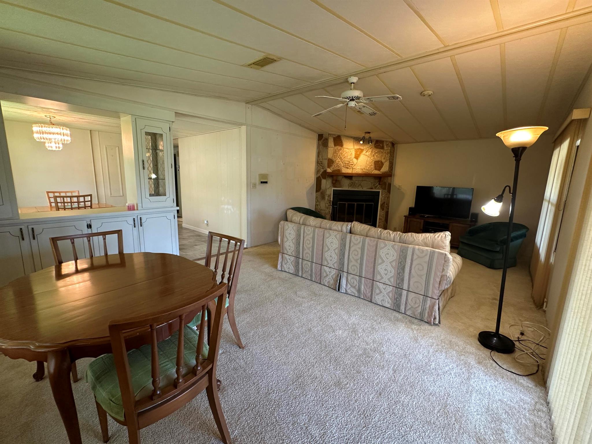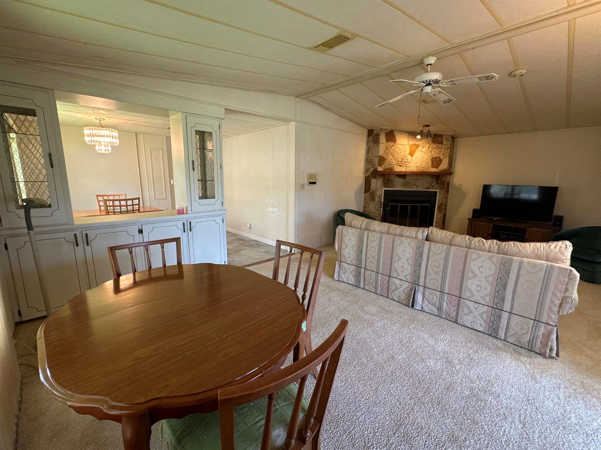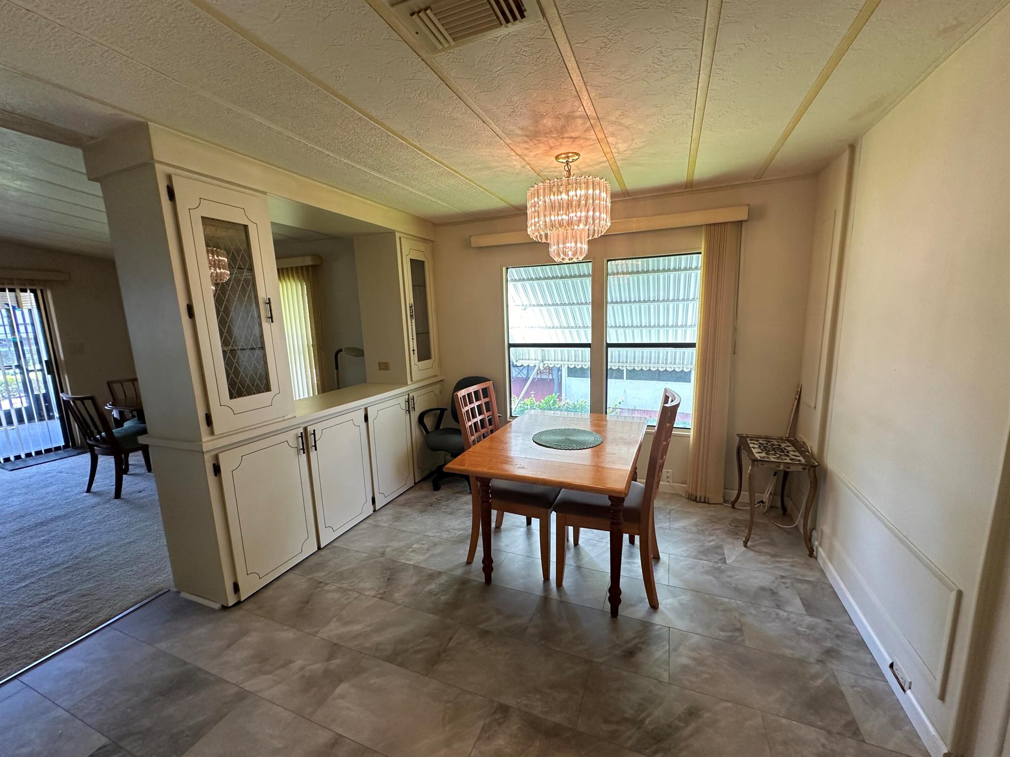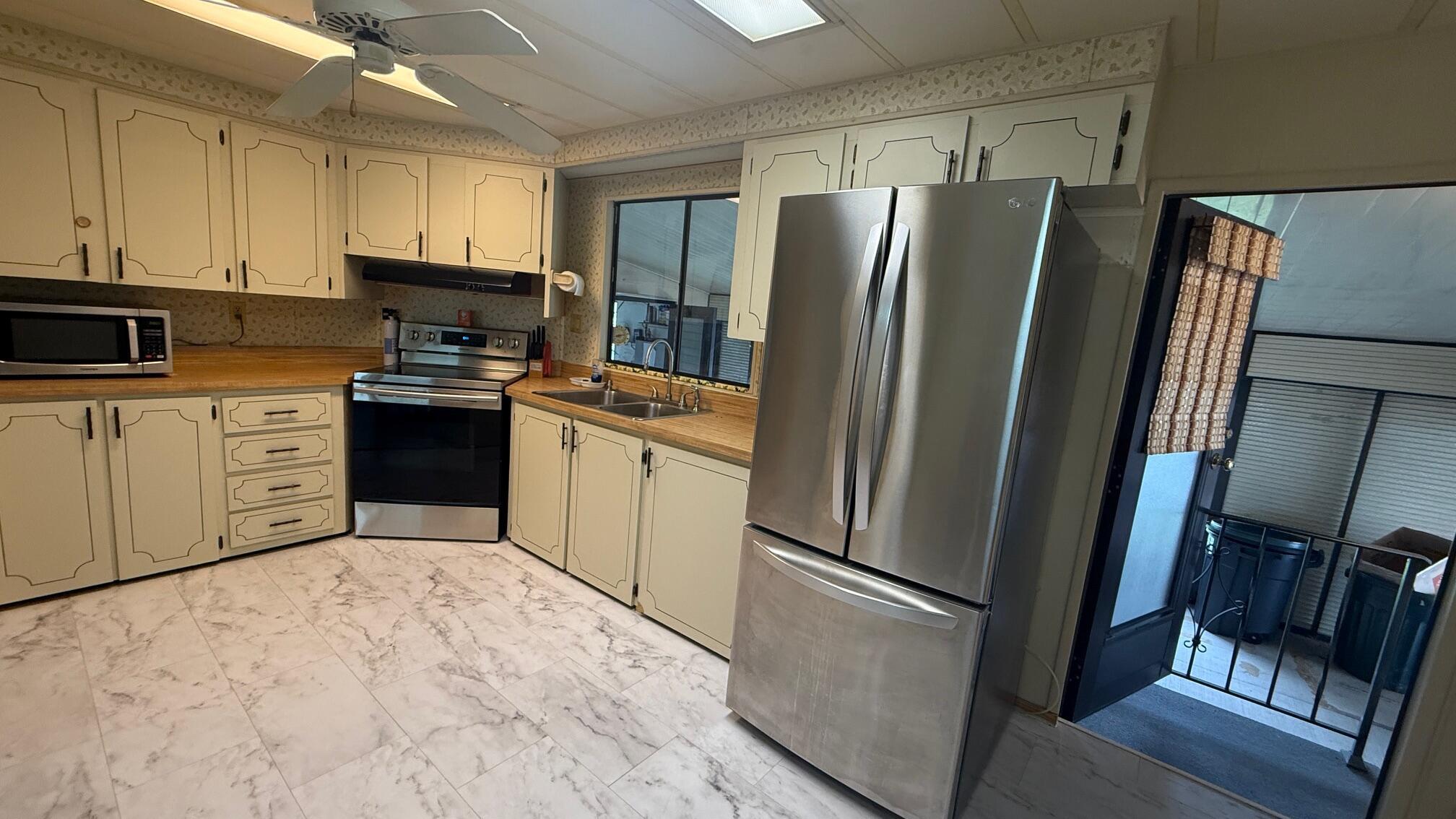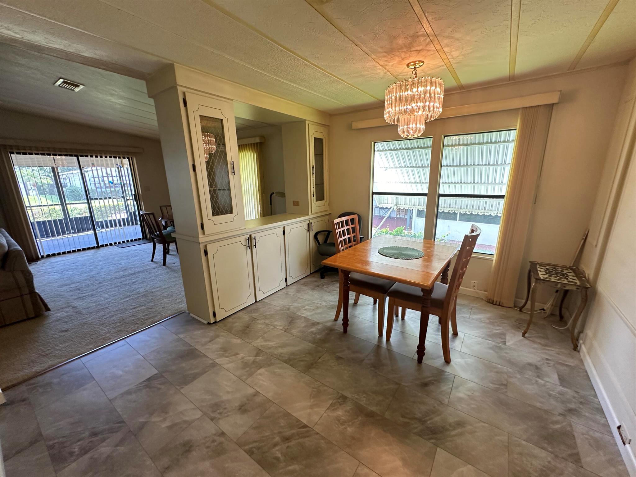 Lovely 2 Bedrm/2 Bath Manuf home in Cambridge 55+ community in Hobe Sound. REAL WOODBURNING FIREPLACE for occasional chilly nights. 1254 SF under A/C w 2 ADDITIONAL SCREEN ROOMS for your pleasure w roll down shutters! 2023 New Flooring in Kitchen, dining room & Primary Bedrm & bath. The Living Room is very large (13X23) w the formal Dining Room adjacent. The Kitchen is also large with newer Stainless appliances. The Primary Bedroom is large w so much storage. Primary bathroom has dual sinks, make up vanity, walk in closet & 2 additional closets & step in shower. The 2nd Bedrm is a good side w a walk in closet & full bath on the hall. The Front Lanai faces east for the morning sun & those famous Hobe Sound Breezes. YOU OWN THE LAND - ALL PETS WELCOME. 2017 3 TON A/C - 2005 AMS Aluminum Ro