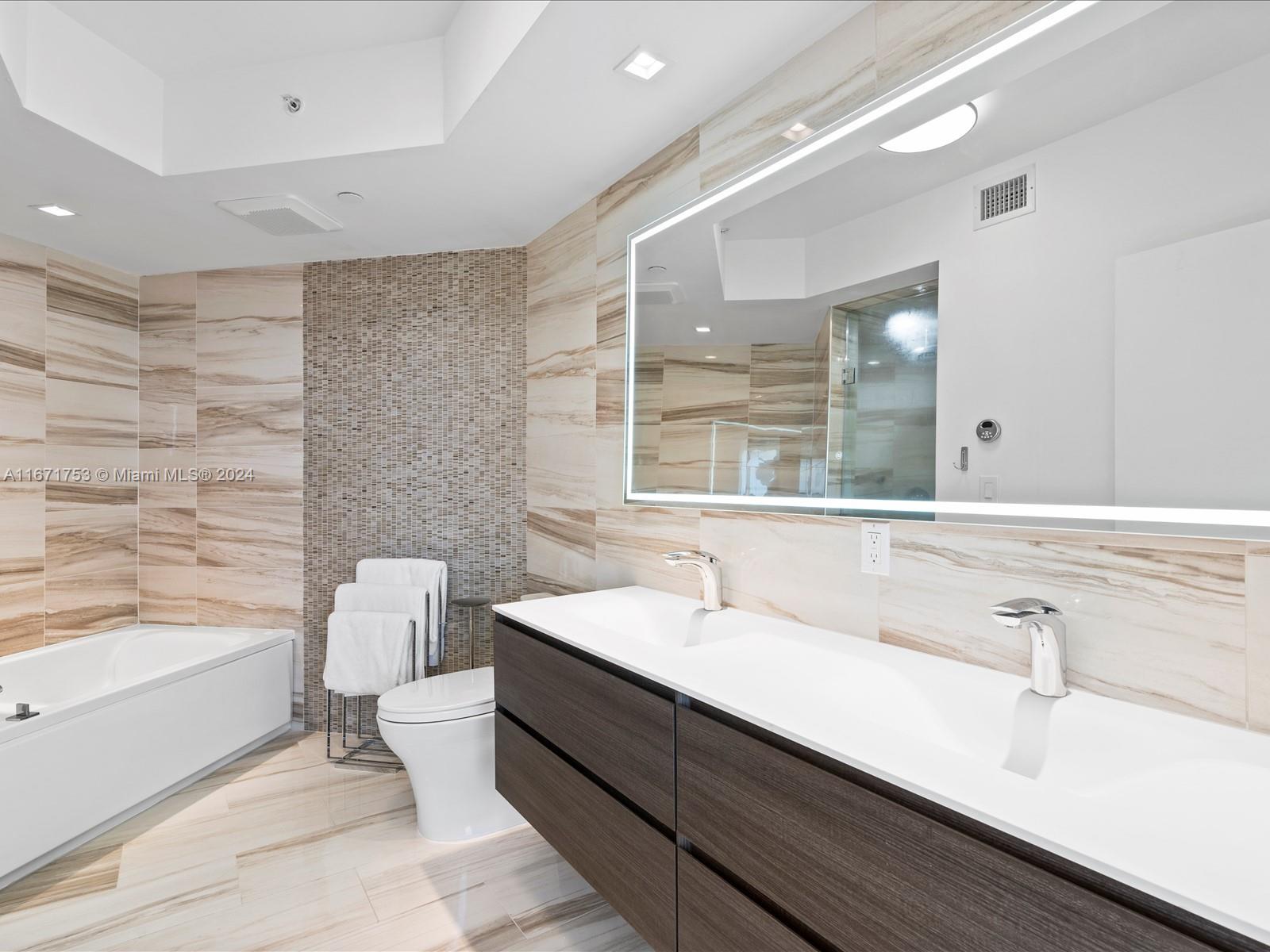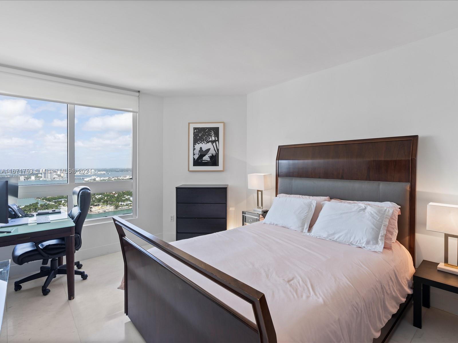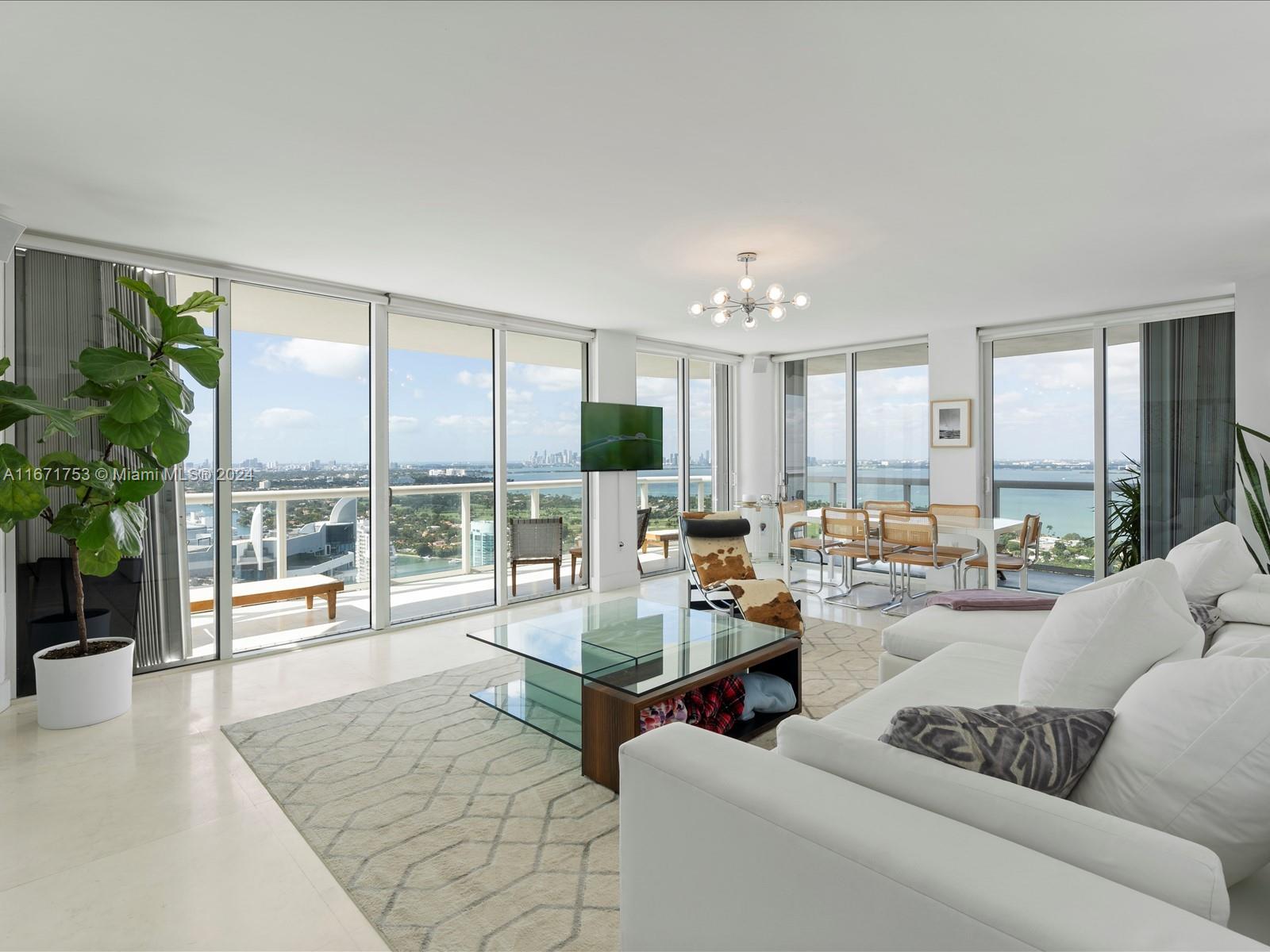 Magnificent views of the ocean, intracoastal and Downtown Miami. Astonishing sunrises, amazing sunsets! Endless views as far as the eye can see characterize this exclusive oceanfront unit. Featuring white marble floors throughout, high end furnishings and a gorgeous private wrap around balcony with glass railings, floor to ceiling windows and sliding glass doors. The luxurious primary suite, highlighting the tastefully just renovated bathroom, is separated from the living area by a solid glass wall. There are exquisite white silk curtains which, when closed, provides ultimate privacy. When open, beautiful panoramic views of the Atlantic Ocean and intracoastal can be enjoyed upon waking or while relaxing in bed.