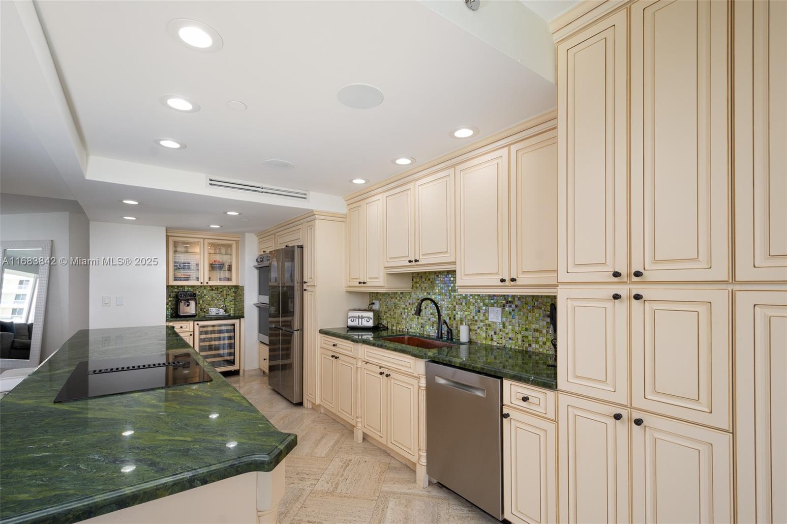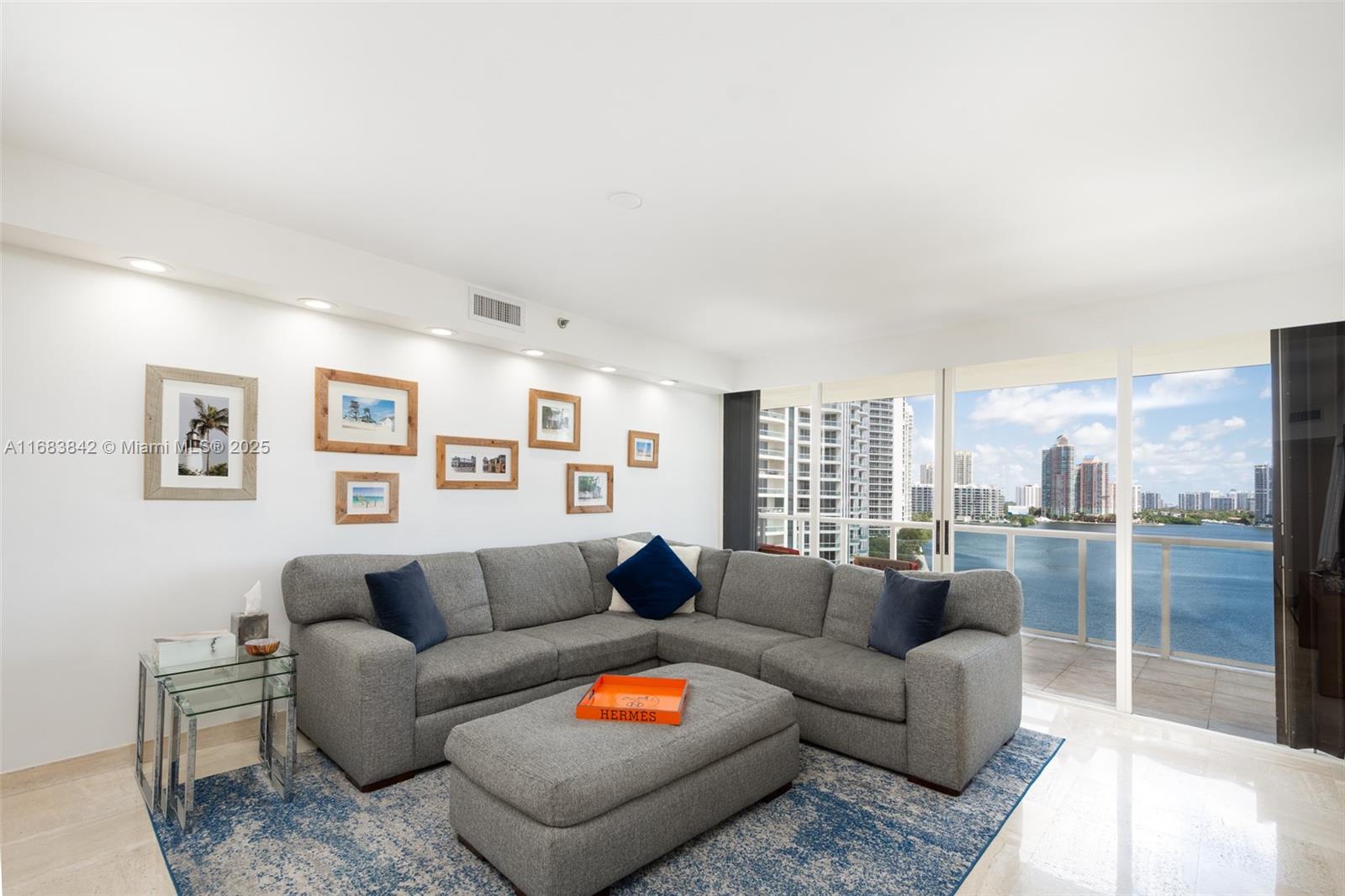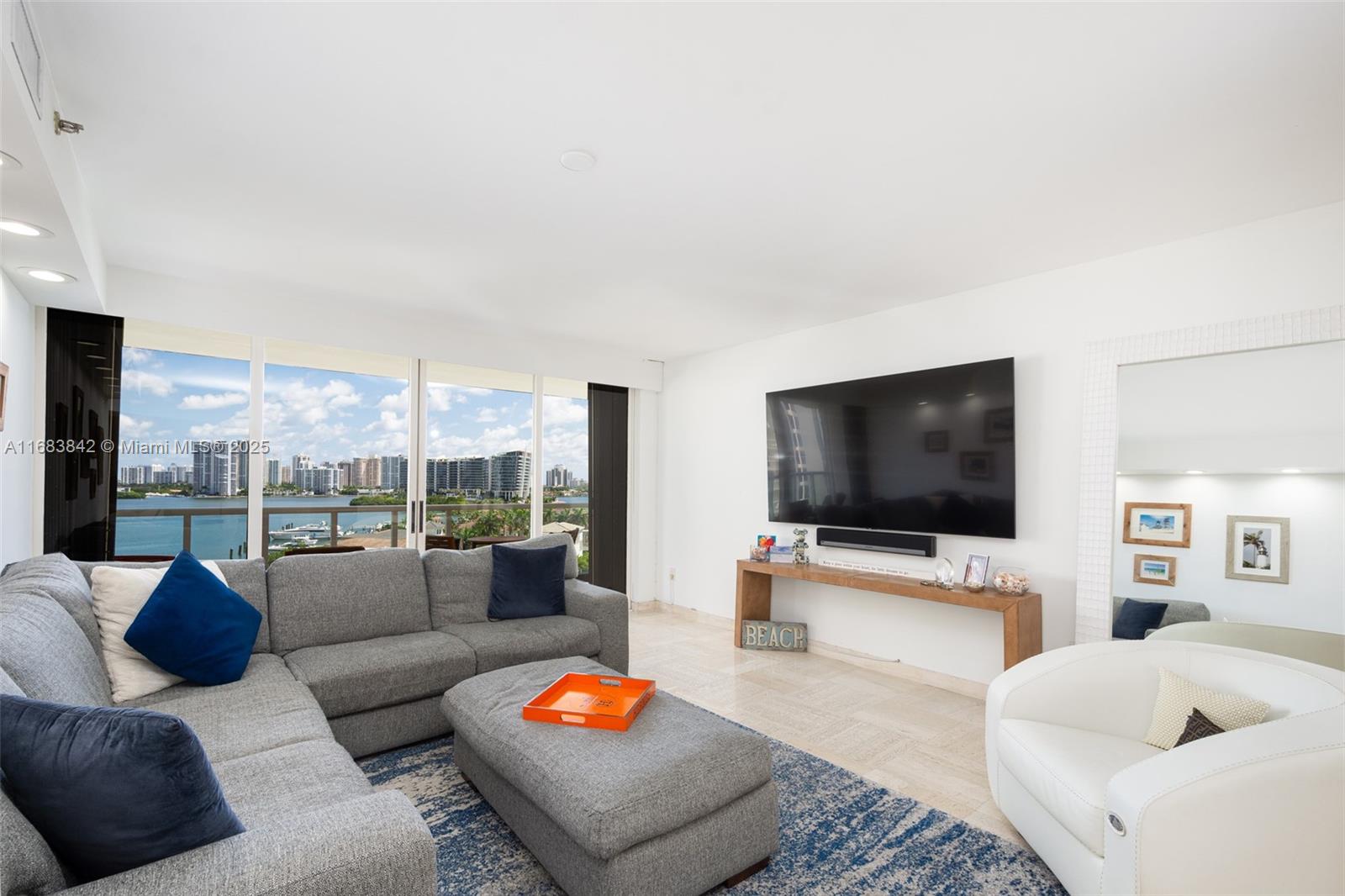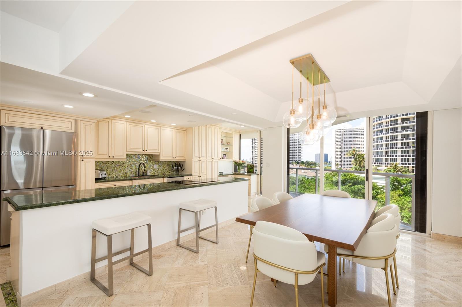 This luxurious 2-bedroom, 2-bath condo spans 1,840 sq. ft. on a desirable northeast corner, blending elegance and comfort. Marble floors enhance spacious living and dining areas perfect for entertaining or relaxing. The oversized open kitchen with top-of-the-line Samsung appliances caters to all culinary needs. Wraparound terraces offer panoramic views, creating a serene retreat. Exciting common area updates include a reimagined entry, porte-cochère, lobby, pool deck, and landscaping by designer Jeff Howard. Enjoy prestigious Williams Island amenities: tennis/pickleball courts, spa, marina, dog park, playground, restaurants, and more.