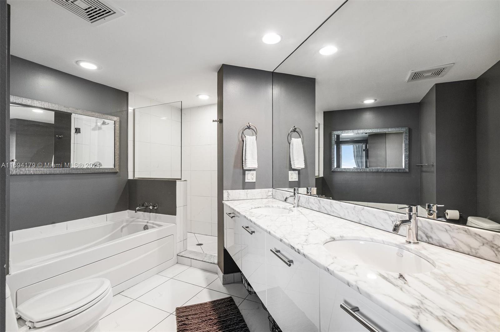 Welcome to your urban oasis in the heart of Brickell! This stunning 2/2 corner unit perfectly blends luxury and convenience. Open-concept living space filled with natural light from floor-to-ceiling windows, offering breathtaking views of the city skyline. Entertain on the spacious balcony, ideal for sunrise and sunset views. The primary suite is a serene retreat with a soaking tub and separate shower. In-unit washer and dryer. Amenities include 3 pools, cold plunge, fitness center, 24-hour concierge for ultimate comfort.