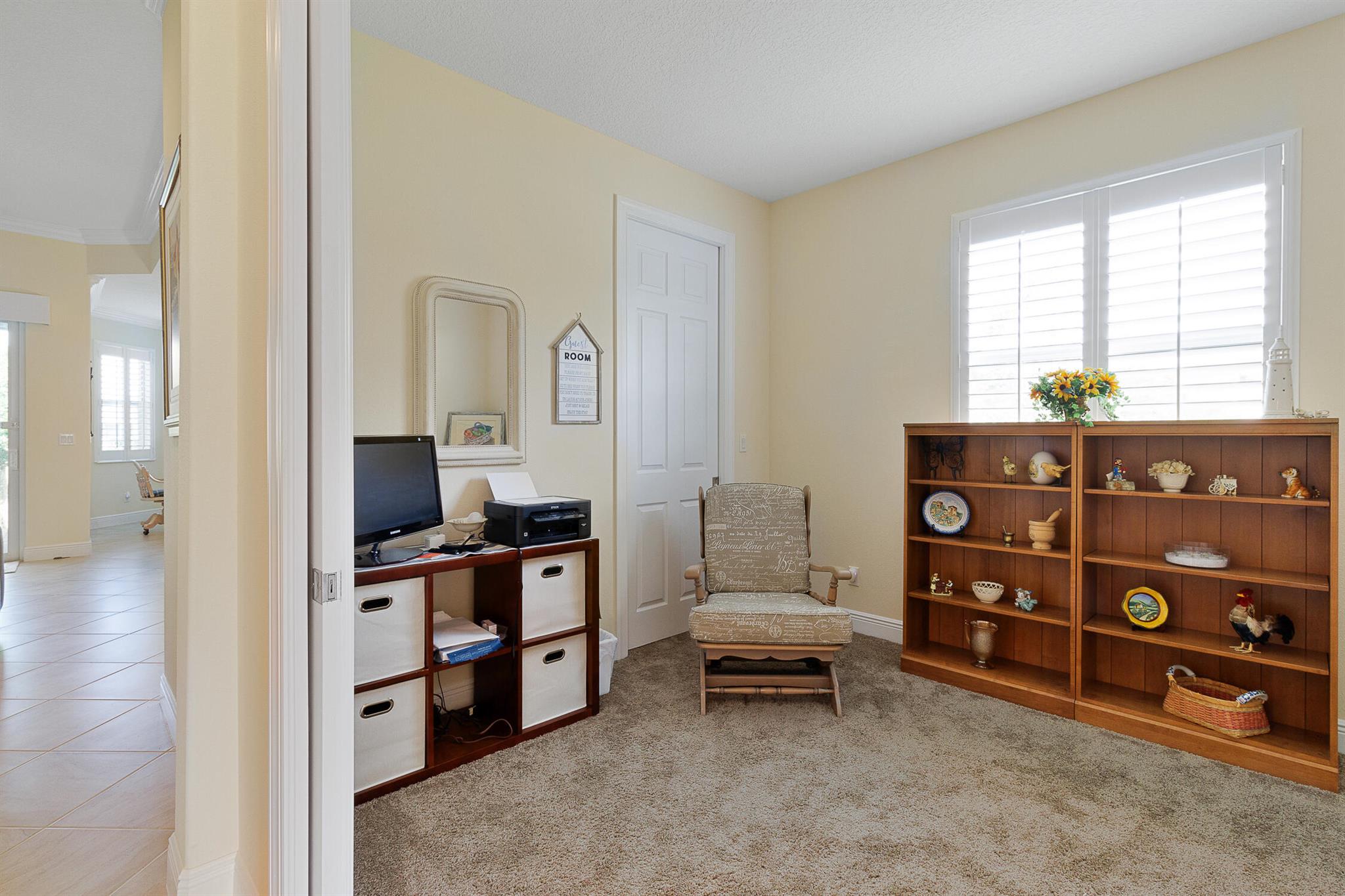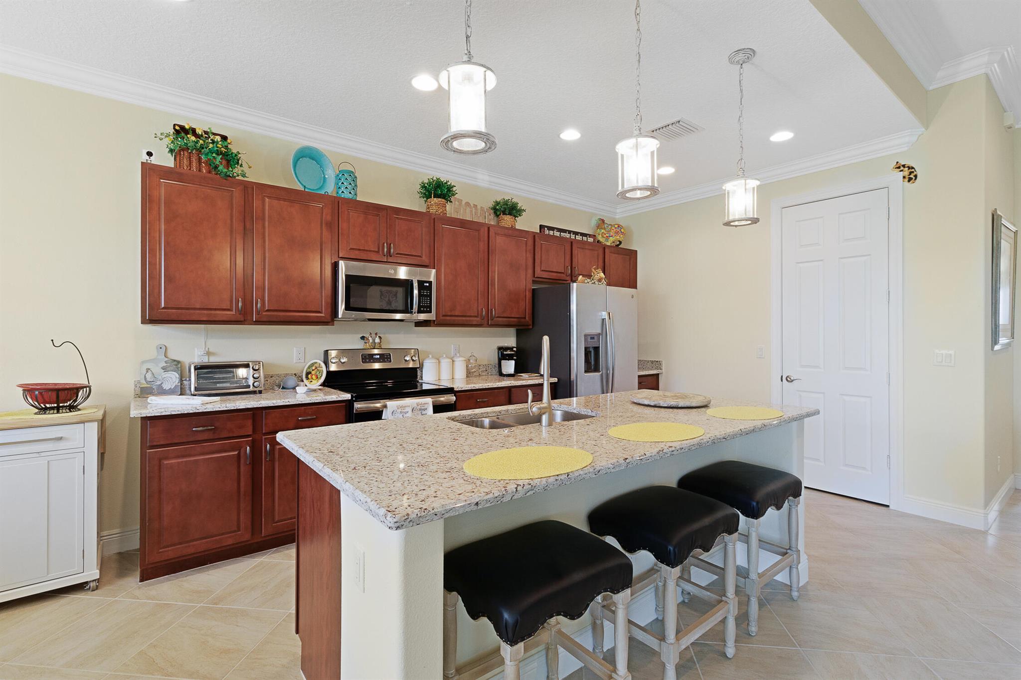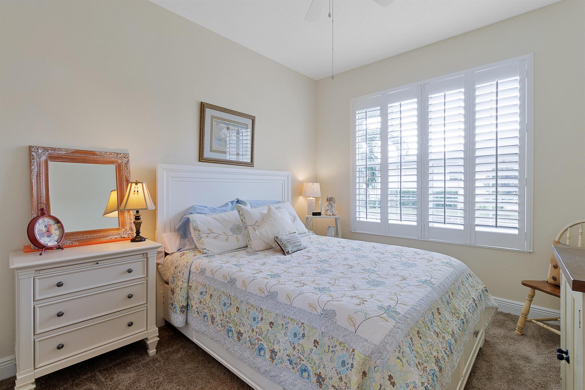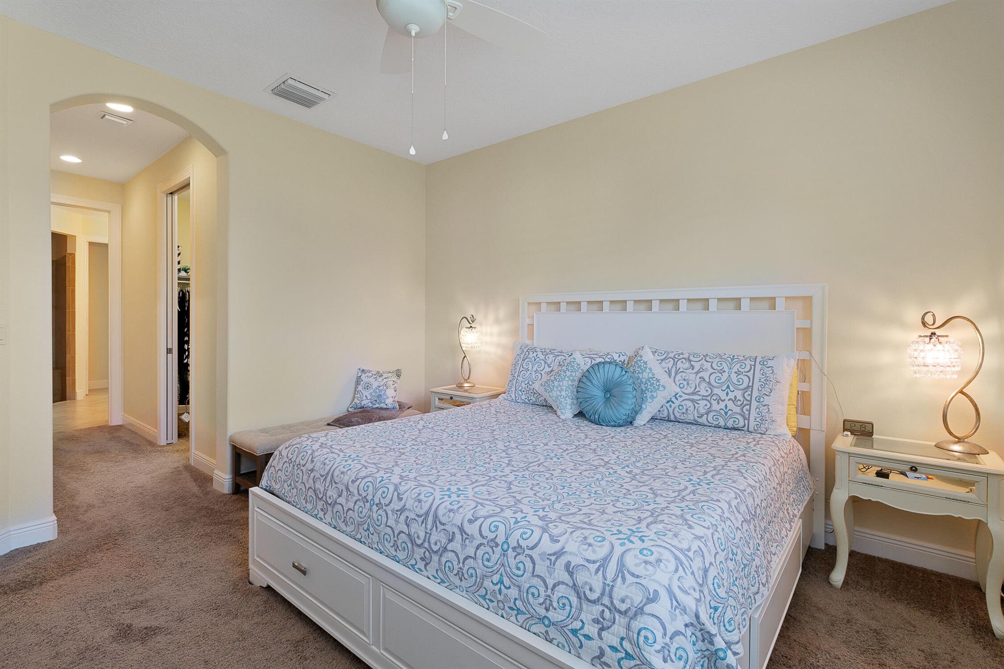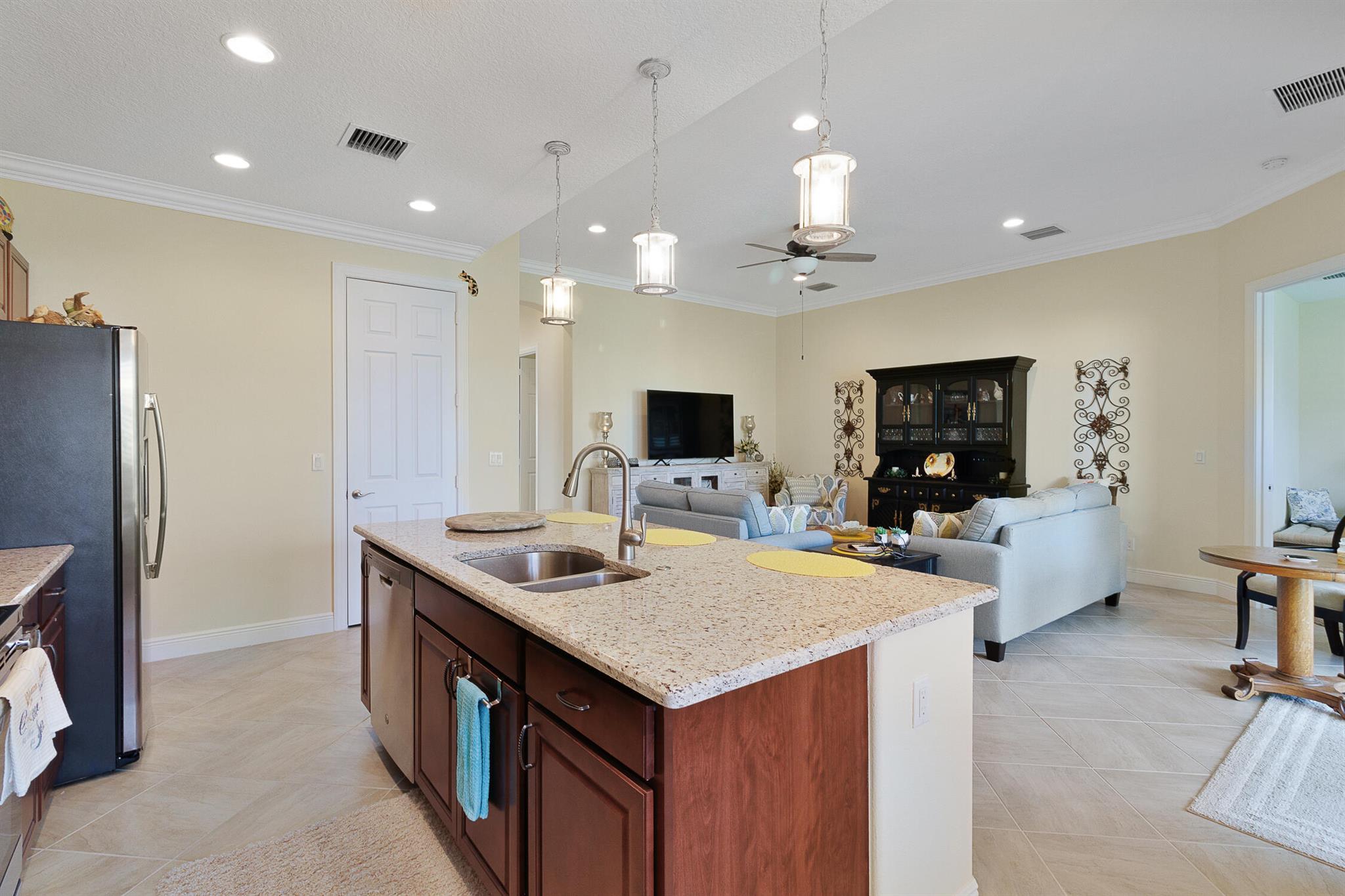 Seller motivated! Custom modified Larkin Grande Villa in Three Oaks. As you enter the lakeside Larkin Grande with 3 bedrooms, 2 bathrooms & a generous 2-car garage you'll notice the extras: tile set on the diagonal, impact windows & doors, plantation shutters, crown molding. The kitchen island becomes the focal point for this home. Enjoy the enlarged dining room with lake views. Add to that, pocket doors on the 3rd bedroom, beautiful cut glass front door insert, elevated TV plugs, extended patio, custom landscaping. The primary bedroom has lake views and custom closets. The primary bath has an open concept shower, dual sinks and custom lighting. Clubhouse w/pool & fitness center. Close to great dining, shopping and, of course, Vero's beautiful beaches.
