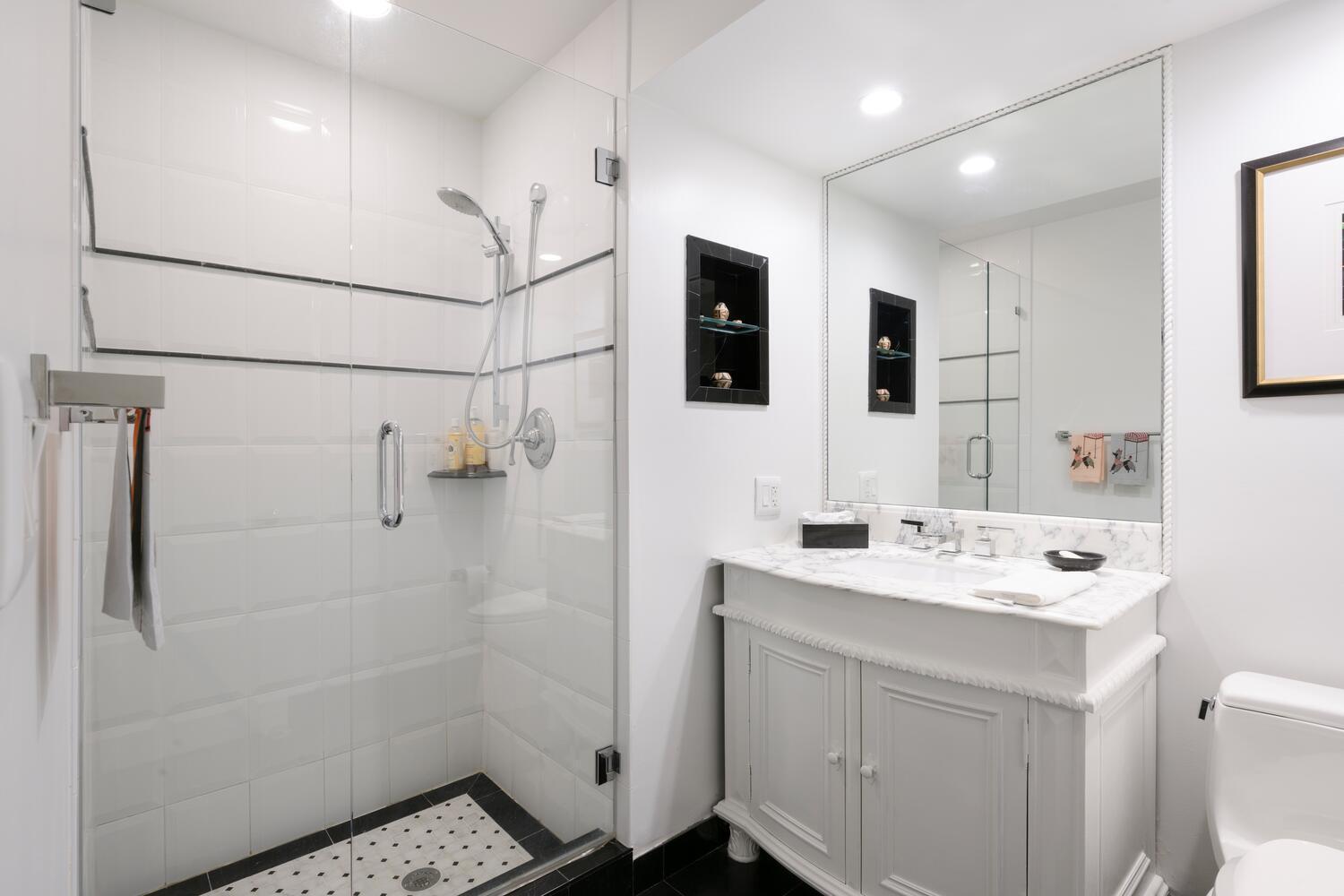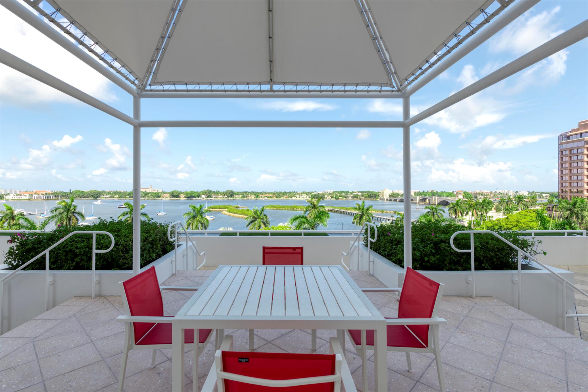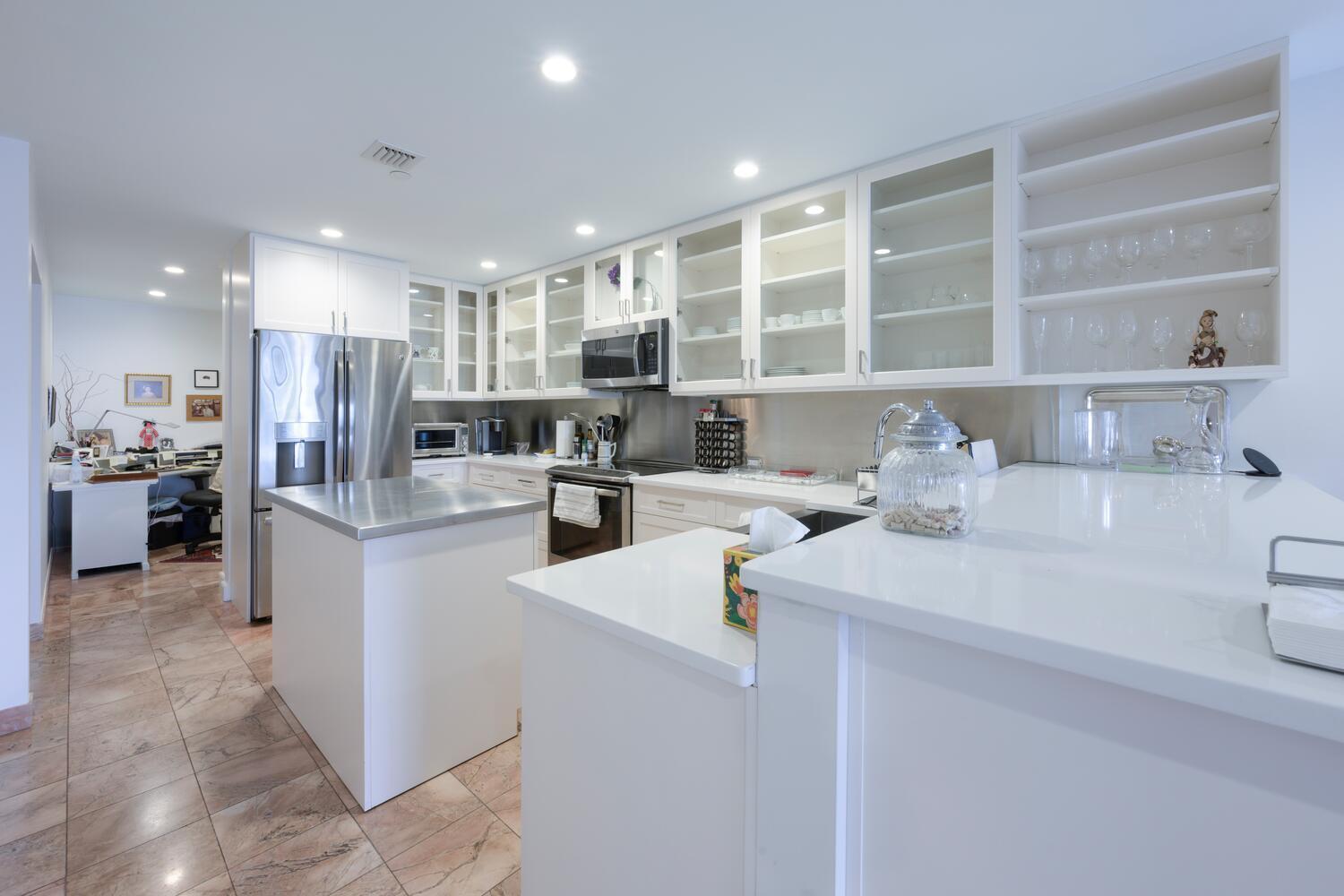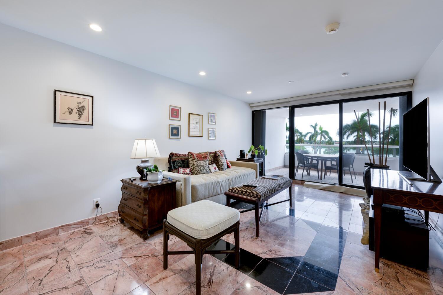 Lovely water views from this elegantly updated one-story townhouse with over 3,325 total sq. ft., (2,560 sq. ft., of living space under air), two large East and West facing terraces, perfect for entertaining. Gourmet kitchen with moveable island, pantry and abundant storage, 40 bottle wine cooler, wine rack, plus areas for spirits and glasses. Updated living and dining rooms with new lighting, new fire sprinklers, new electric outlet, new electric switches, new solid wood doors and hardware, new A/C with UV filter, new ceiling vents for A/C. Master suite includes walk in dressing room, large master bath with soaking tub, large shower, linen closet, and toilet closet. Guest bedroom has an ensuite bath. This lovely home also features a den, office, laundry room and powder room.