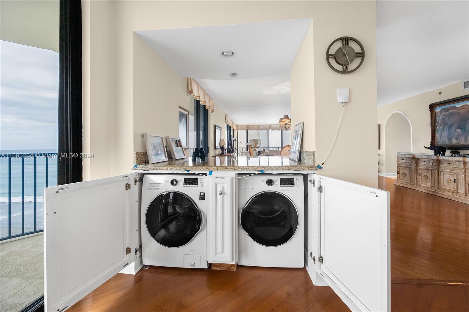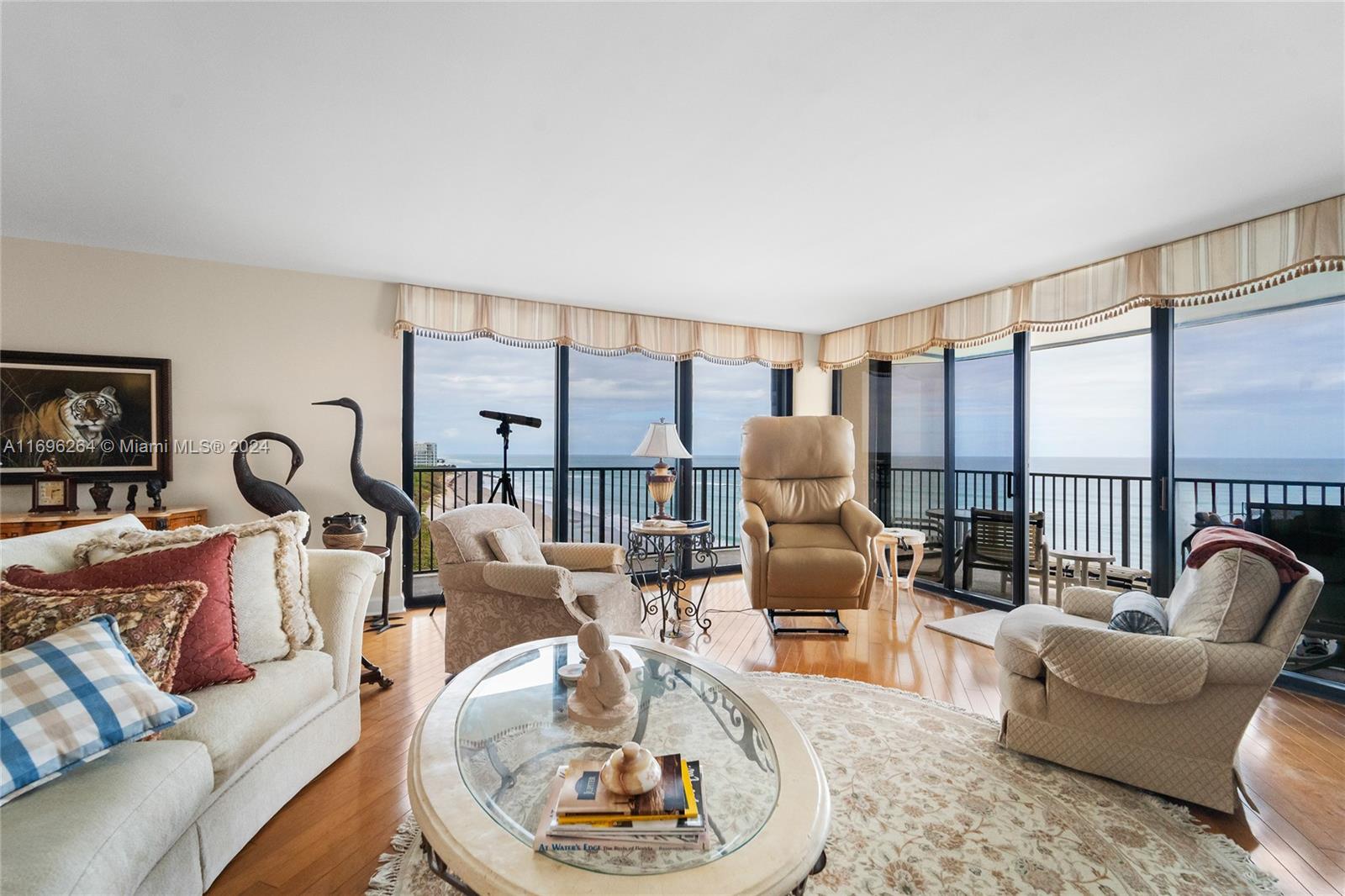 Exquisite and Hard to Find! 8th floor NE corner unit offering breathtaking views of the Blue Atlantic, Jupiter Lighthouse, & Turquoise Intracoastal waterways. This immaculate 3Br/2.5Ba unit is completely renovated with wood flooring... and a massive wrap around balcony. Building features include: a decorator lobby, and a new 2 story rec facility offering a lovely kitchen and second floor state of the art exercise facility... all overlooking one of Jupiter Islands larger pools. This DiVosta (Built Solid) product also offers garage parking and a very large A/C owner storage, meticulous grounds and spectacular on-site building manager.