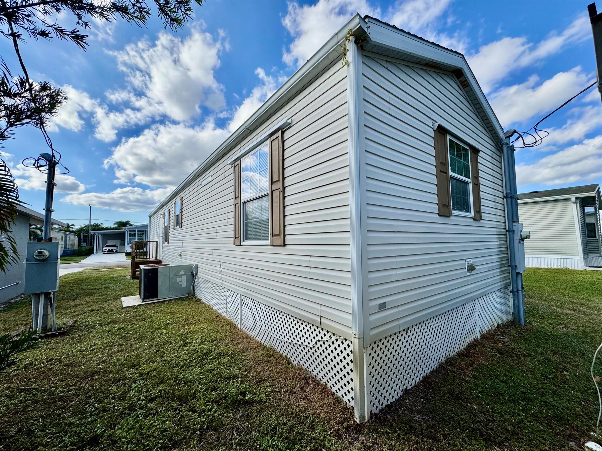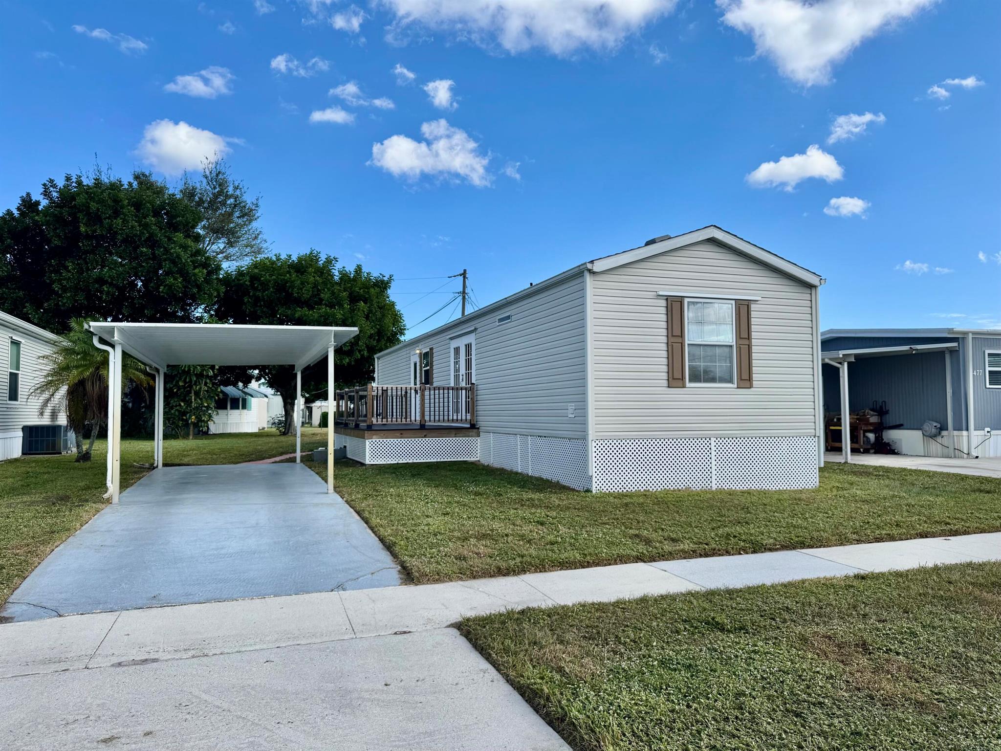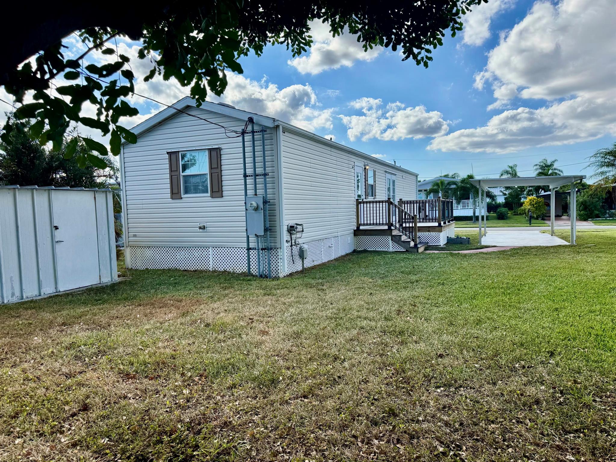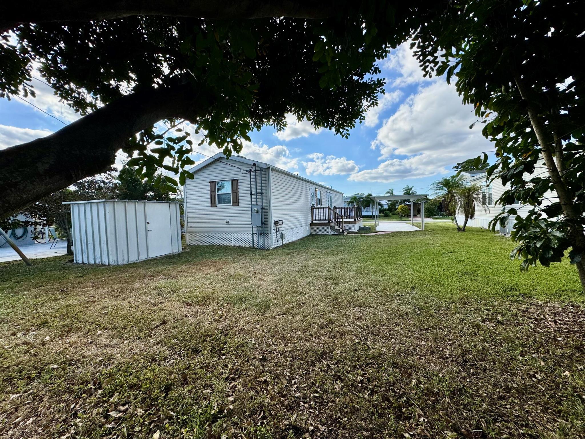 REDUCE: NEGOCIABLE WITH A BRAND NEW ROOF INSTALL IN MARCH 2025. GREAT OPPORTUNITY!!! Here's your chance to own a lovely 2-bedroom, 2-bath manufactured home in the peaceful Tropical Breeze 55+ community. This home is on a large, deeded lot (100x50) that you own! It features an open patio, carport, and a shed for extra storage. Inside, you'll find a remodeled master bathroom, french doors opening to a newer deck at house level, and no carpet--just clean, easy-to-maintain floors. Sold furnished and turnkey, this home is move-in ready. The community offers a heated pool and many activities to keep you busy, all within a quiet, peaceful street. This is a great opportunity for a relaxing and active lifestyle in a wonderful neighborhood. MAYBE PURCHASE WITH A LOAN / MORTGAGE / LENDER