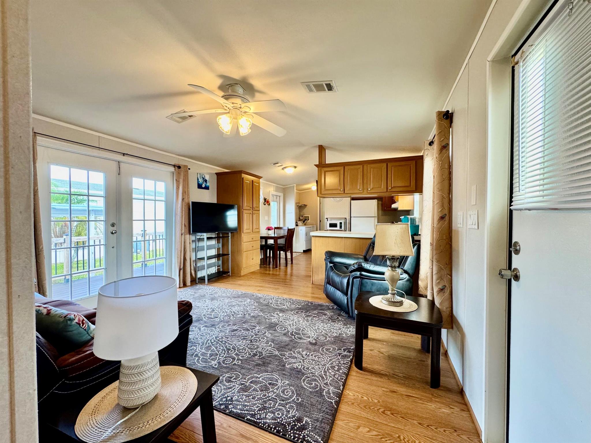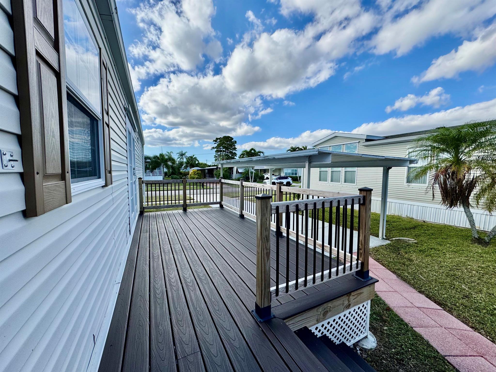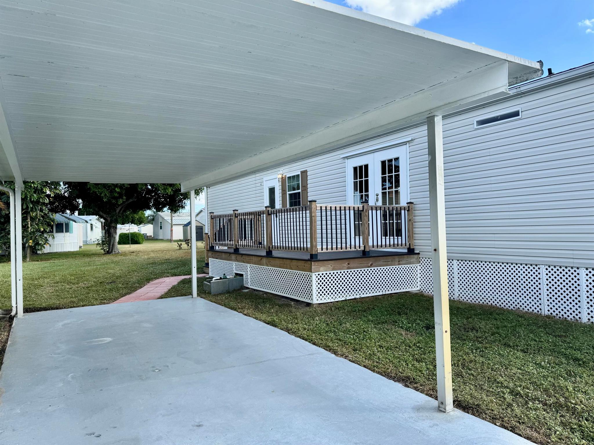REDUCE: NEGOCIABLE WITH A BRAND NEW ROOF INSTALL IN MARCH 2025. GREAT OPPORTUNITY!!! Here's your chance to own a lovely 2-bedroom, 2-bath manufactured home in the peaceful Tropical Breeze 55+ community. This home is on a large, deeded lot (100x50) that you own! It features an open patio, carport, and a shed for extra storage. Inside, you'll find a remodeled master bathroom, french doors opening to a newer deck at house level, and no carpet--just clean, easy-to-maintain floors. Sold furnished and turnkey, this home is move-in ready. The community offers a heated pool and many activities to keep you busy, all within a quiet, peaceful street. This is a great opportunity for a relaxing and active lifestyle in a wonderful neighborhood. MAYBE PURCHASE WITH A LOAN / MORTGAGE / LENDER