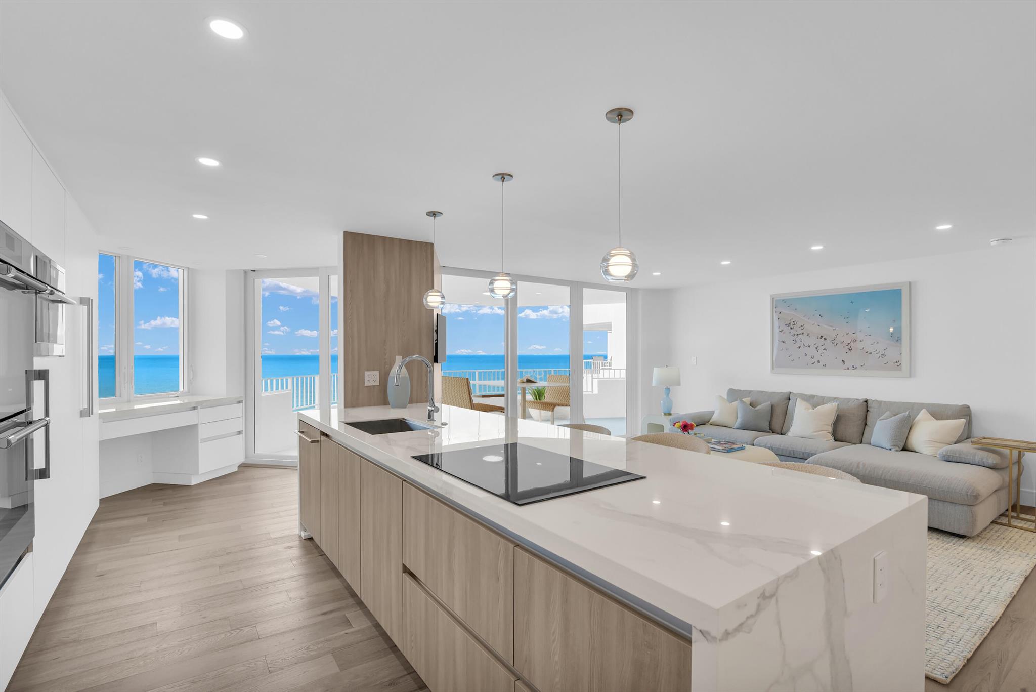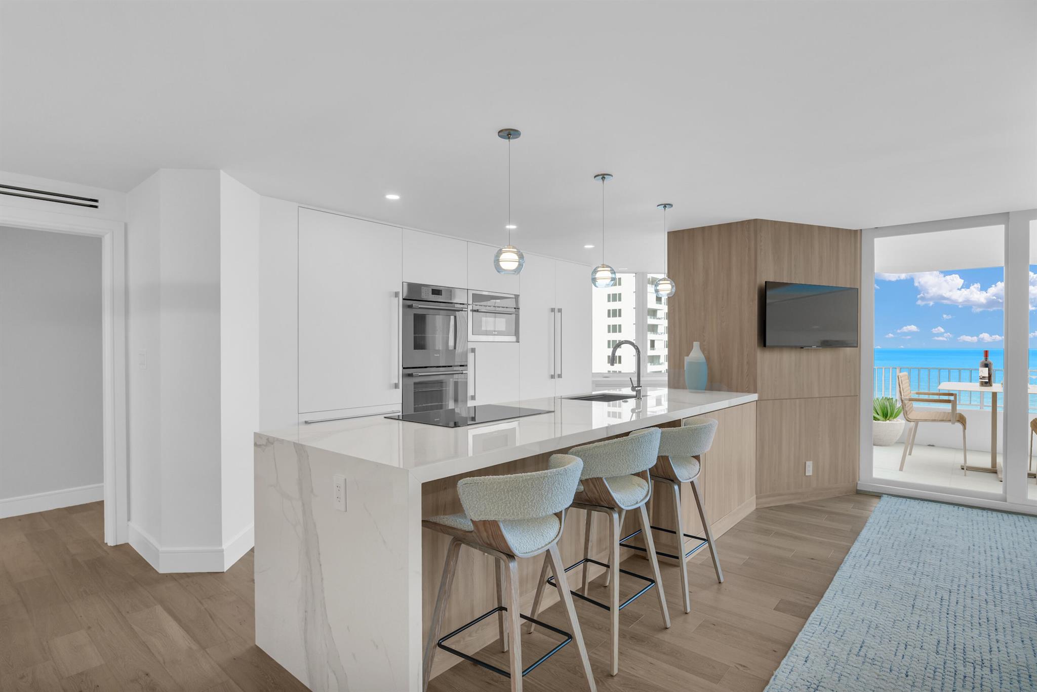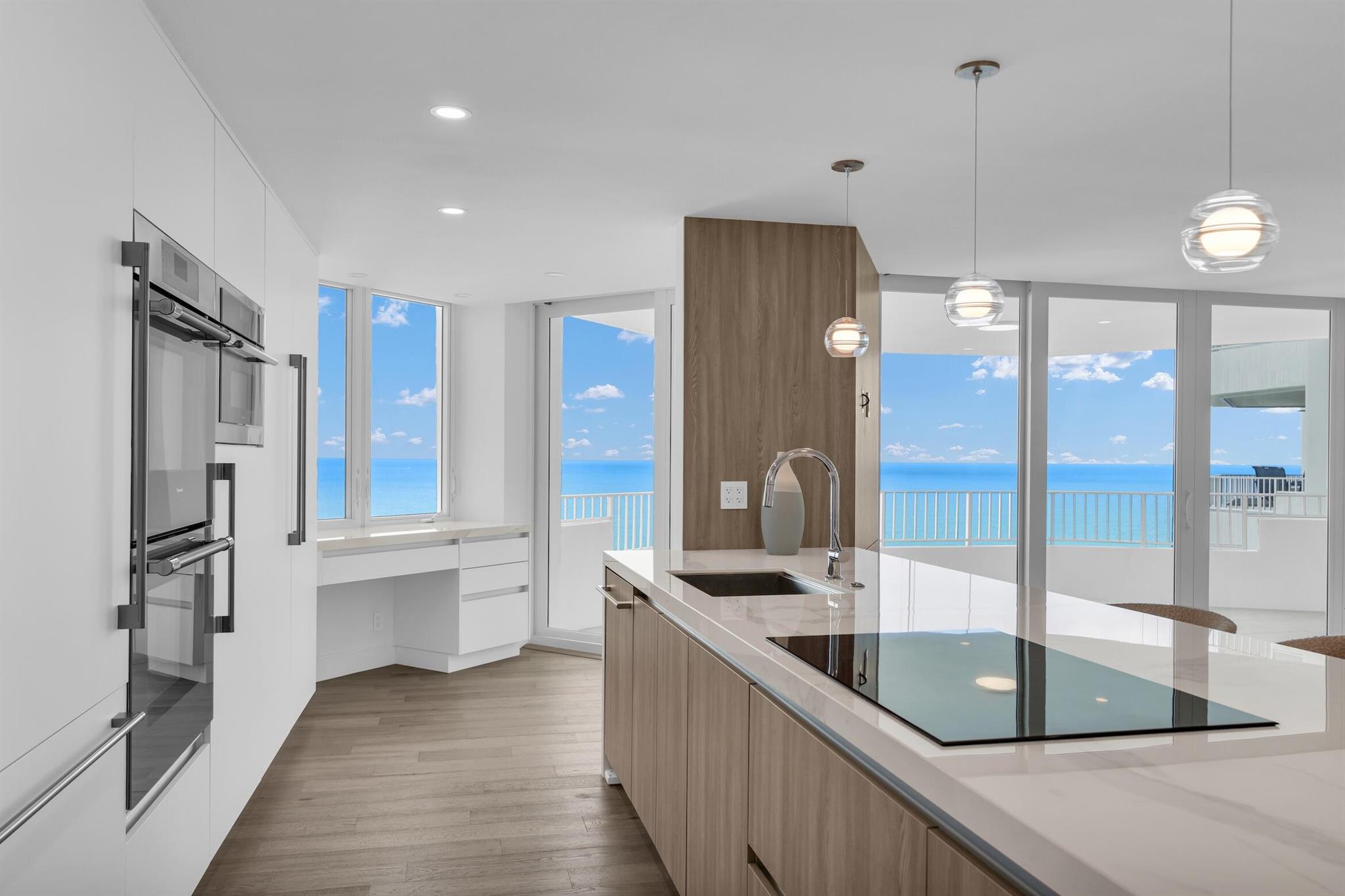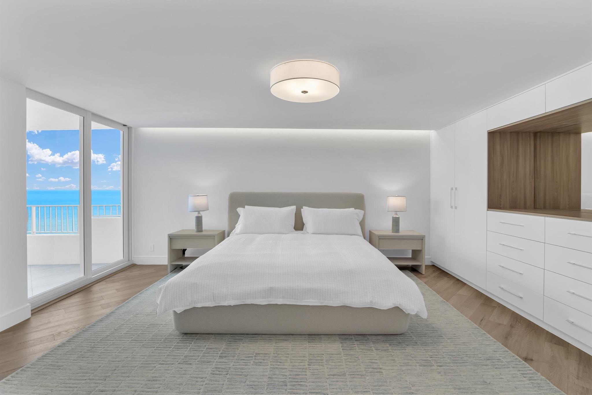 This just-renovated 16th-floor residence is professionally designed with impeccable taste and sophistication. Every room offers breathtaking direct ocean, city and Lake Boca views. Newly constructed, it features high-end Thermador appliances, custom cabinetry, and hardwood engineered oak floors, complemented by porcelain countertops with waterfall island. Split floor plan ensures privacy, spacious bathrooms with double sinks, built-in closets and custom bar with wine fridge, plus expansive oceanfront terrace. Positioned directly on the beach with private beach access and luxurious amenities such as an ocean-side swimming pool, a daily beach umbrella service, state-of-the-art fitness center, and two tennis courts. All comes with the lowest maintenance fees on the beach.