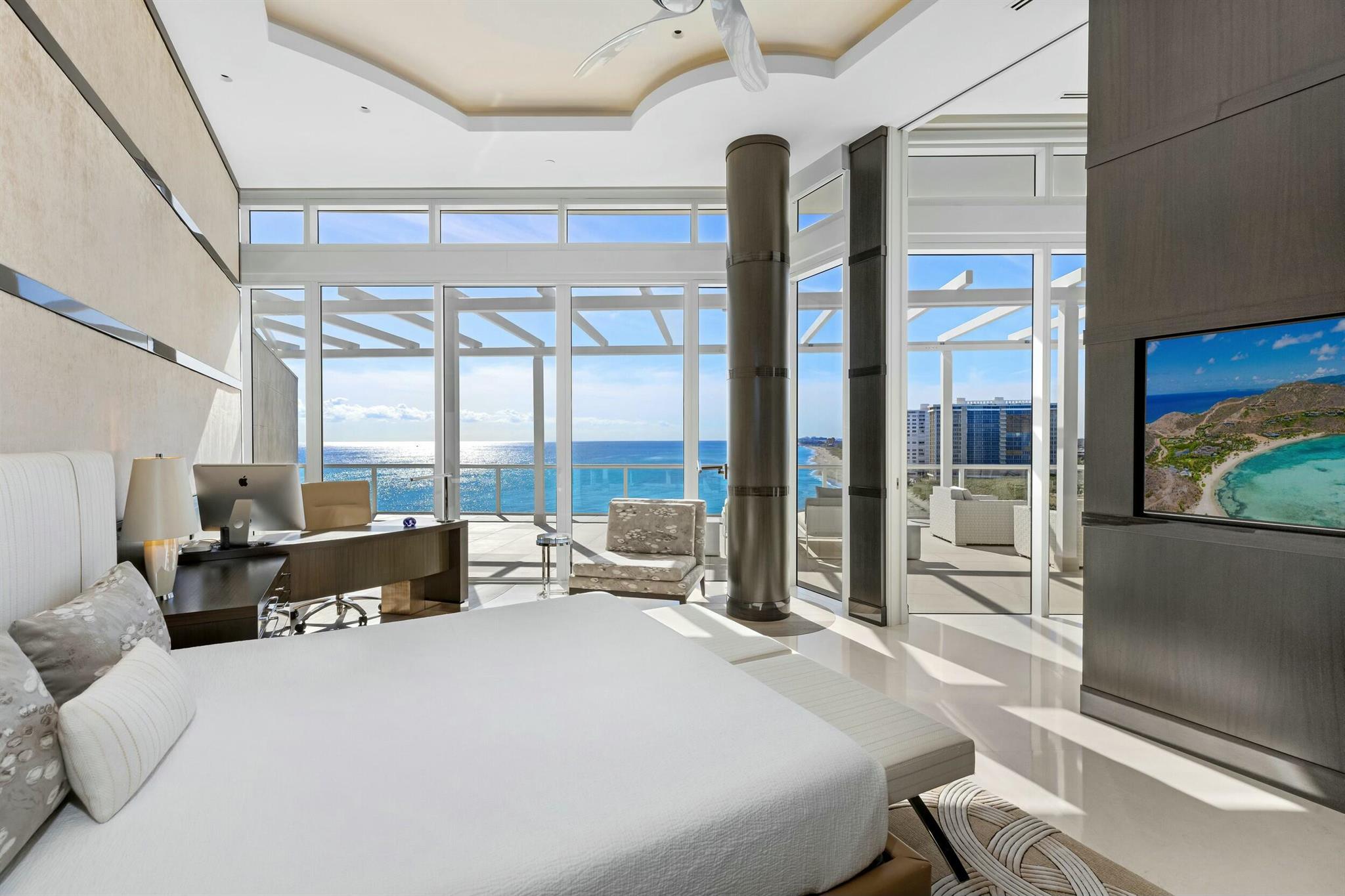 The Sky Penthouse at One Thousand Ocean in Boca Raton is a rare and exceptional residence, blending architectural grandeur with unparalleled luxury. Conceived by Garcia Stromberg Architecture, masterfully executed by Cudmore Builders, and elegantly curated by Shuster Design Studio, this breathtaking penthouse spans 9,303 total square feet, with 6,037 square feet under air. Offering the most extraordinary panoramic views in Boca Raton, the Sky Penthouse boasts unobstructed vistas of the Atlantic Ocean to the east and the Intracoastal Waterway to the west, framing the landscape with breathtaking natural beauty.