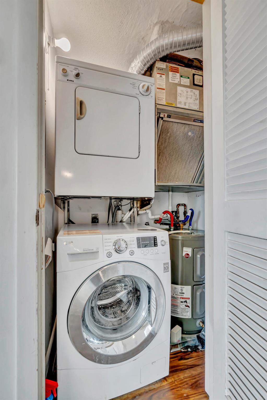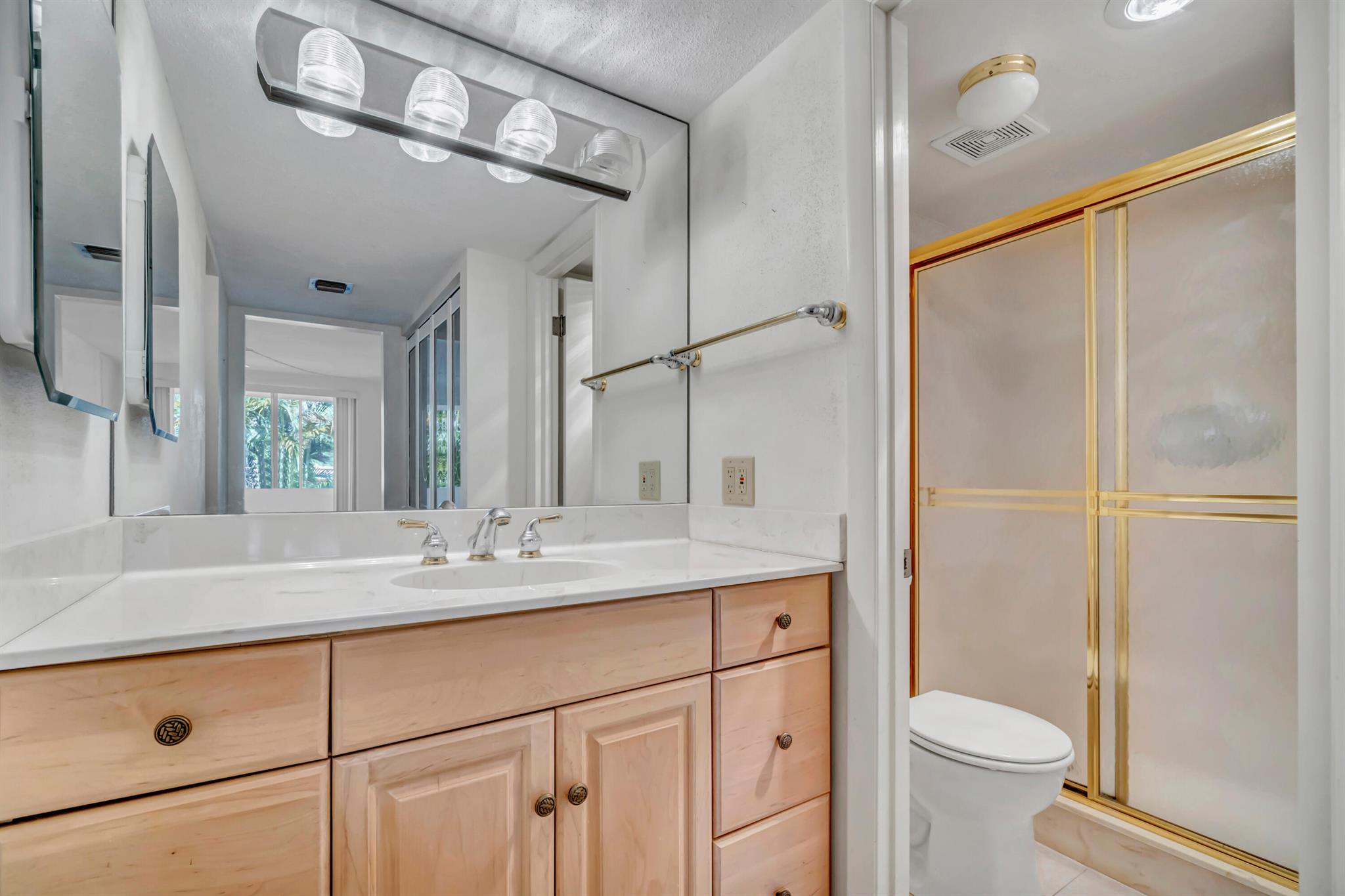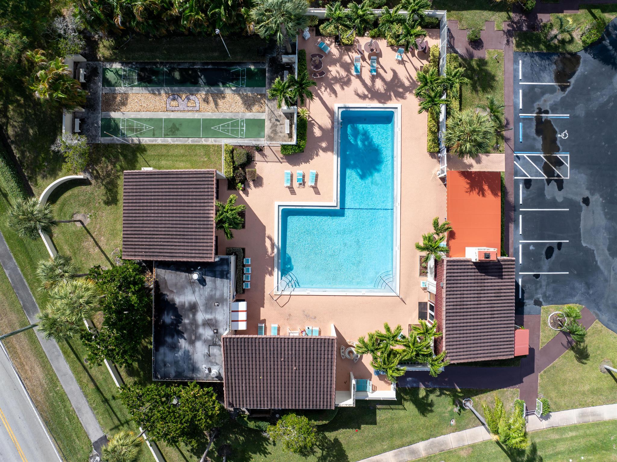 The View! The View! The View!. This second floor until has the best view of the pool. Every room has access to the weathered in patio. All back sliders have hurricane accordian shutters. All other windows are hurricane impact. Newer kitchen with white appliances offers all the space one could need. The dining room opens to the TV room with newer carpet. Large Primary Bedroom has ensuite bathroom with raised vanity and separate toilet room. The large walk in closet and additional oversized linen closet offer great storage. The secondary bathroom has also been recently updated.