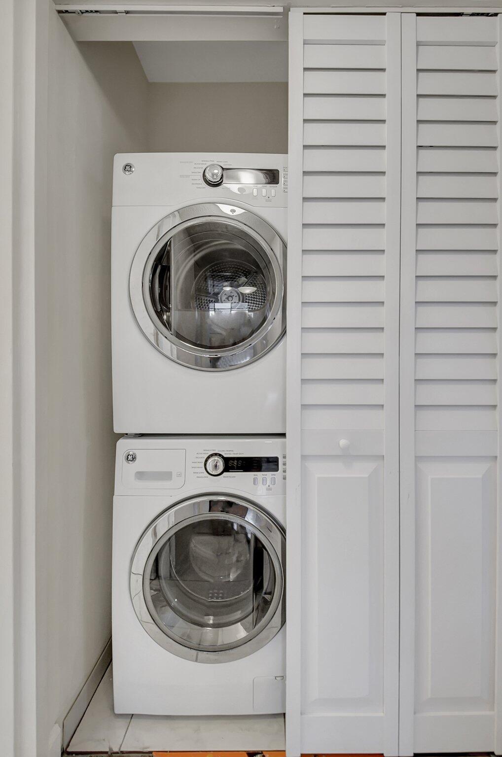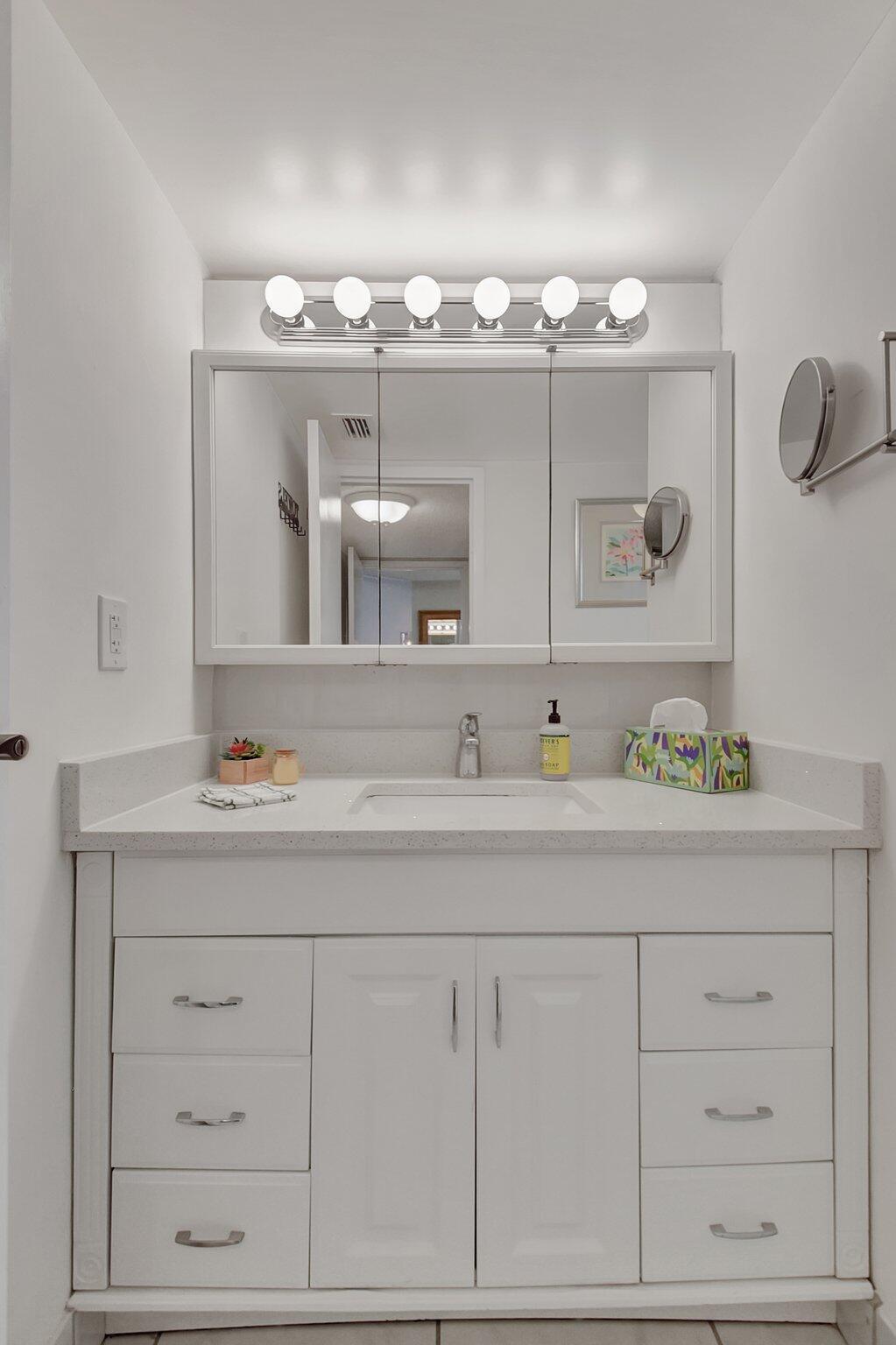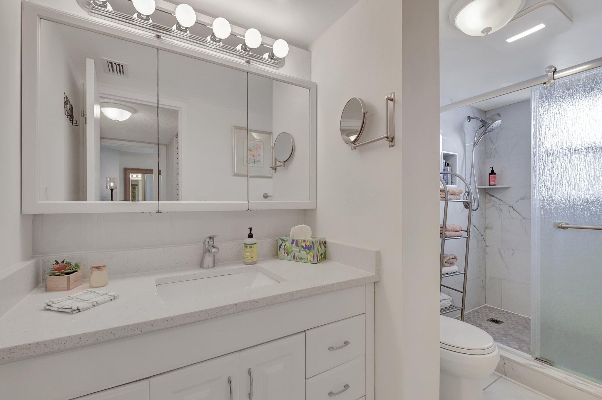 Enjoy the elegance of this fully renovated, spacious 1-bedroom, 1.5-bath condo nestled in the prestigious Poinciana Country Club. The kitchen boasts white shaker cabinets, quartz countertops, stainless steel appliances, and LED recessed lighting, creating a modern and sleek environment. The bathroom is beautifully updated with a tiled walk-in shower and an oversized vanity. The generously sized bedroom offers his and hers walk-in closets with organizers. Convenience is at your fingertips with a front-load washer and dryer in the utility closet, plus a storage closet on the balcony. Step out onto the balcony and relish views of the golf course and lagoon. You're just steps away from the clubhouse which features: A bar/restaurant offering lunch, dinner, and entertainment, A fitness center,