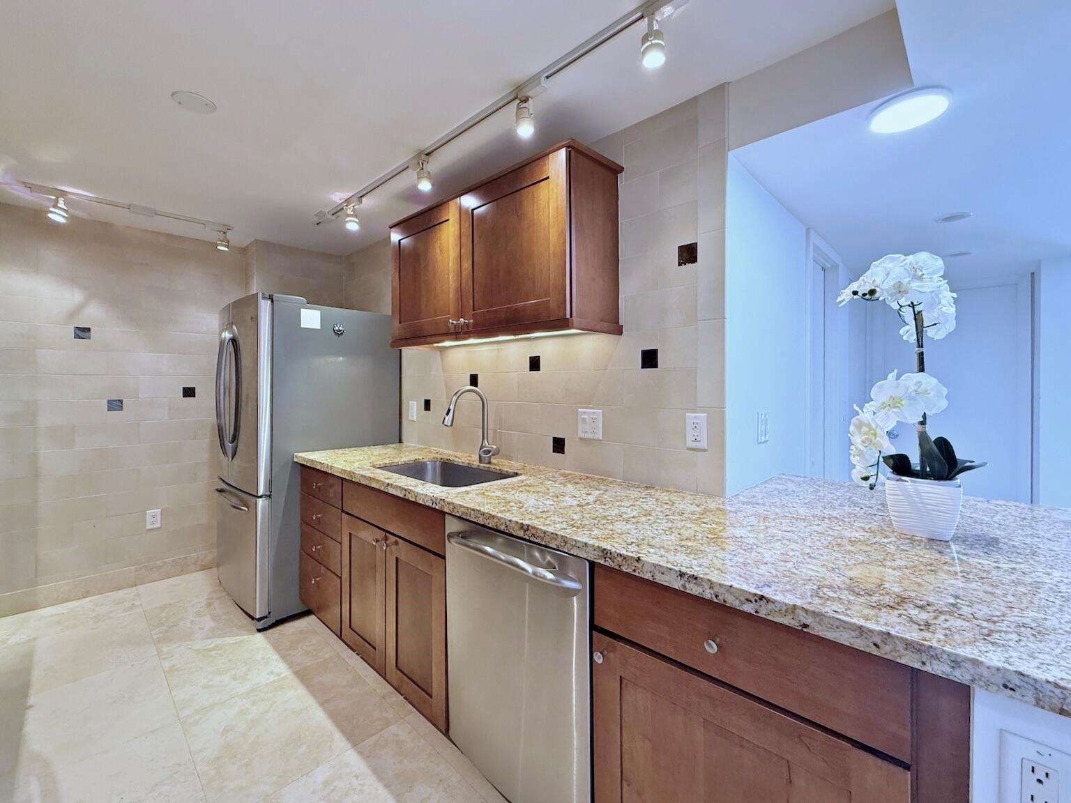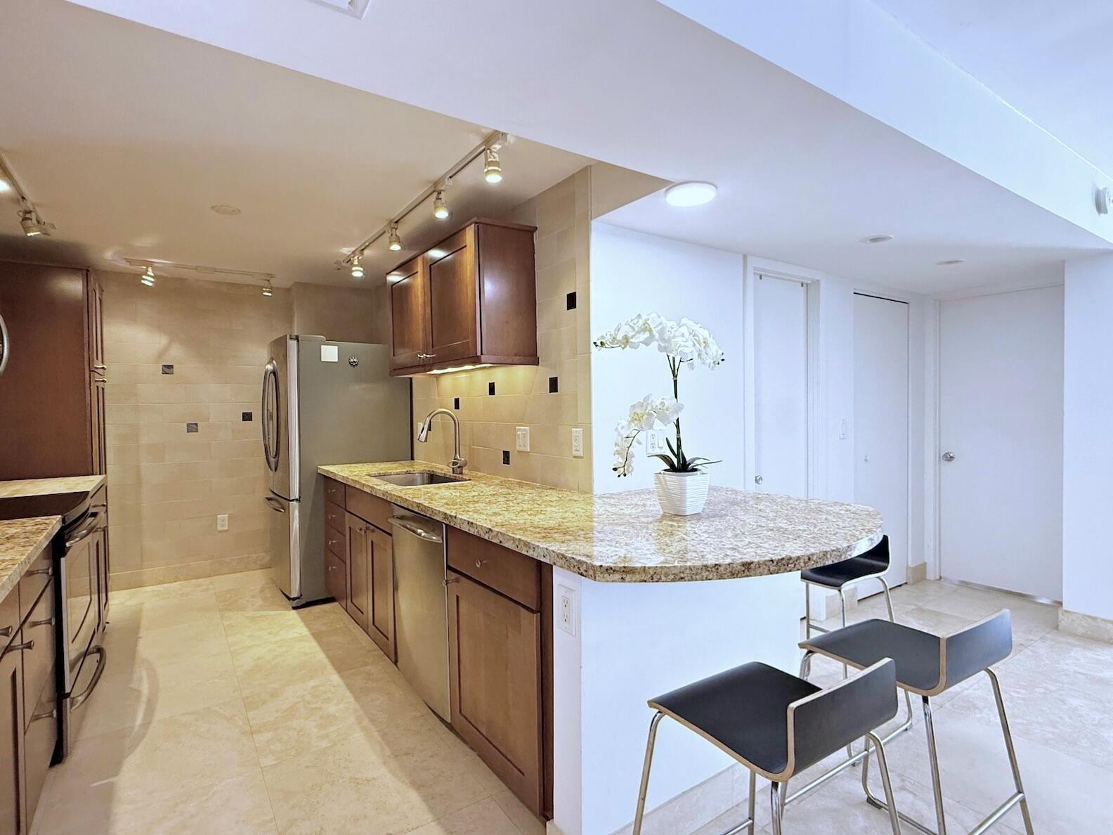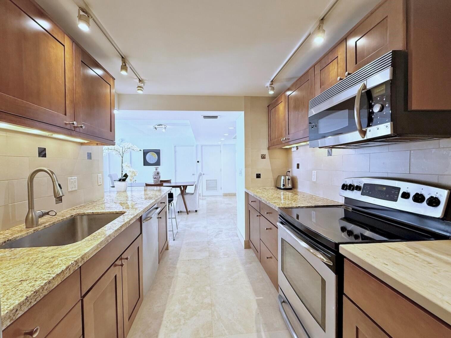 Welcome to The Barclay, where luxury beachside living meets modern elegance. This beautifully designed full 2-bedroom, 2-bathroom condo is a true coastal gem. The open, airy layout is complemented by sleek, modern finishes and travertine floors throughout, creating a seamless blend of style and comfort.Floor-to-ceiling impact glass windows open to your expanded patio, literally just steps away from the pool and tranquil beach. Beautifully renovated kitchen boasts elegant granite countertops and stainless steel appliances, while the bathrooms showcase contemporary upgrades that perfectly merge style with functionality. With the added convenience of an in-unit washer and dryer, this residence provides the ultimate in effortless living. This lanai beach condo offers the ideal combination