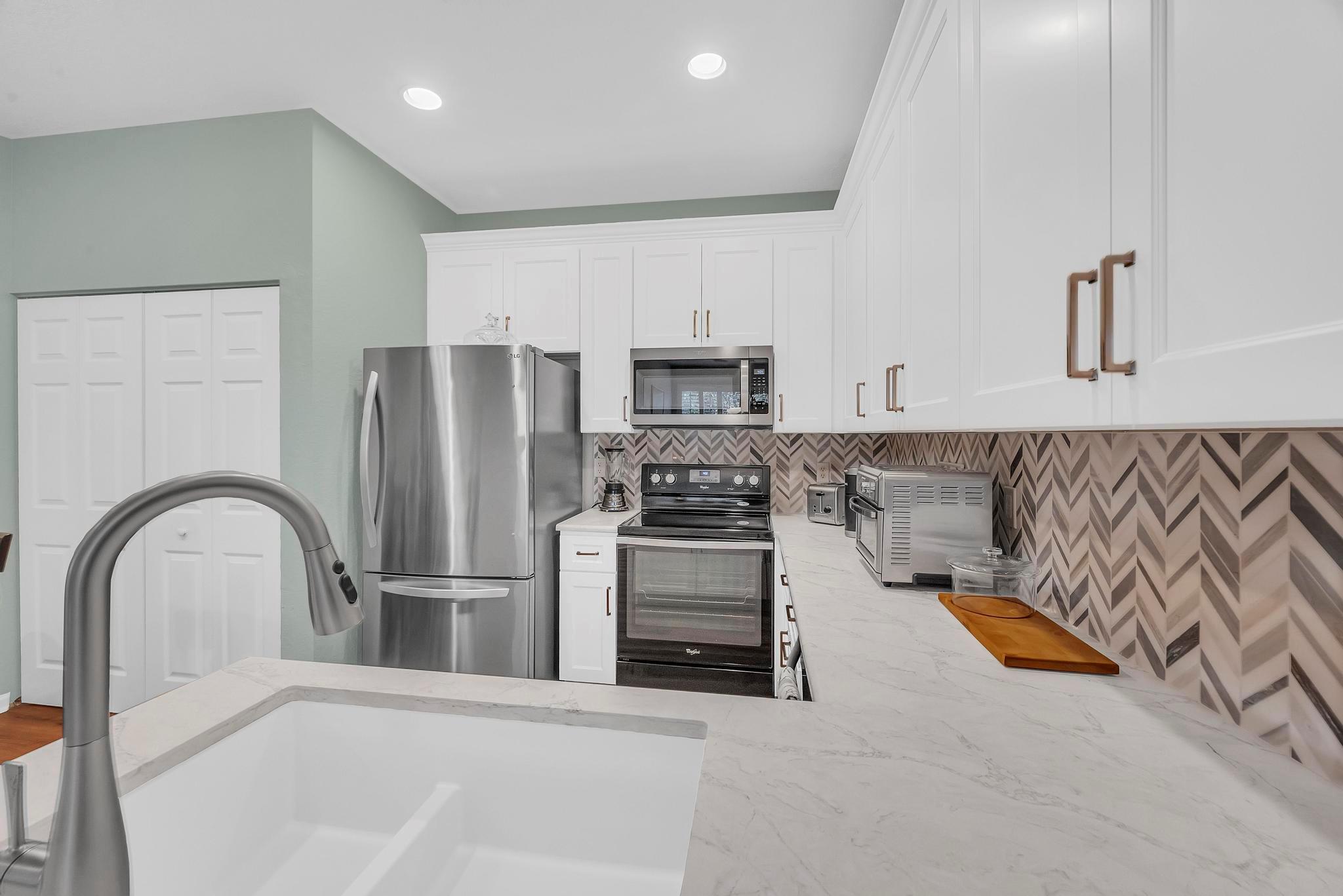 Immaculate 3 Bedroom, 2 Bathroom, 1 Car Garage Villa Nestled in the Gated Community of Bradford Place Overlooking Lake. This Gorgeous End Unit has been Completely Updated to Include New Kitchen with Black & Stainless Appliances with Quartz Countertops, Updated Bathrooms, New Luxury Vinyl Plank Flooring Throughout, IMPACT Windows & Slider, NEW ROOF & Gutters to be Installed in 2025 and Screened Trussed Lanai. The Community Features a Pool is Perfect for Cooling Off or Relaxing. This Unit is being Sold Furnished and Situated in a Desirable Location which is Convenient to Shopping, I-95 and Restaurants. Don't Miss this Opportunity!!