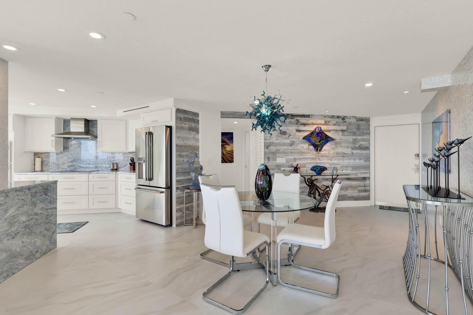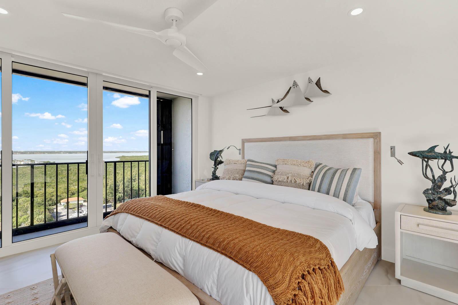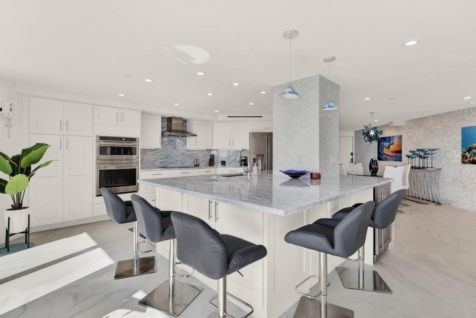 PRINCESS ON HUTCHINSON ISLAND - 2BR/2BA renovated SE end unit. Watch sunrises and sunsets with Ocean and Intracoastal/River views. Features include: renovated in 2024, impact sliders, 36'' ceramic tile, Hunter Douglas electric black out shades, textured ceiling, 6'9'x 8'5' marble center island in kitchen, marble counters in kitchen & bathrooms, shaker-style doors, shaker-style cabinets throughout, 2x4 ceramic tile on walls in bathrooms, Nickel Gap walls, Mother of Pearl tile wall, re-claimed wood planking wall, 3 separate balconies, walk-in closets with custom shelving, full size washer/dryer and so much more! A 3-D Floor plan is in photos. Community amenities include gated, social room with kitchen, billiards, fitness rooms, sauna, pool, tennis, putting green, bocce ball, boat trailer/