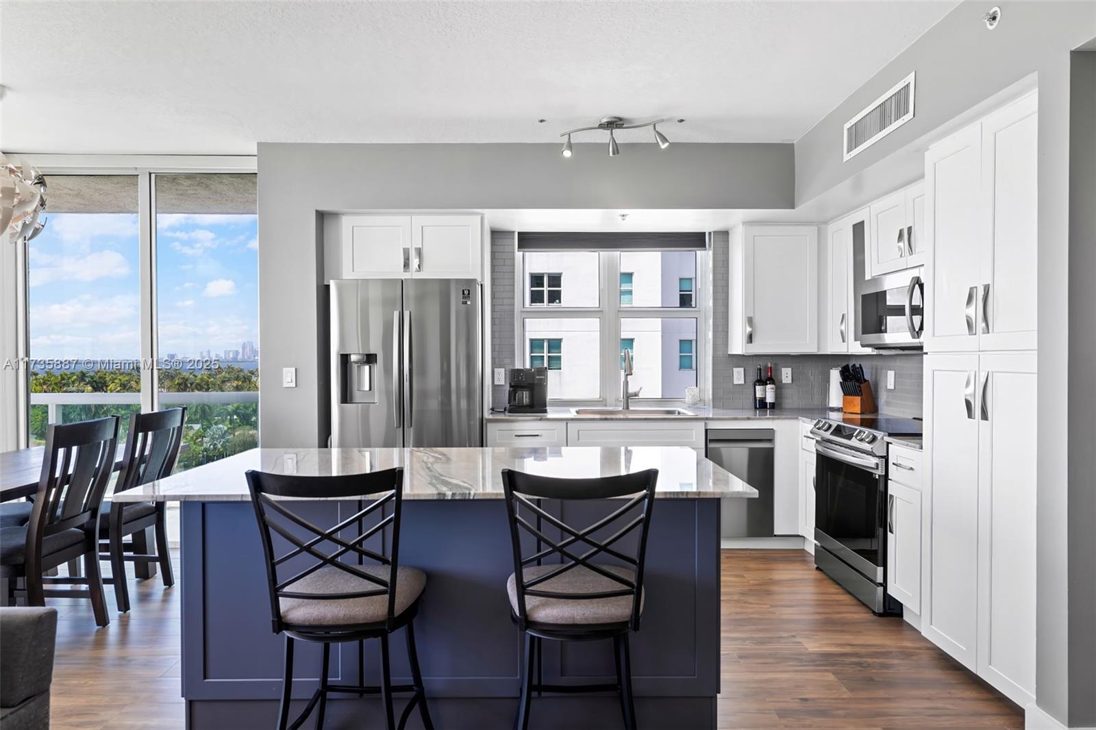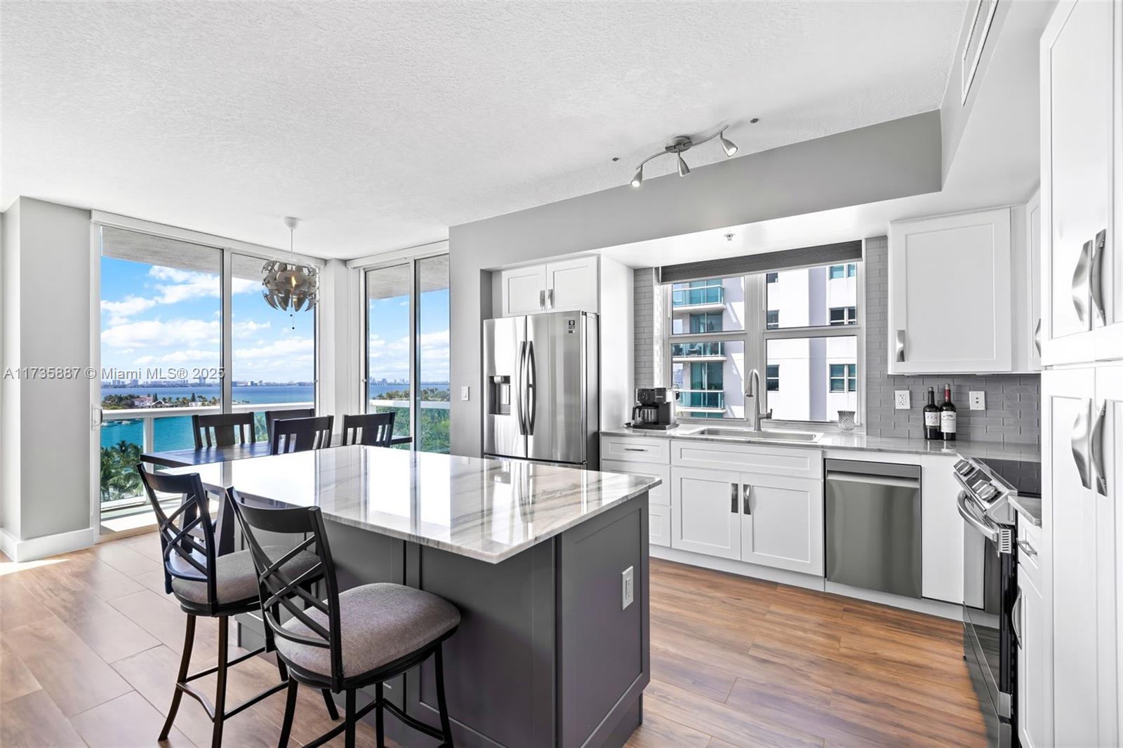 Amazing opportunity to own this Luxurious and spacious corner unit condo in North Bay Village. Recently remodeled building with elegant finishes and breathtaking panoramic views of the Bay. This condo features 2 bedrooms, 2 bathrooms, living-room, Den, dining room, recently remodeled eat-in kitchen with quartzite countertops, new tile floors, walk-in closets, a private wrap-around balcony, 2nd private balcony in the master bedroom and Floor-to-Ceiling Impact windows. This unit comes with a Full-size washer/dryer, Tankless water heater, newer A/C unit, new stainless steel appliances, and 2 covered assigned parking spaces located next to each other. Amenities include two pools, hot tub, gym, free valet parking, boat dock, 24-hour security. Pet-Friendly bldg, near marina and 15 min to beach