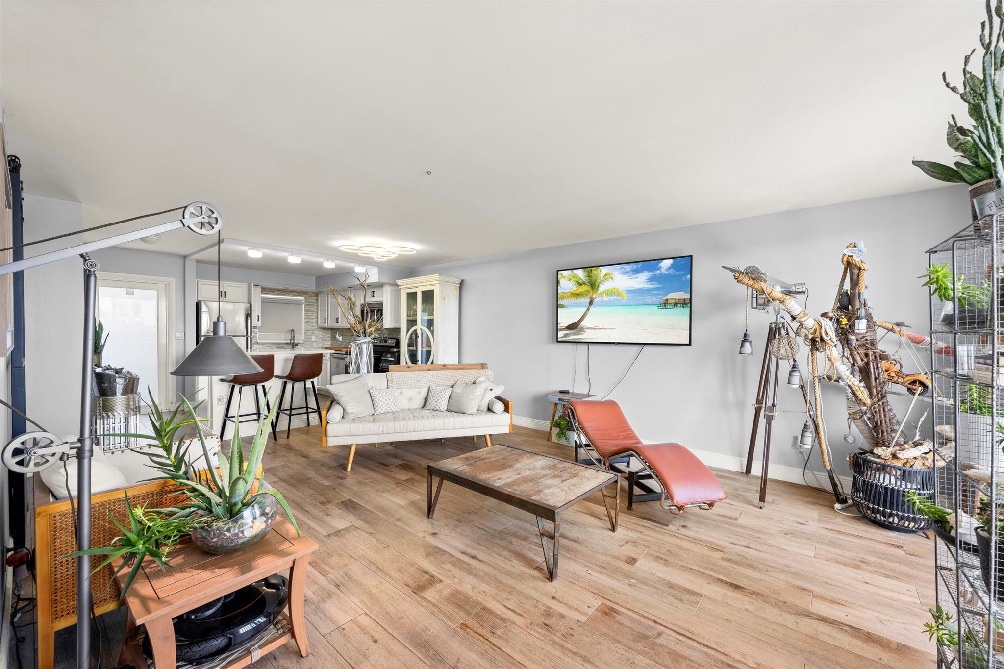 This beautifully remodeled and oasis offers premium finishes throughout. The newly designed open floor plan enhances functionality and maximizes space. Upgrades include newly remodeled Kitchen & bathrooms, along with an updated wiring & electrical panel. All new Window treatments for additional privacy &washer and dryer hookups have been added for your convenience. Relax and soak up the sun at the heated pool, or take a short walk to the beach, local shops, and restaurants. Conveniently located just minutes from I-95 and PBI Airport, this residence offers both luxury and accessibility.Enjoy the day dock for kayaks and jet skis, as well as the security of a gated entry with key-access building entry. The unit also comes with an assigned covered parking spot and ample guest parking