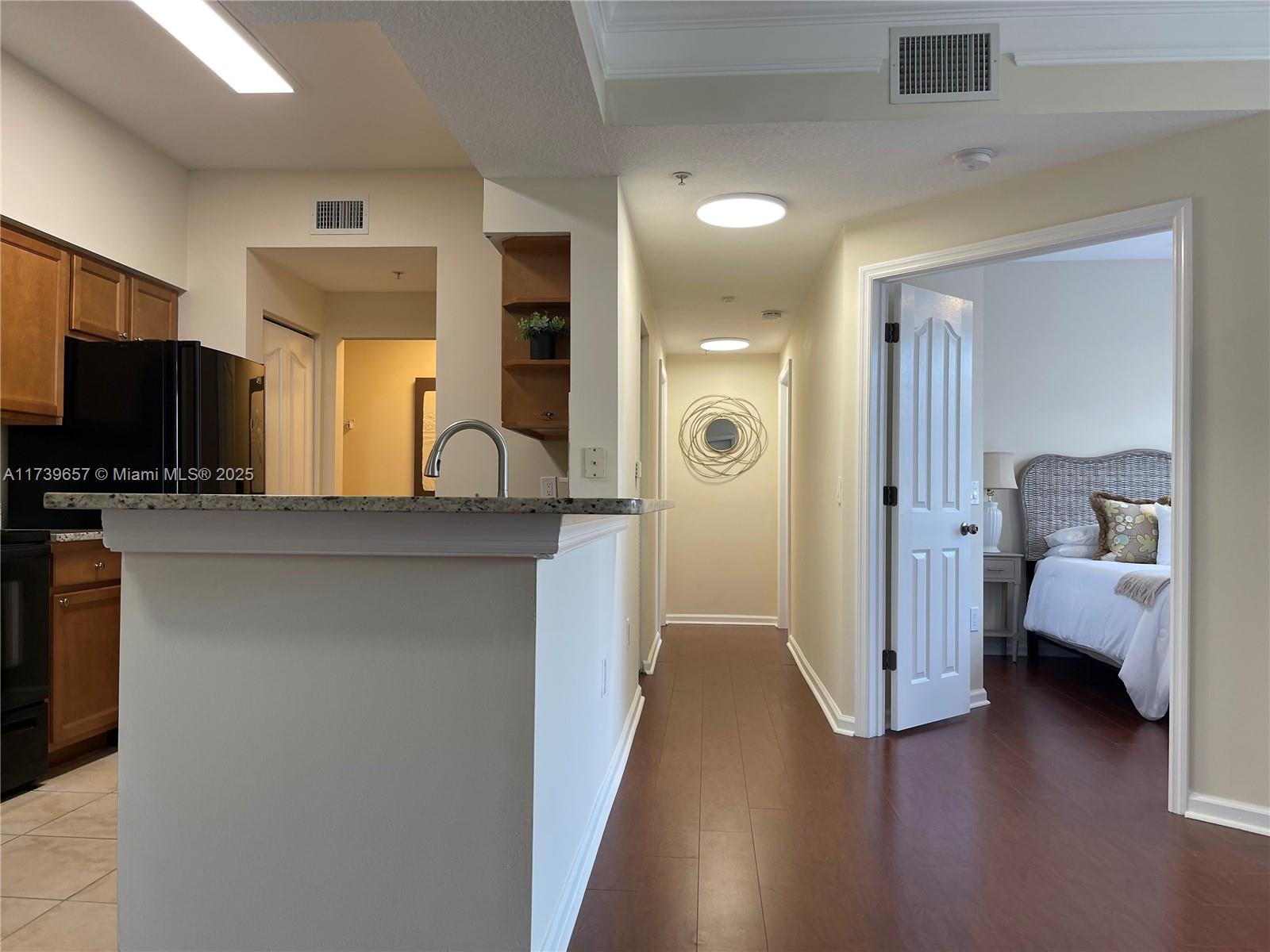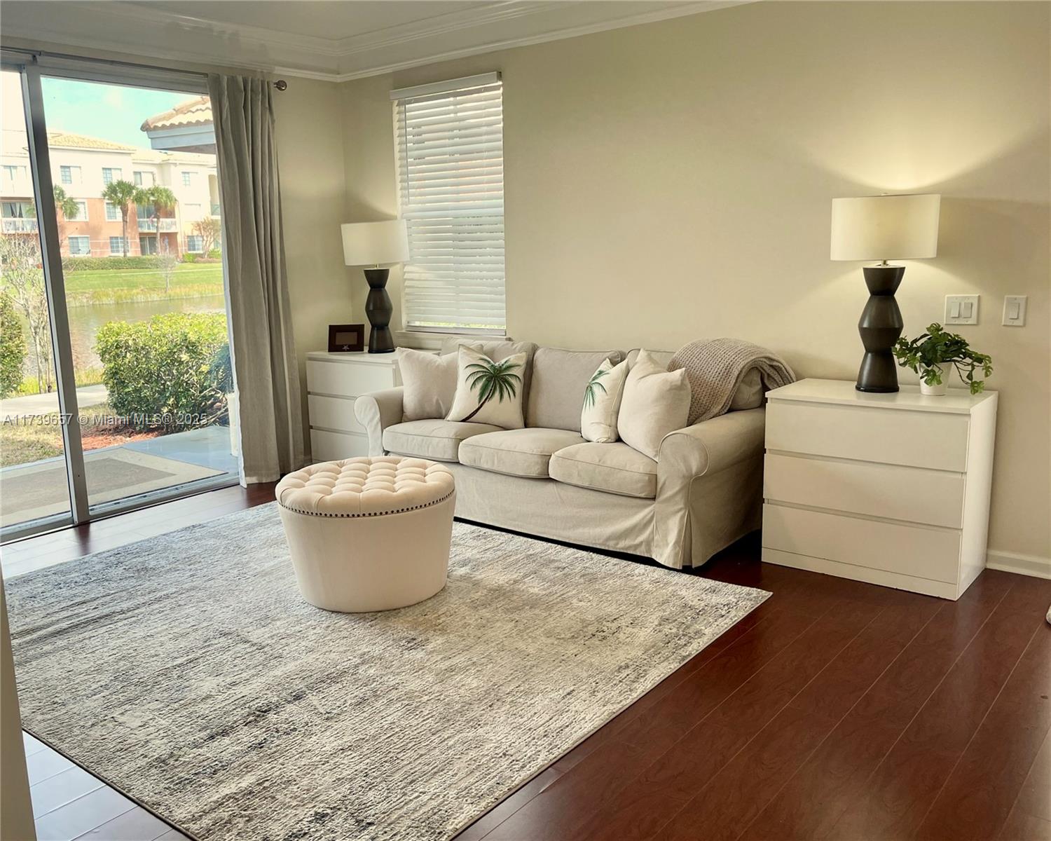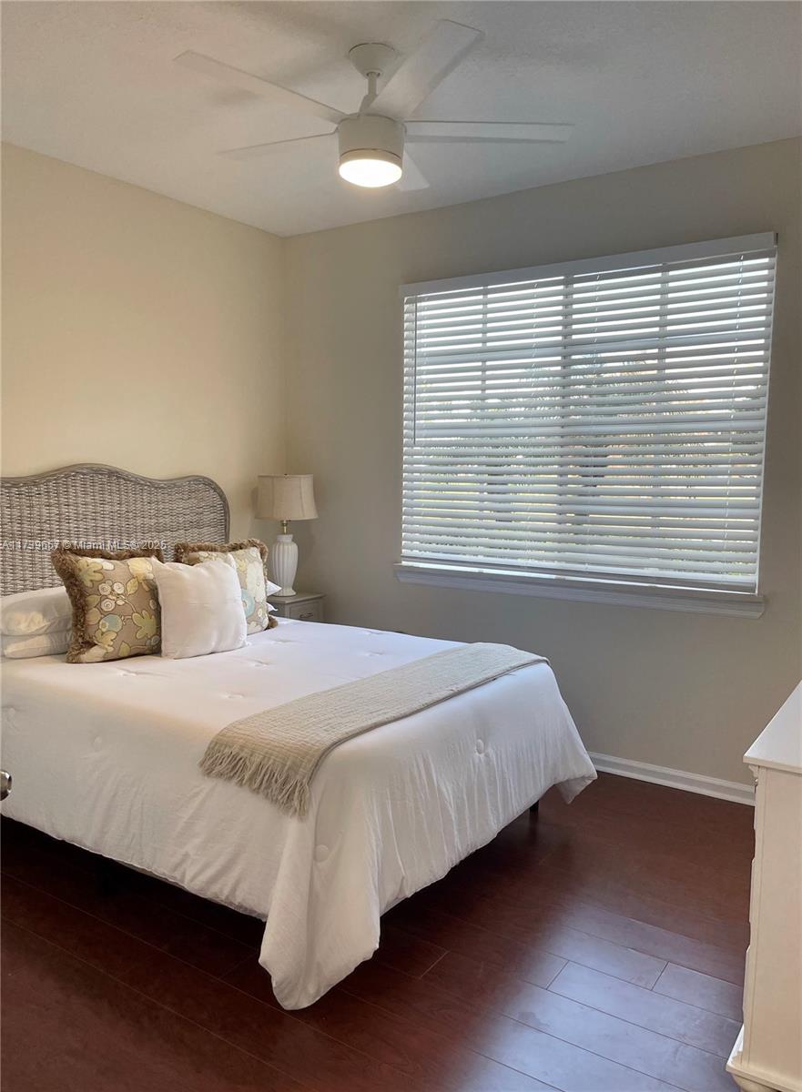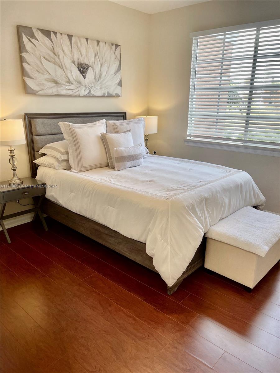 Beautiful lake front ground level 2 bedroom 1 bath in gated resort like community of Fiore at the Gardens. This property offers a unique blend of both comfort and style with an abundance of amenities. Kitchen is complete with granite counters, new faucet and tons of storage/cabinets. The laundry accommodates full size washer/dryer. Just a few of the upgraded features are new hot water heater, A/C is 4 years old, all new lighting, fans, blinds and quartz window sills. New bathroom vanity, fixtures and LED mirror. Freshly painted throughout including ceilings and trim. Installed hurricane rated front door. Can be purchased furnished.