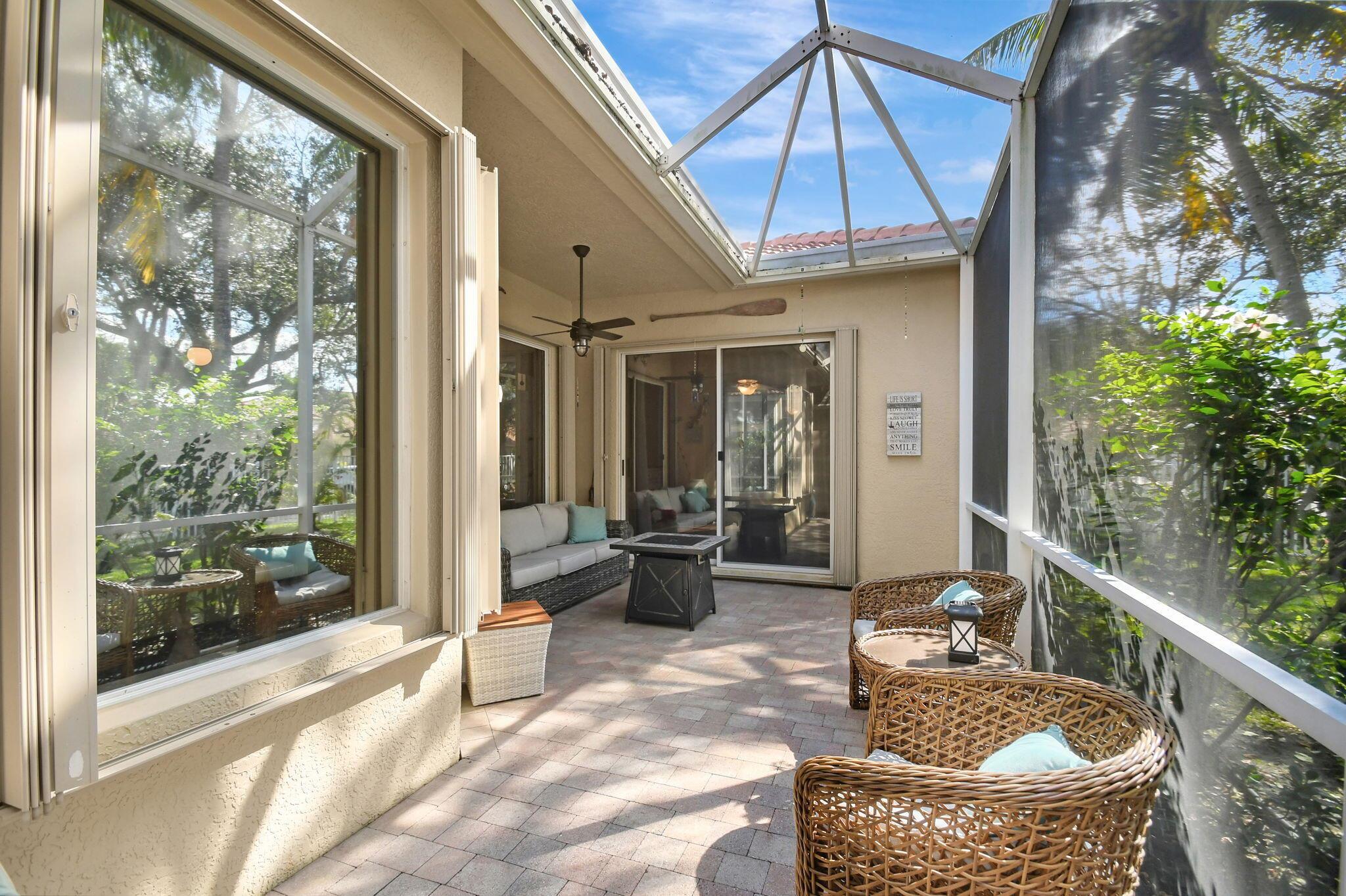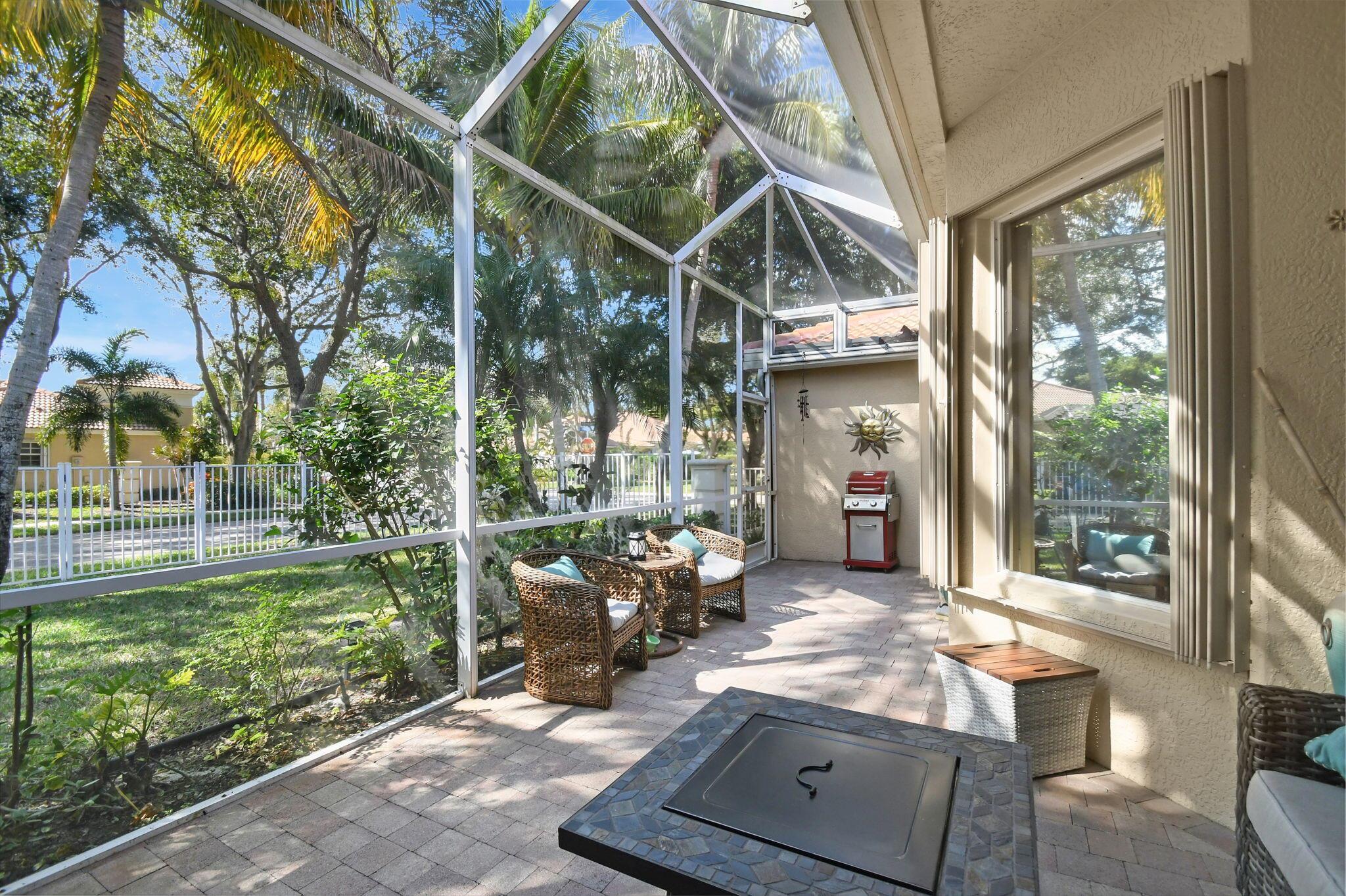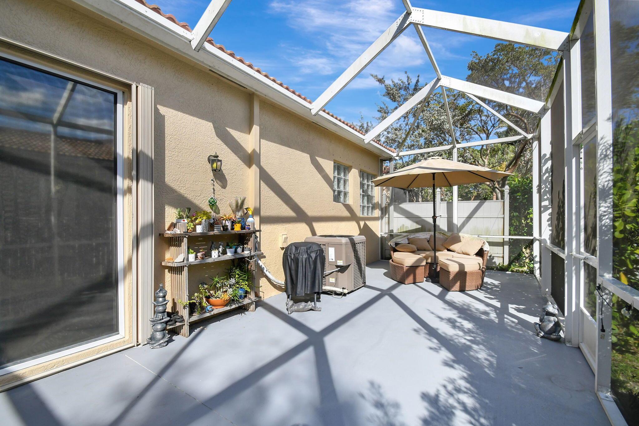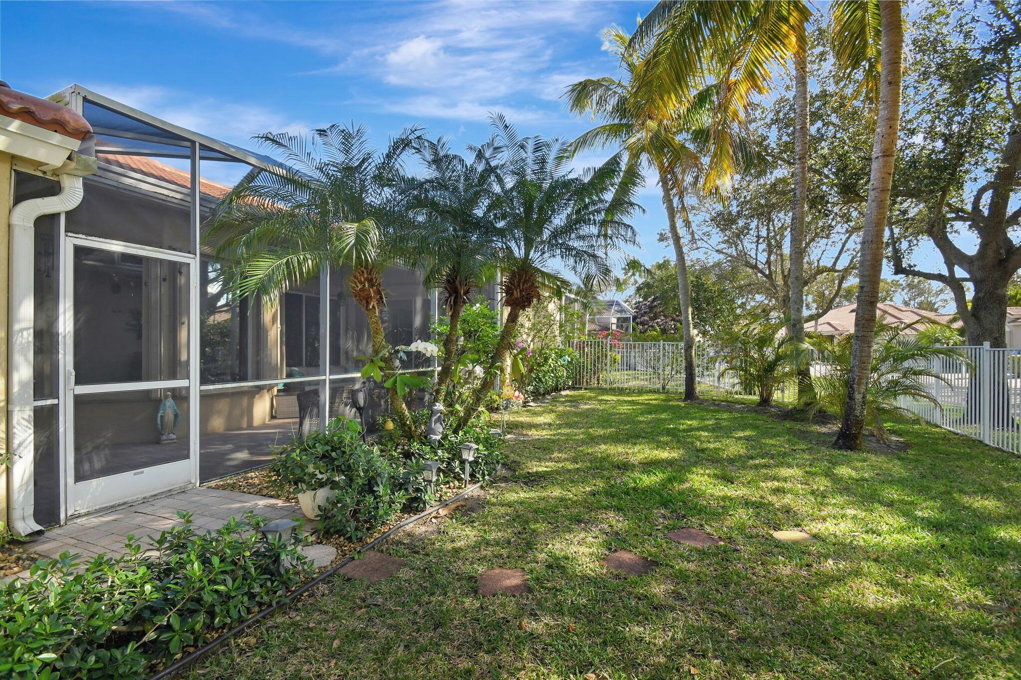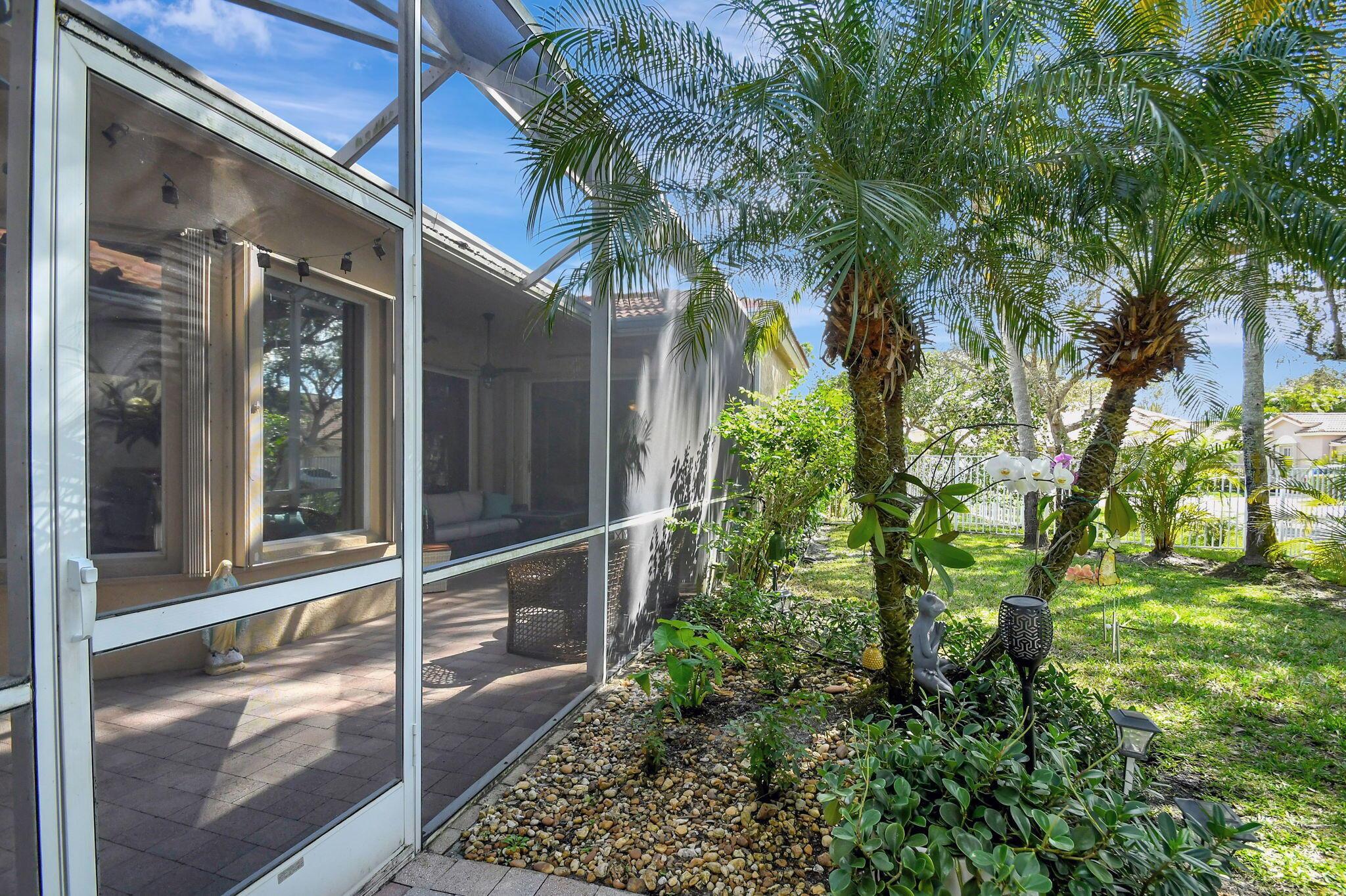 Beautifully maintained and loved home, pride in ownership here! Light and bright with many great features! 2 screen enclosed patios for additional living space, great for entertaining , relaxing and enjoying. High vaulted ceilings with sky light and recessed lighting. Water filtration system. High-end LG washer & dryer. Newer roof and AC. Accordion shutters. Large spacious en suite off primary bedroom that boasts a huge walk in closet. Nice corner fenced in lot, with beautiful mature trees and plants. Brick paver driveway. HOA includes basic cable, alarm system, WIFI, internet, lawn maintenance and a resort style clubhouse with lots of amenities and activities all within close walking distance from the house. Close to so many restaurants, shops, PBI, turnpike and beach less than 10 miles!