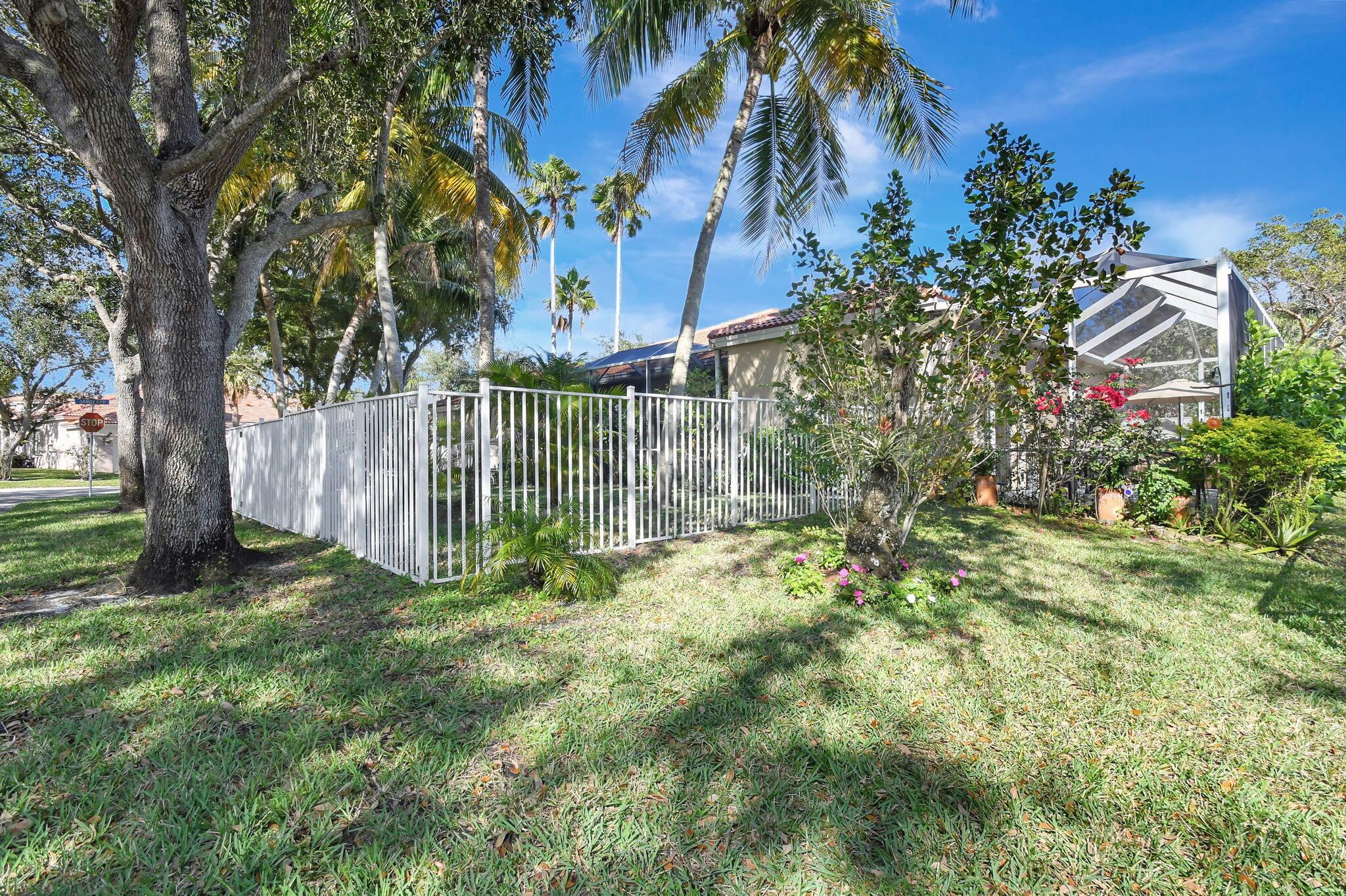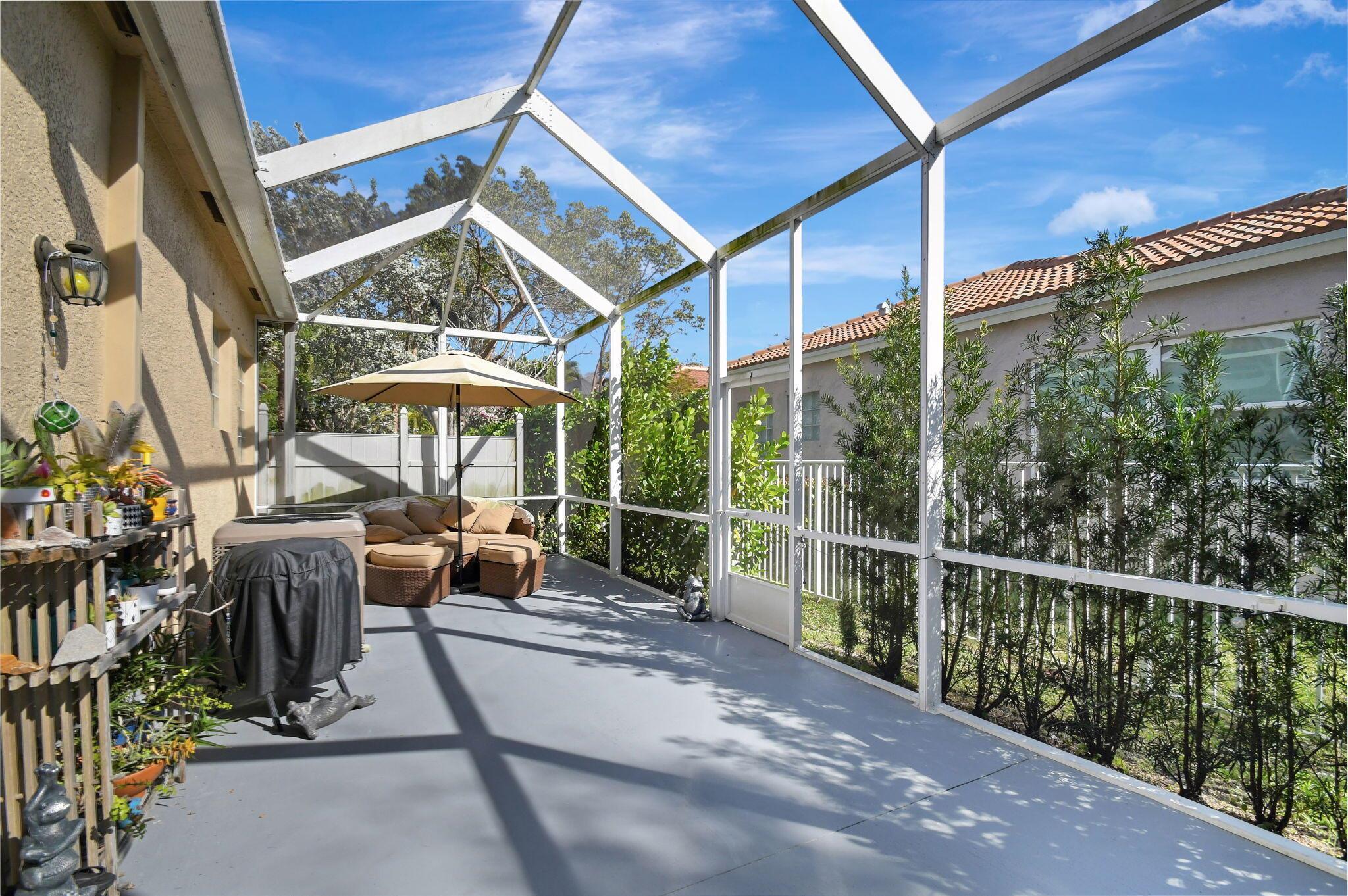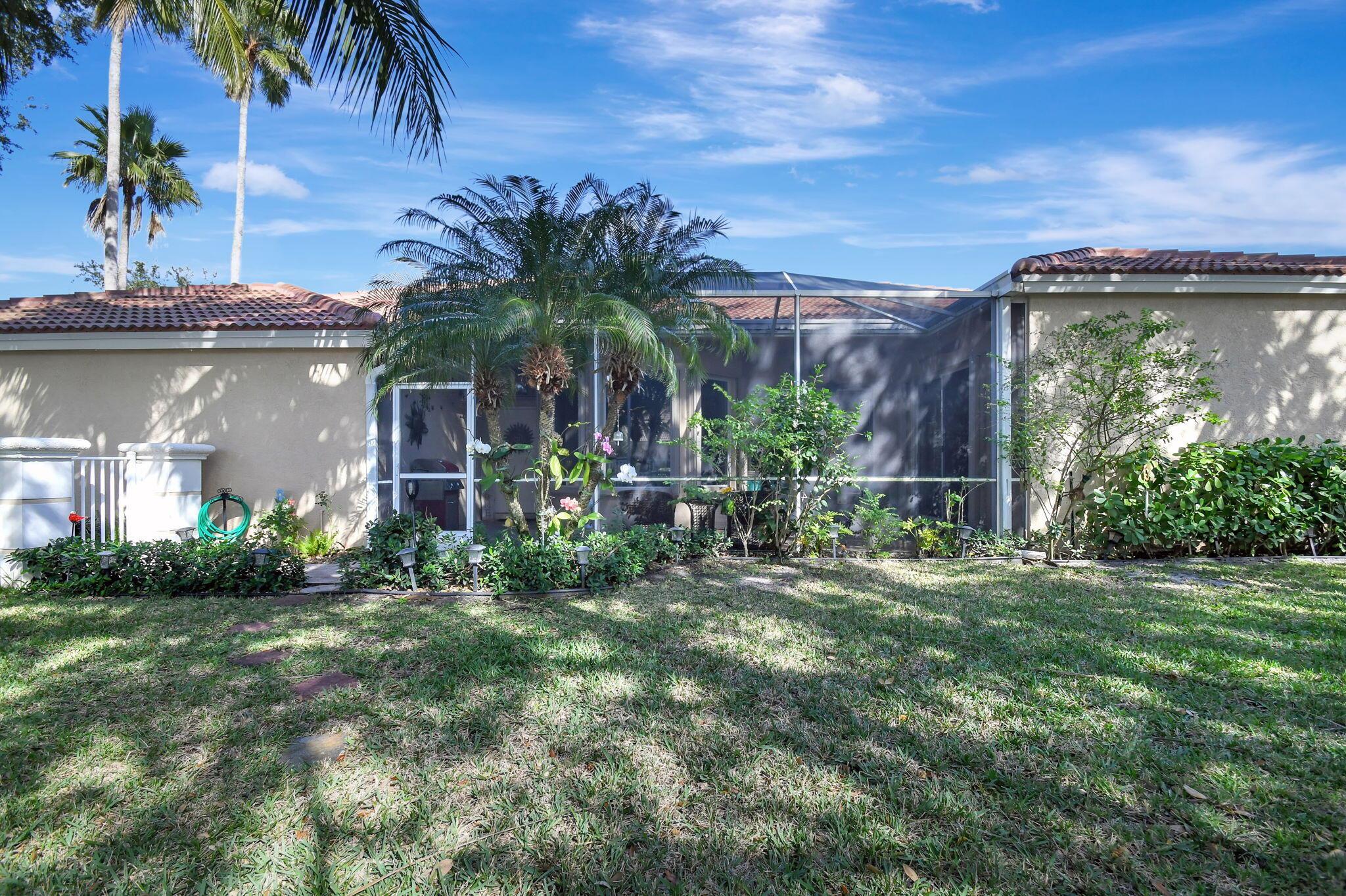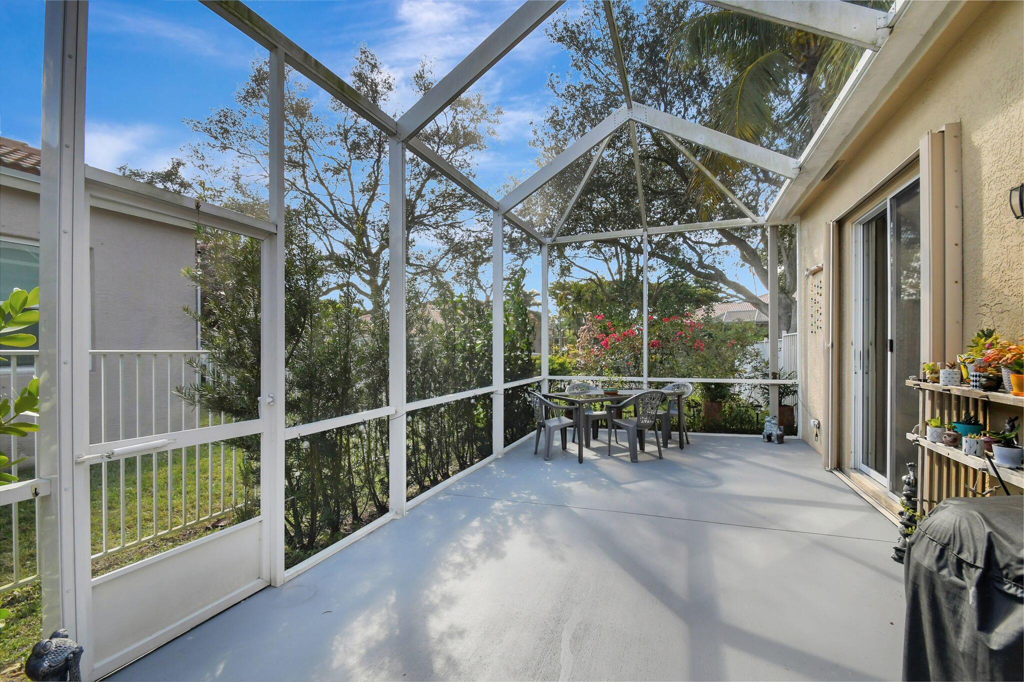 Beautifully maintained and loved home, pride in ownership here! Light and bright with many great features! 2 screen enclosed patios for additional living space, great for entertaining , relaxing and enjoying. High vaulted ceilings with sky light and recessed lighting. Water filtration system. High-end LG washer & dryer. Newer roof and AC. Accordion shutters. Large spacious en suite off primary bedroom that boasts a huge walk in closet. Nice corner fenced in lot, with beautiful mature trees and plants. Brick paver driveway. HOA includes basic cable, alarm system, WIFI, internet, lawn maintenance and a resort style clubhouse with lots of amenities and activities all within close walking distance from the house. Close to so many restaurants, shops, PBI, turnpike and beach less than 10 miles!