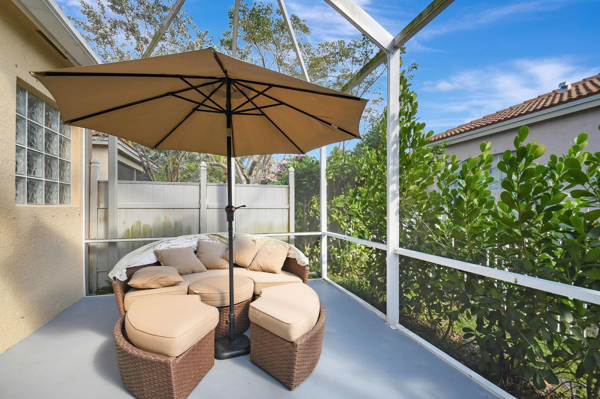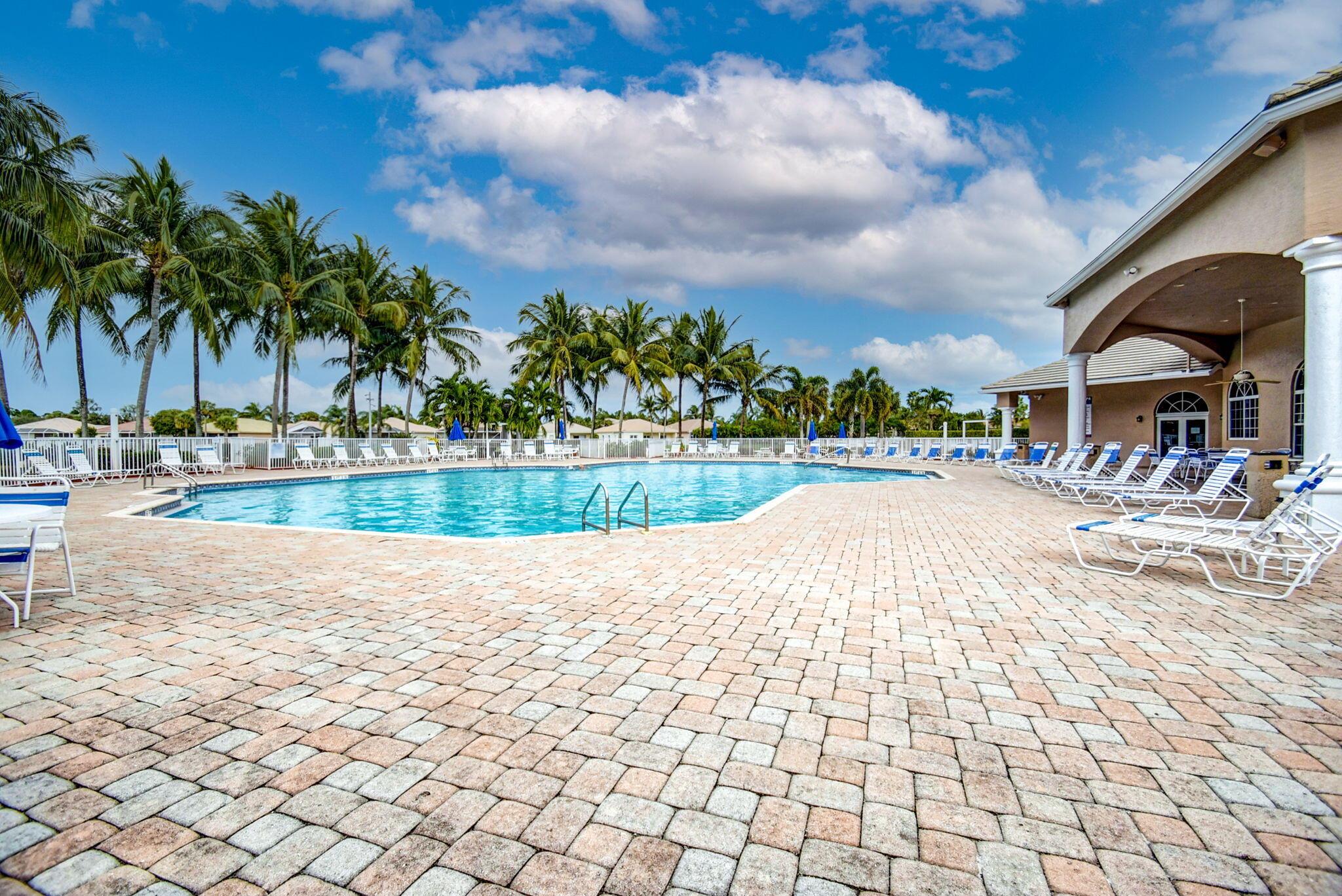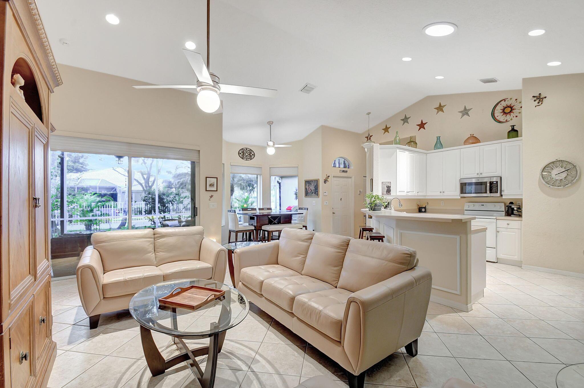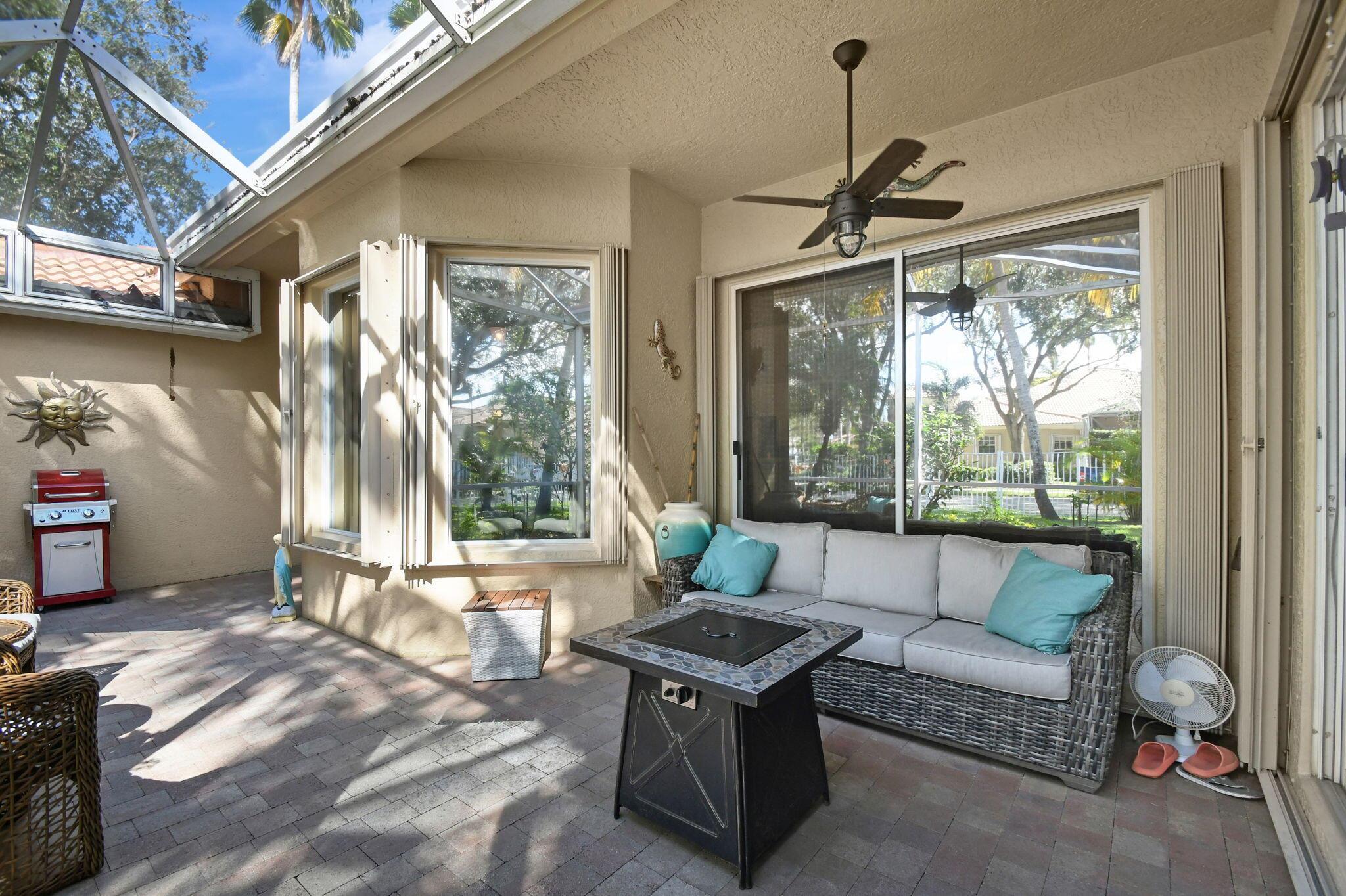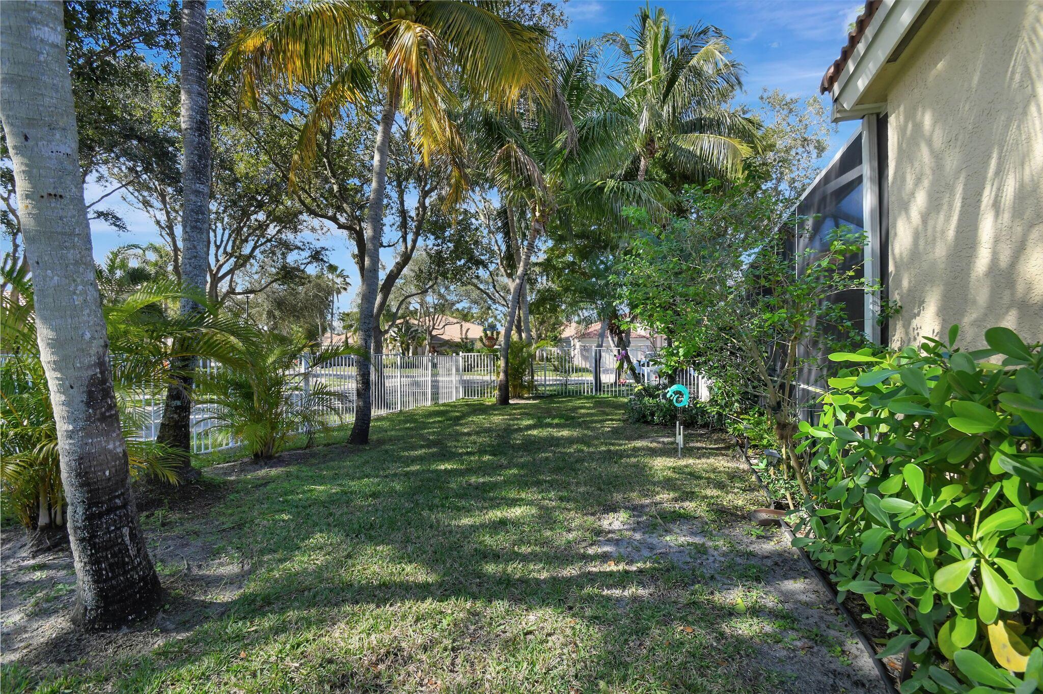 Beautifully maintained and loved home, pride in ownership here! Light and bright with many great features! 2 screen enclosed patios for additional living space, great for entertaining , relaxing and enjoying. High vaulted ceilings with sky light and recessed lighting. Water filtration system. High-end LG washer & dryer. Newer roof and AC. Accordion shutters. Large spacious en suite off primary bedroom that boasts a huge walk in closet. Nice corner fenced in lot, with beautiful mature trees and plants. Brick paver driveway. HOA includes basic cable, alarm system, WIFI, internet, lawn maintenance and a resort style clubhouse with lots of amenities and activities all within close walking distance from the house. Close to so many restaurants, shops, PBI, turnpike and beach less than 10 miles!