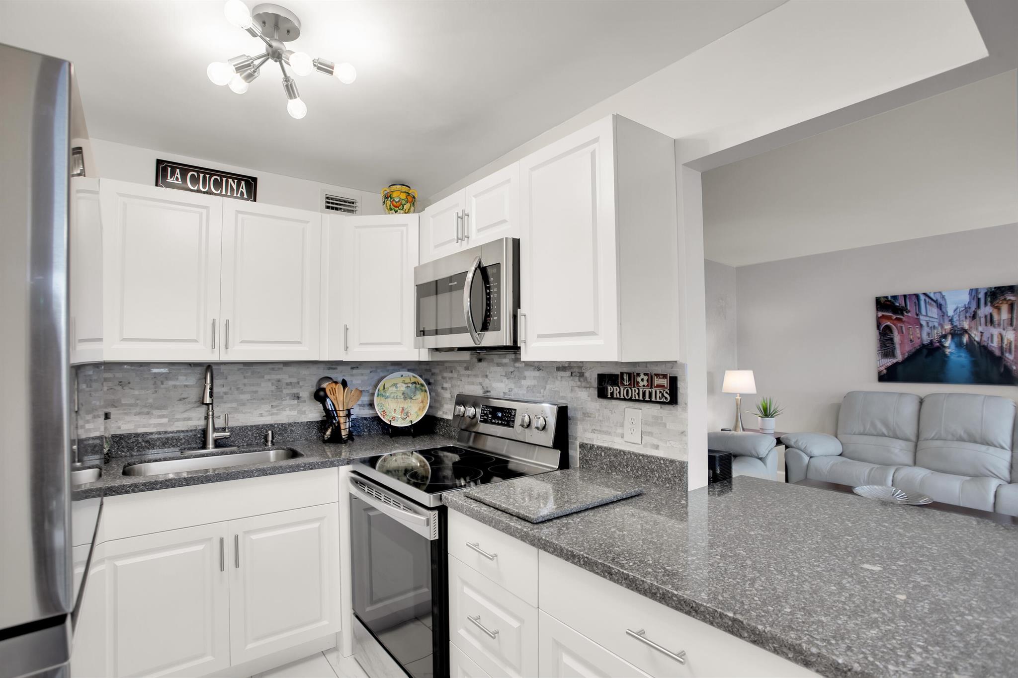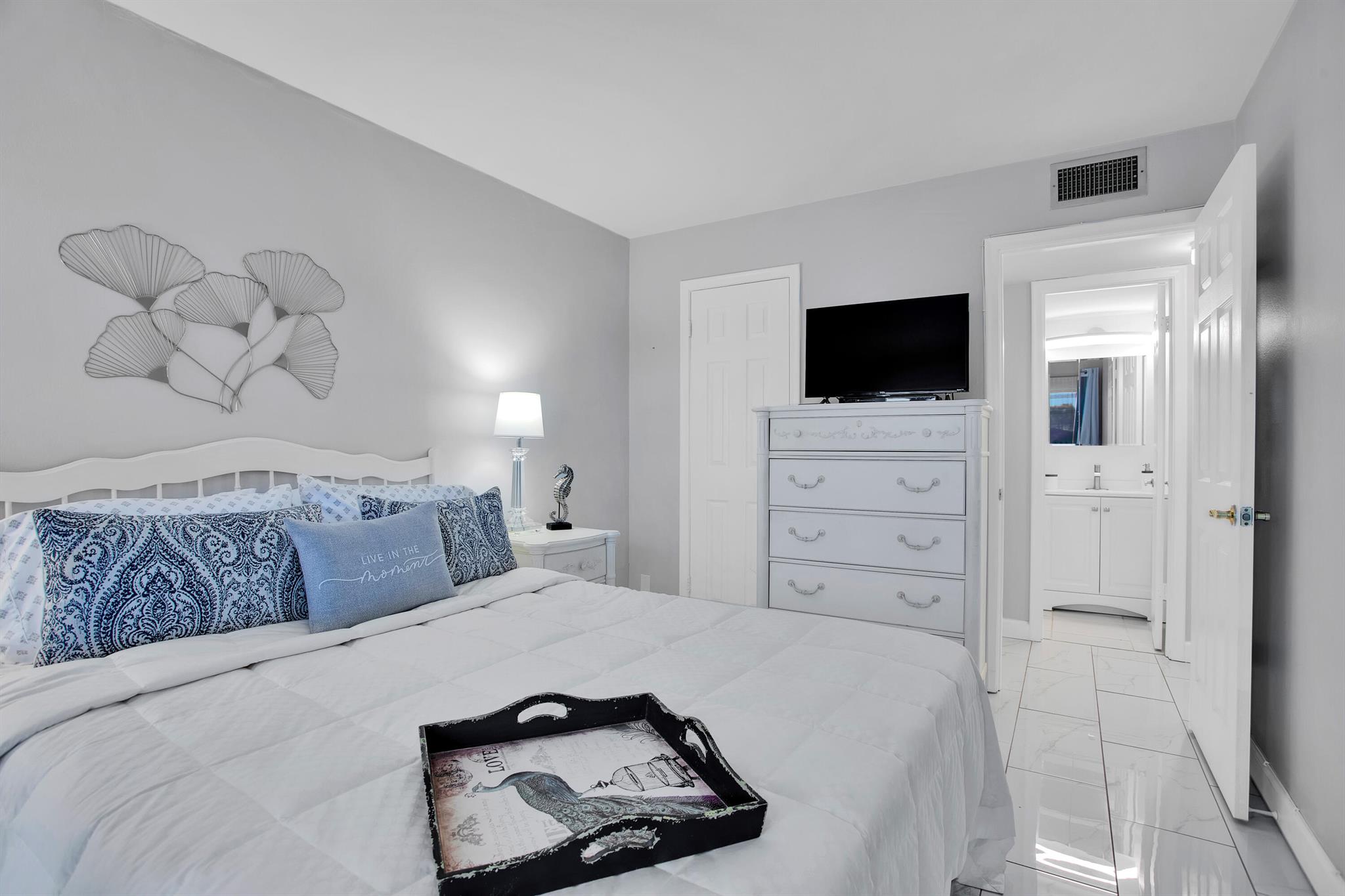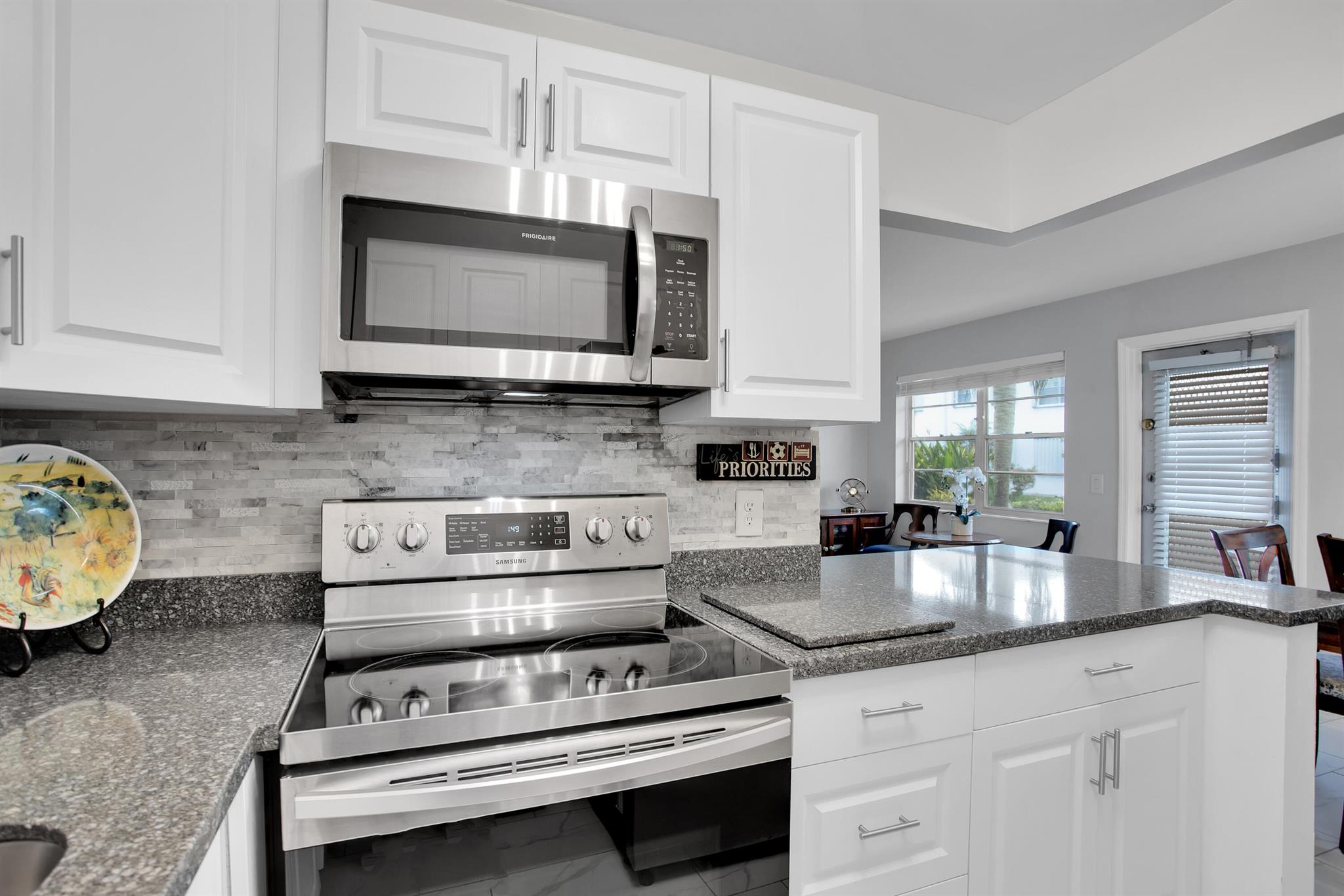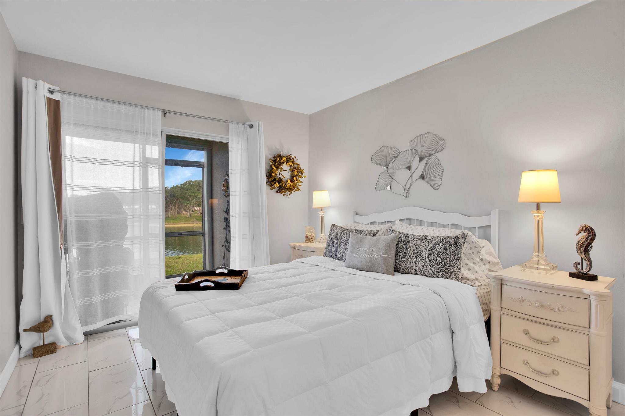 Boasting an unparalleled northwestern exposure, this 2-bedroom, 2-bathroom home features a spacious master bedroom with ample closet space and a stunning lake view. Two beautifully updated bathrooms, with large showers in both, provide ultimate relaxation. Entertain guests effortlessly as you flow seamlessly from an open-concept kitchen with stainless steel appliances, custom cabinetry, and natural stone countertops to a dining area into open living quarters, while enjoying your morning beverage on your screened patio overlooking a stunning lake view. Interior amenities include abundant patio storage and utmost convenience. Fall in love with the soothing Venetian plaster accent walls, smooth ceiling throughout, updated (cont')