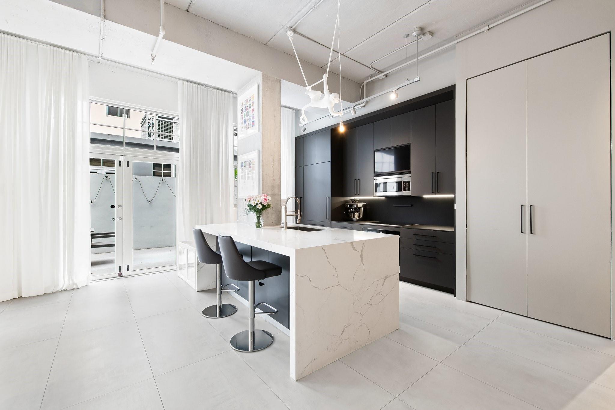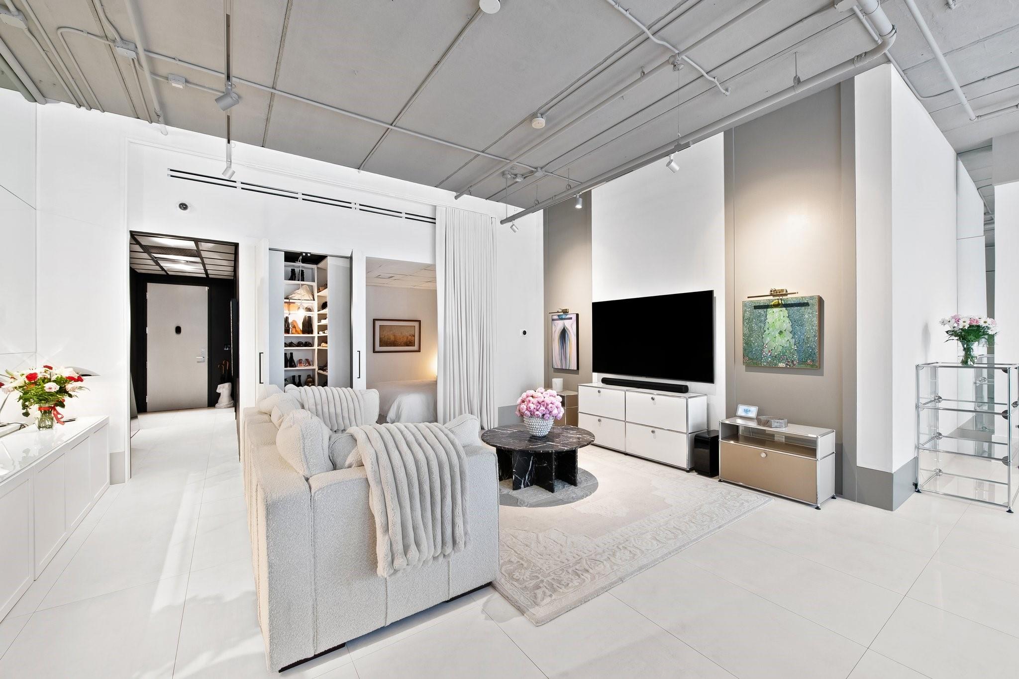 Modern luxury at Avenue Lofts in Flagler Village. This remodeled 1-bedroom loft features an oversized terrace, 12’ ceilings, and high-end designer finishes. The custom kitchen offers solid wood cabinets, quartz waterfall island, built-in TV, and Fisher & Paykel appliances. Spa-style bath with Kohler and Moen fixtures. Enjoy large porcelain tile floors, impact windows, in-unit washer/dryer, and custom cabinetry for ample storage. Unique lighting adds modern charm. Pet-friendly building with rooftop gym and pool. Prime location just 1/4 mile from Brightline and minutes to Las Olas. (Drapery not included.)