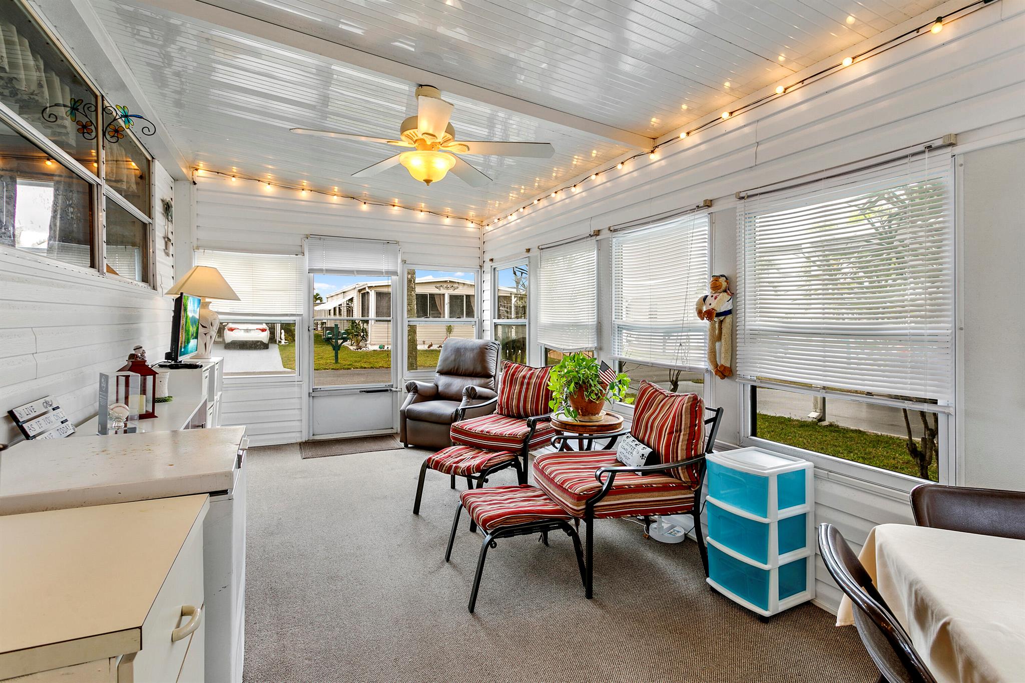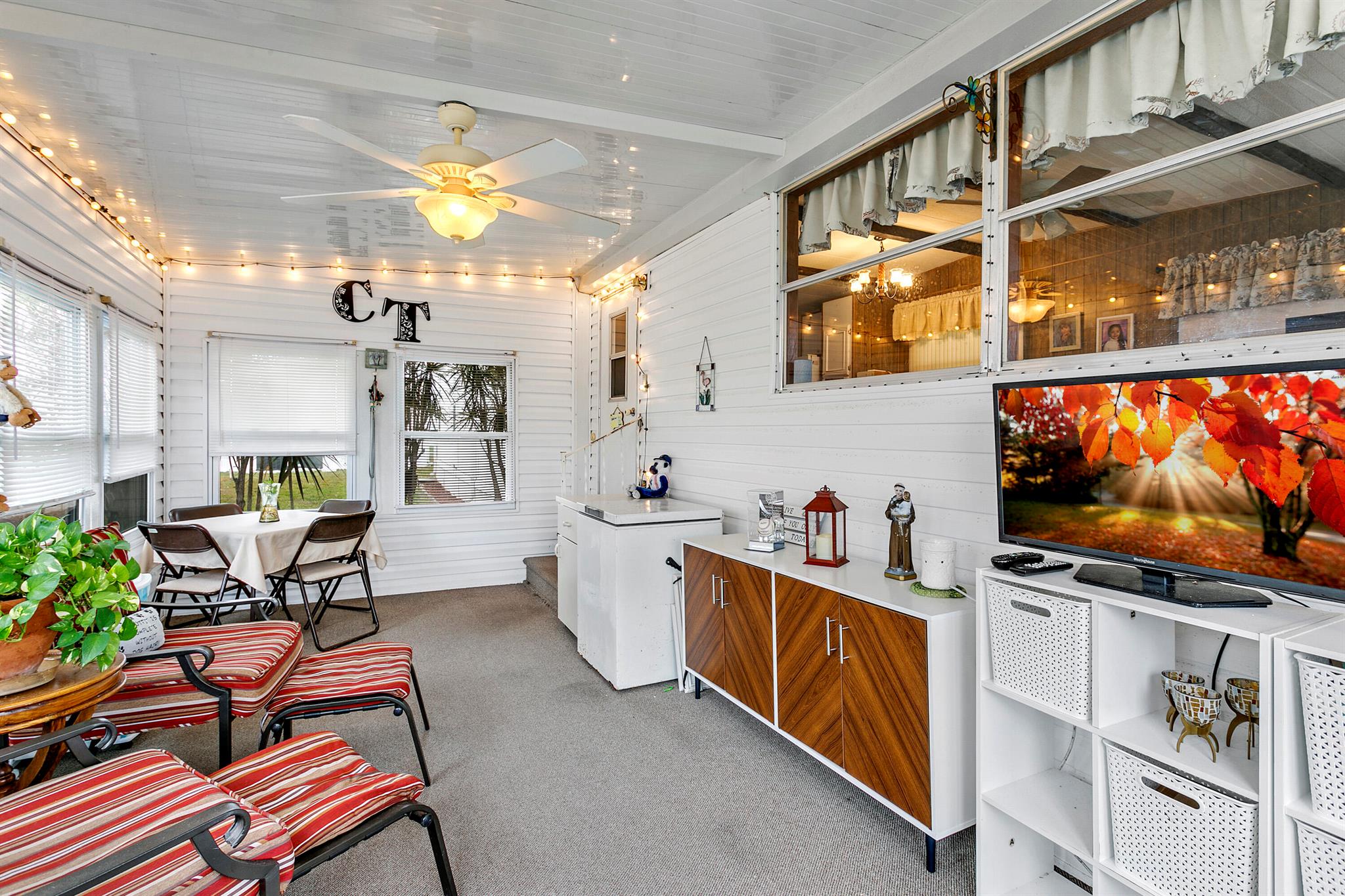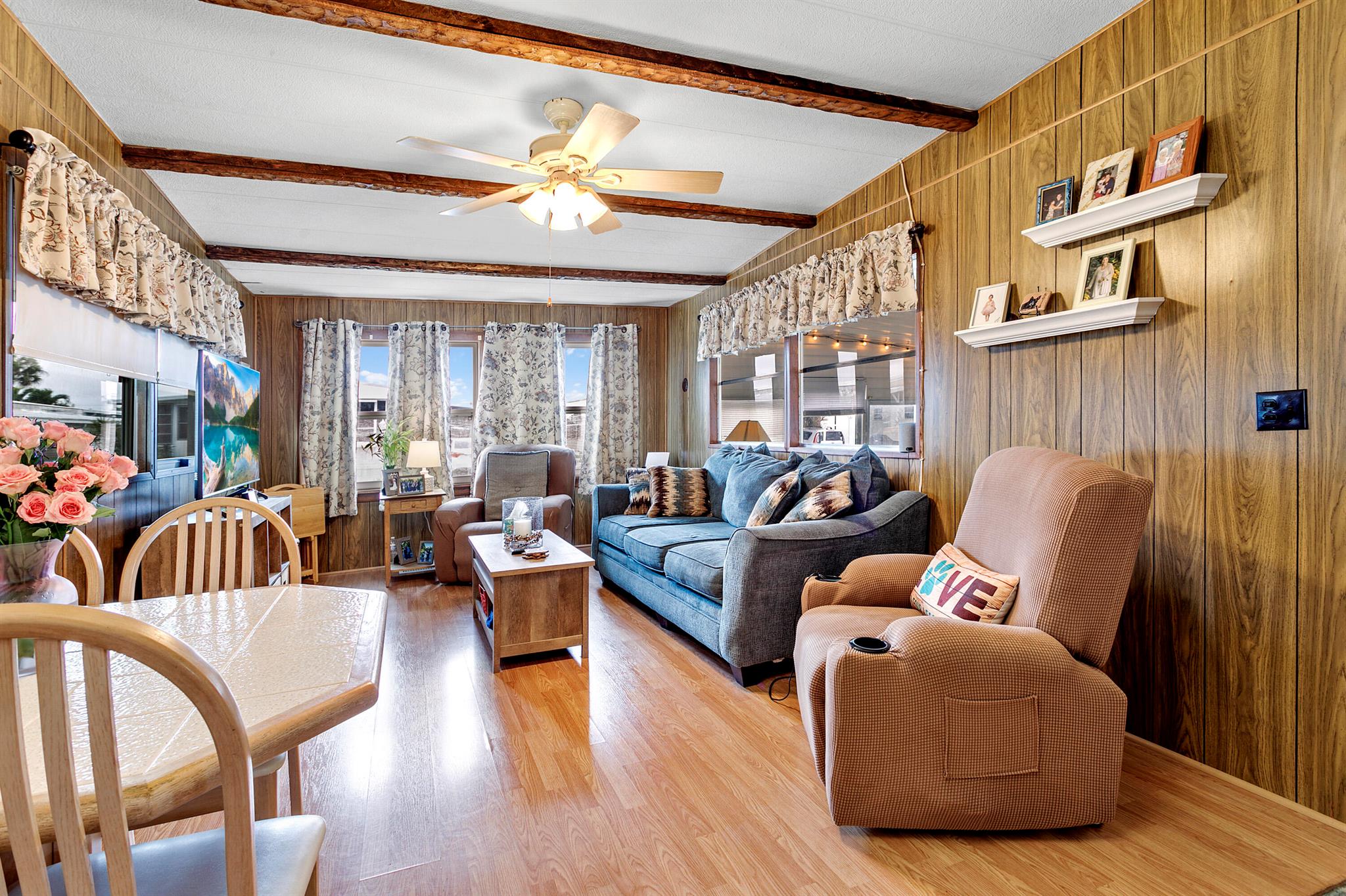 Cute 2 Bedroom 1 Bathroom Home in desirable 55+ Community. Manned Gated Community with plenty of activities. Enjoy Shuffleboard, Heated Pools, Bingo, Cards, Dances, Pot Luck Dinners, Game Nights and so much more. This home has laminate Flooring throughout, Vaulted Ceiling in the Living Room with Decorative Beams, Newer Windows, Kitchen with breakfast bar. Enjoy your spacious Florida Room for additional living space. 2nd bedroom perfect for guest room or office. Main Bedroom has entrance to Bathroom. Bathroom has Step Shower. Ramp has been installed for side entrance. Also a Shed for even more storage. This is a great Snowbird getaway or a home for someone looking to downsize and start traveling. Easy to Maintain and great location within the park. Community is located close