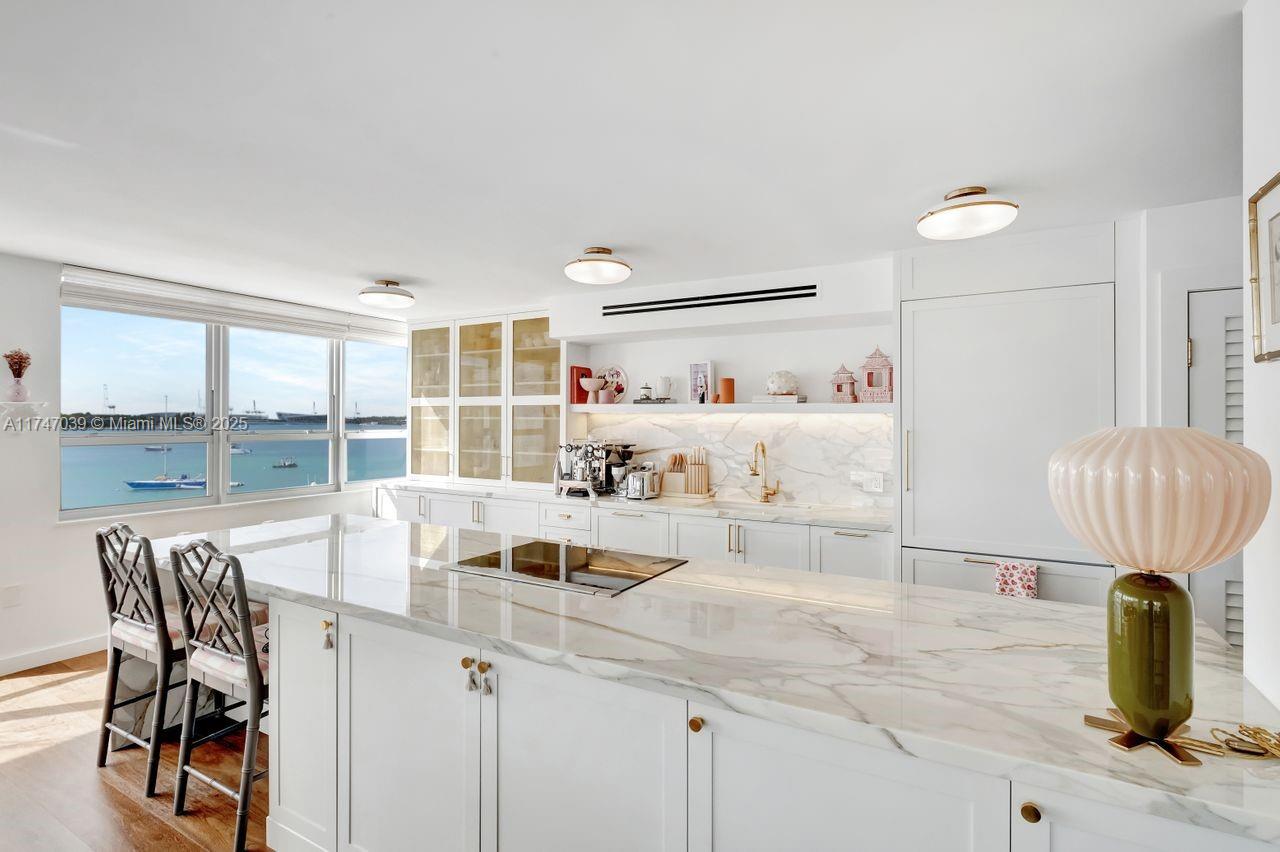 Feel like you’re sailing away from this sunny, large corner unit with breathtaking views of the bay, marina, and cruise ships. This sought-after 02 line offers water views from every room. Exquisite-Professionally Designed in 2021 with top-quality materials, including an Allied Kitchen with Calacatta Gold marble from Opustone, featuring a waterfall countertop and matching backsplash. Bathrooms are equally luxurious with Waterworks faucets, Brazilian oak wood floors, new impact windows, electric shades, and a brand-new A/C. The building offers: valet, 24/7 front desk, gym, EV charging stations, floating dock for kayaking and paddleboarding, BBQ area, and more. Prime location across from The Standard Hotel and steps from Lincoln Road, top restaurants, the beach, and more.