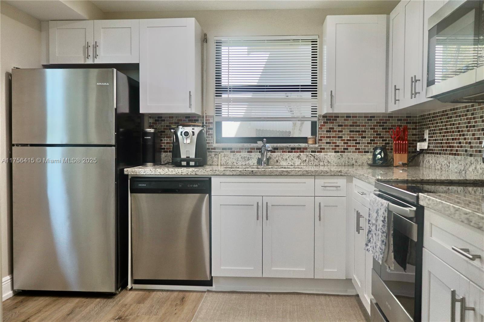 Beautifully updated fully furnished 2BR/2BA condo just 10 minutes from the beach! This move-in-ready home features new flooring, impact windows & doors and an updated kitchen with white shaker cabinets, granite countertops, and stainless-steel appliances. The primary suite offers a modern en-suite bath with a glass-enclosed walk-in shower. Enjoy serene green space views from the screened-in patio. In-unit washer/dryer, community pool, and lush landscaping. Price includes furniture! Close to shopping, dining, and major highways. Prime location—don’t miss this one! Drop ceiling recently removed from the kitchen and popcorn ceilings smoothed out. 30 year inspection complete and no current assessments. No rentals for first 2 years.
